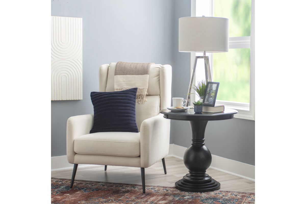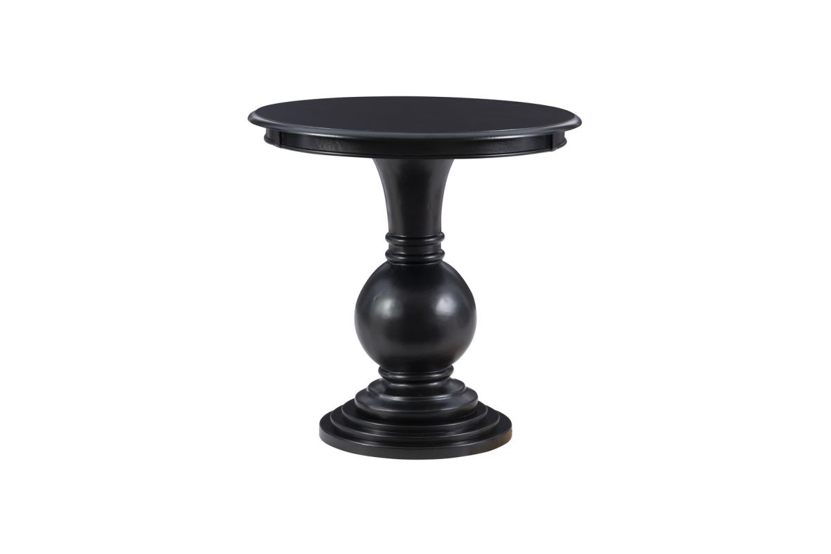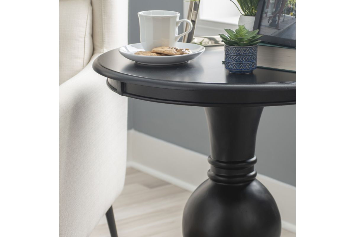 This circular accent table features a stepped base and turned pedestal that come together to create a timeless and sophisticated piece. Measuring at 26" l x 26" d x 26" h, it is a bit oversized and ideal for placement next to a couch or set of chairs in your living room, as an extra surface in your bathroom or as additional table space wherever you like to entertain. The jet black painted finish pops against a variety of color schemes but can also offer a blending effect when paired with the right accents. Simple assembly is required upon arrival.