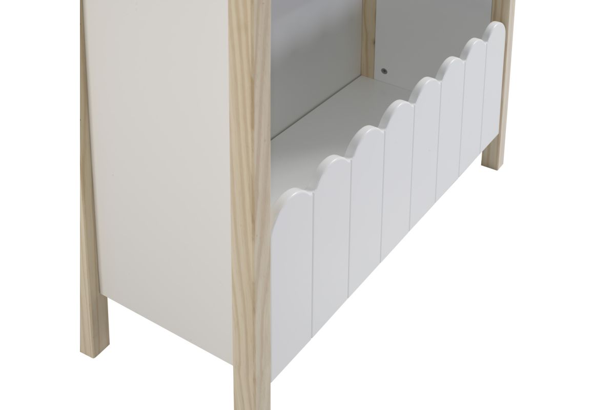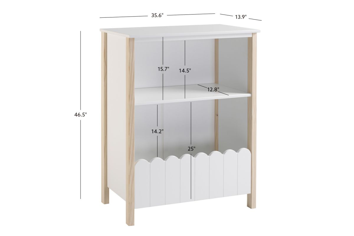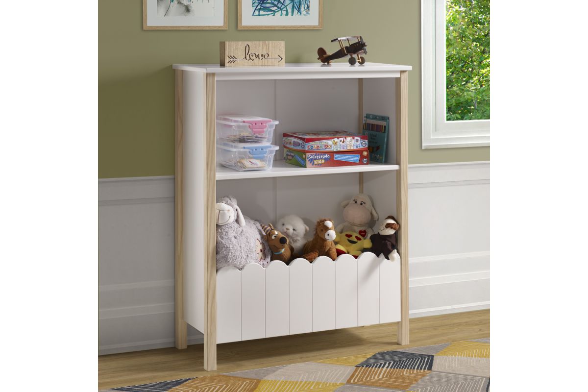 Keeping your little one�s play space organized is a breeze with this bookcase. A fun and functional farmhouse look will encourage your child to keep their space tidy. Two upper shelves and a lower bin accented with a fence design are perfectly sized to fit all your child�s books, stuffed animals and toys. The combination of a white finish with natural pine wood accents will combine well with any d�cor. Solidly constructed square peg legs provide support on any flat surface.