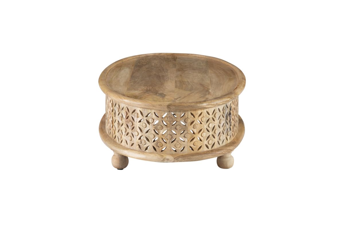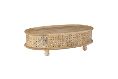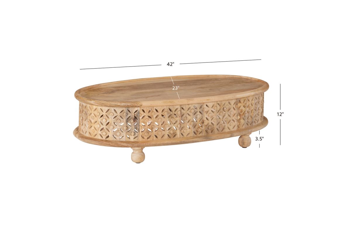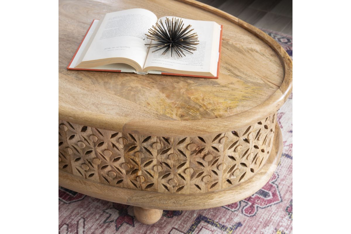 Art, color and texture come home to your space with this carved wood coffee table. The oval silhouette offers a welcome contrast to the usual angular elements of a room. The intricate, hand carved lattice pattern brings a bit of boho style to catch your eye. Made of 100 percent mango wood, this sturdy piece provides ample space to display your favorite coffee table books and set drinks. Four, spherical feet complement the oval design. Natures beauty is on display with a clear natural stain finish.