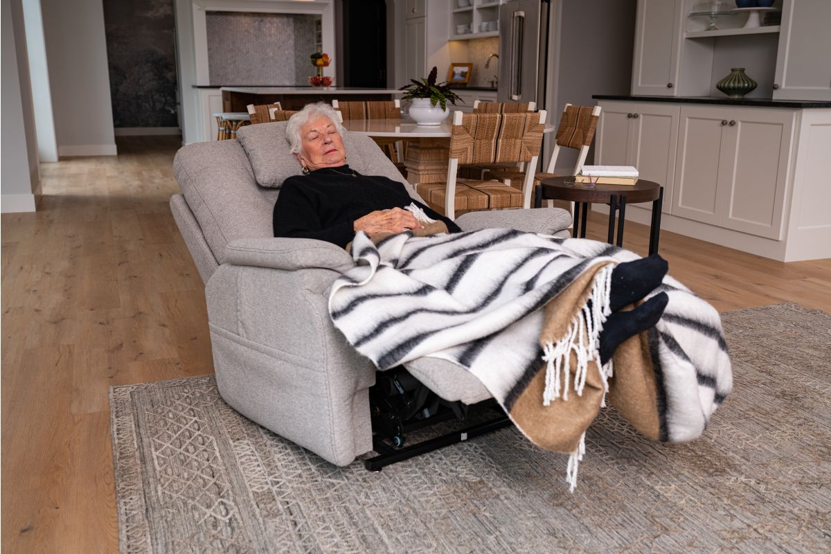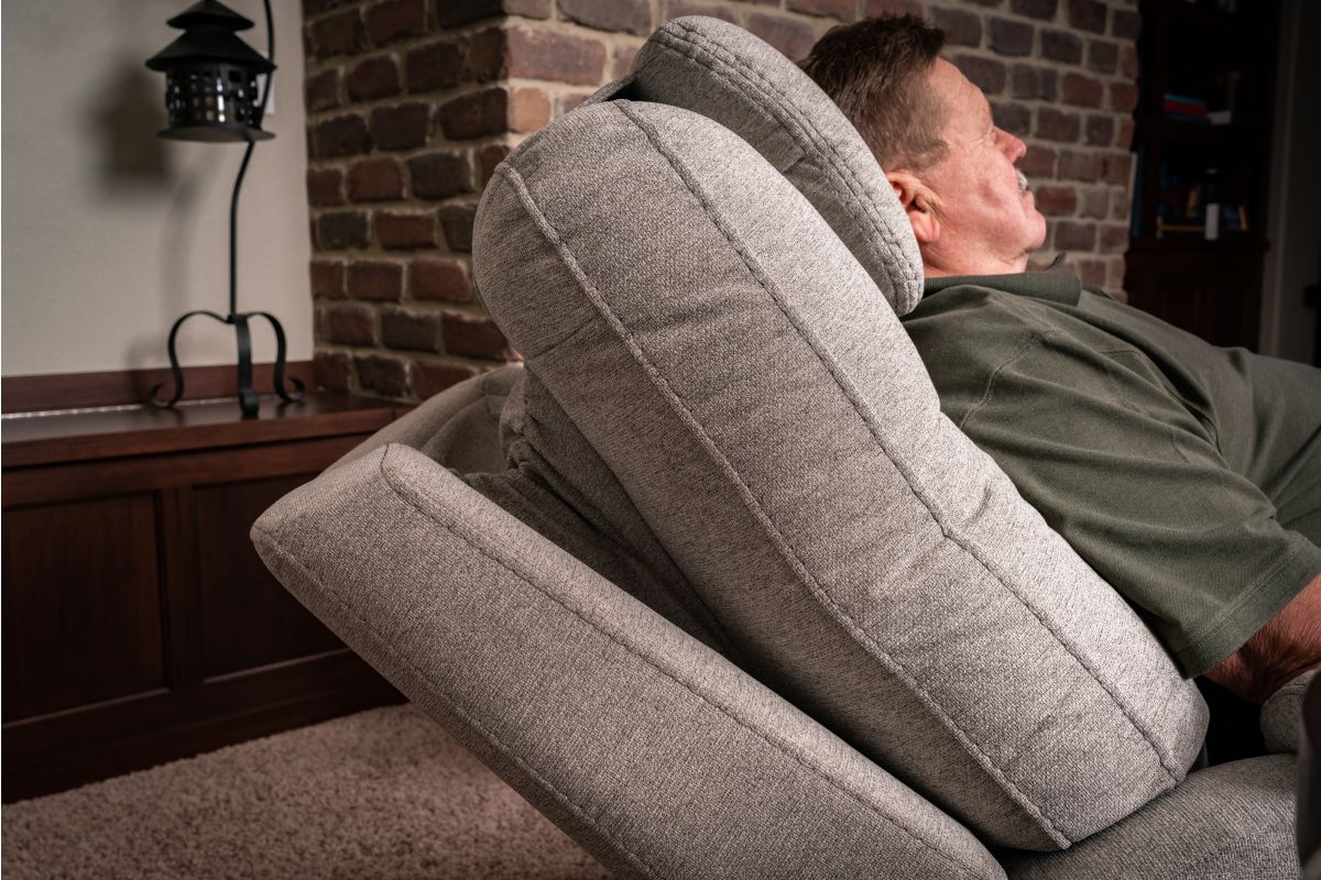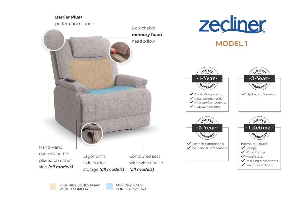 Cozy up in the Zecliner Model 1 Power Lift Sleep Chair, your perfect family recliner by day, and haven for peaceful sleep by night. With memory foam comfort areas in the backrest, seat, and shoulders, a removable Technogel head pillow, padded arms, and waterfall chaise, the Zecliner is a piece of unparalleled luxury. Complete with Flexsteel’s Blue Steel Spring™ at its core, this recliner provides surrounding comfort for both relaxation and slumber. The hand wand control lets you customize your comfort. Zero Gravity puts you in a state of weightlessness, and power lift provides smooth, supportive mobility assistance. Reliable performance fabric upholstery repels stains, while being easy to clean. Achieve blissful relaxation by day and a rejuvenating sleep by night with the Zecliner.