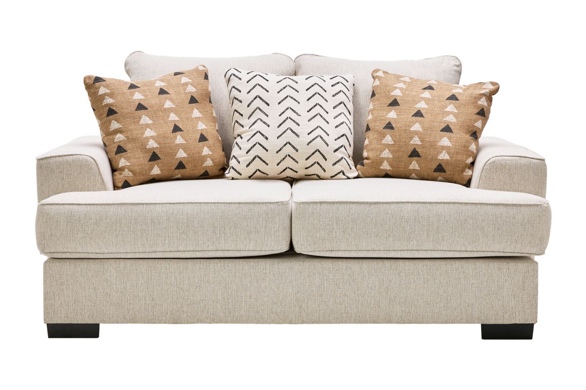 Add timeless style and luxurious comfort to your living space with the beautifully designed Everest loveseat. Upholstered in a versatile neutral fabric, this loveseat features plush, deep seating with generously padded cushions, perfect for relaxing after a long day. The clean lines and modern silhouette give it a sophisticated touch, while the included accent pillows with unique patterns and textures add a stylish contrast. Built with a durable frame and sturdy block feet, the Everest offers long-lasting support and elegance. Whether you're entertaining guests or unwinding with family, this loveseat brings both coziness and charm to any room.