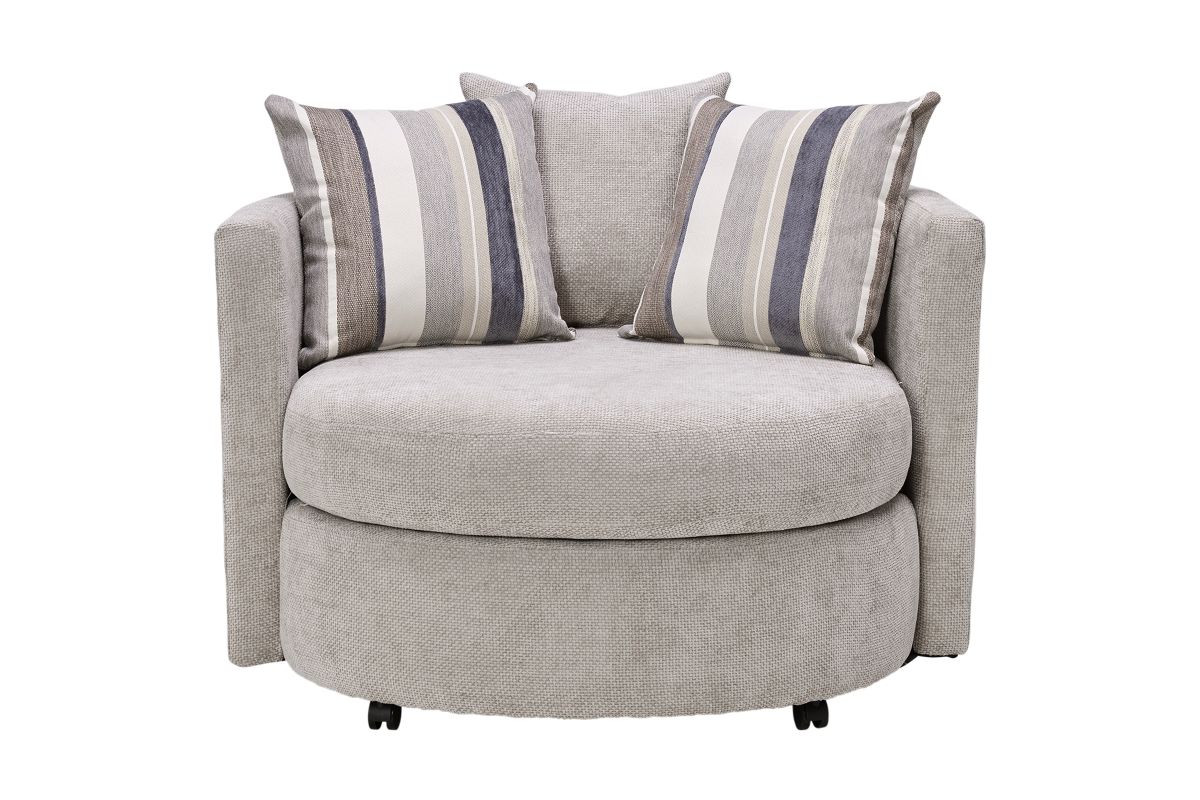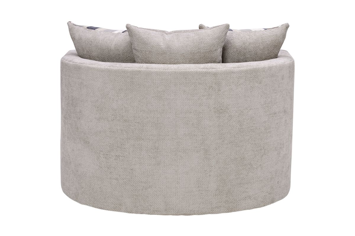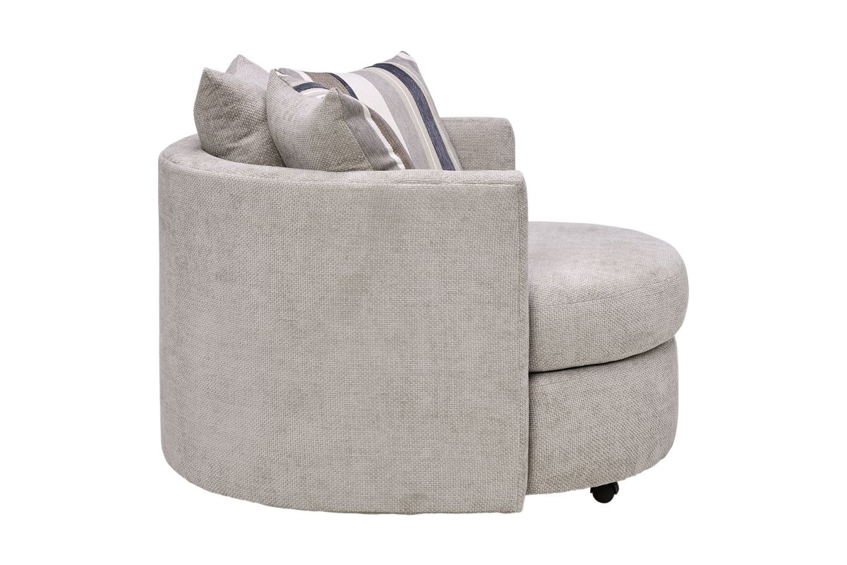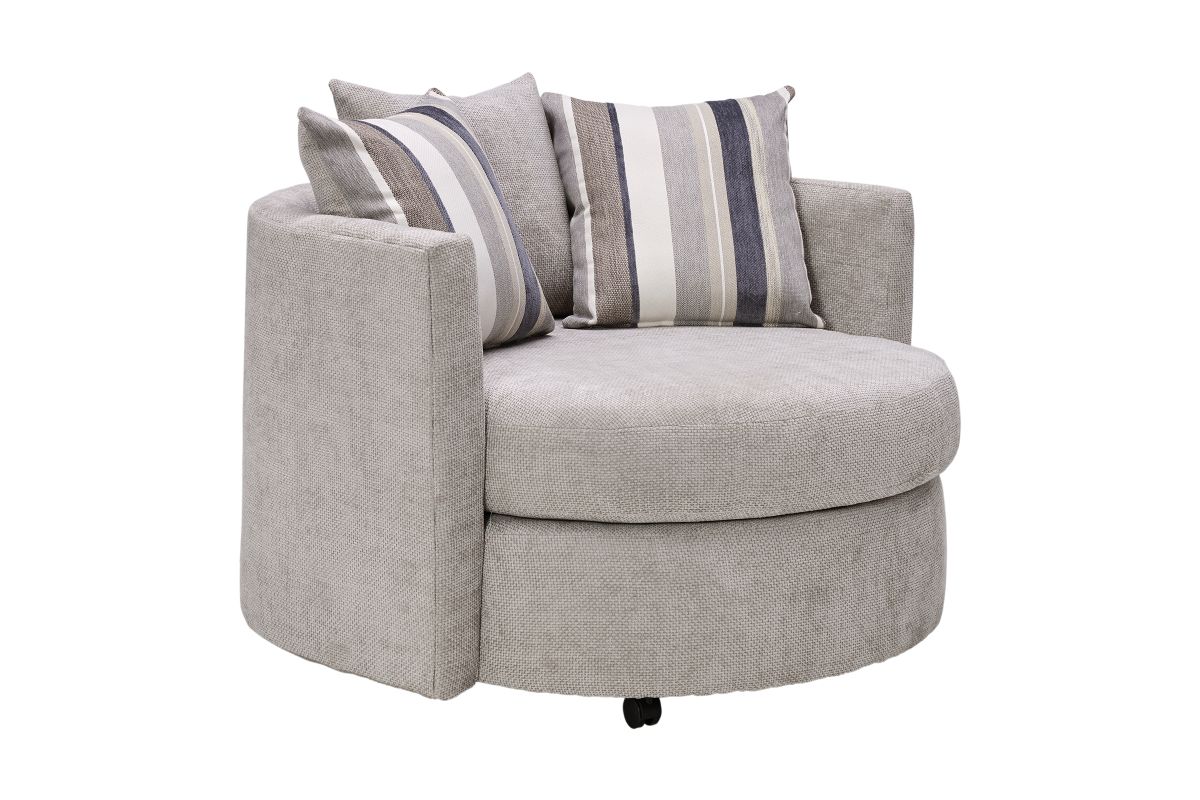 Elevate your lounging experience with the Cameron Swivel Chair — a perfect blend of comfort and style. Upholstered in soft, textured light gray fabric, this chair features a generously sized, rounded seat ideal for curling up with a book or relaxing with a cup of coffee. Its 360-degree swivel base adds functionality, allowing you to turn with ease and engage with your surroundings. Complete with three plush back cushions, including two with modern striped patterns in calming neutral tones, this chair adds a stylish accent to any living space. Whether you're designing a cozy reading nook or adding a chic focal point to your room, the Cameron Swivel Chair offers inviting comfort with contemporary charm.