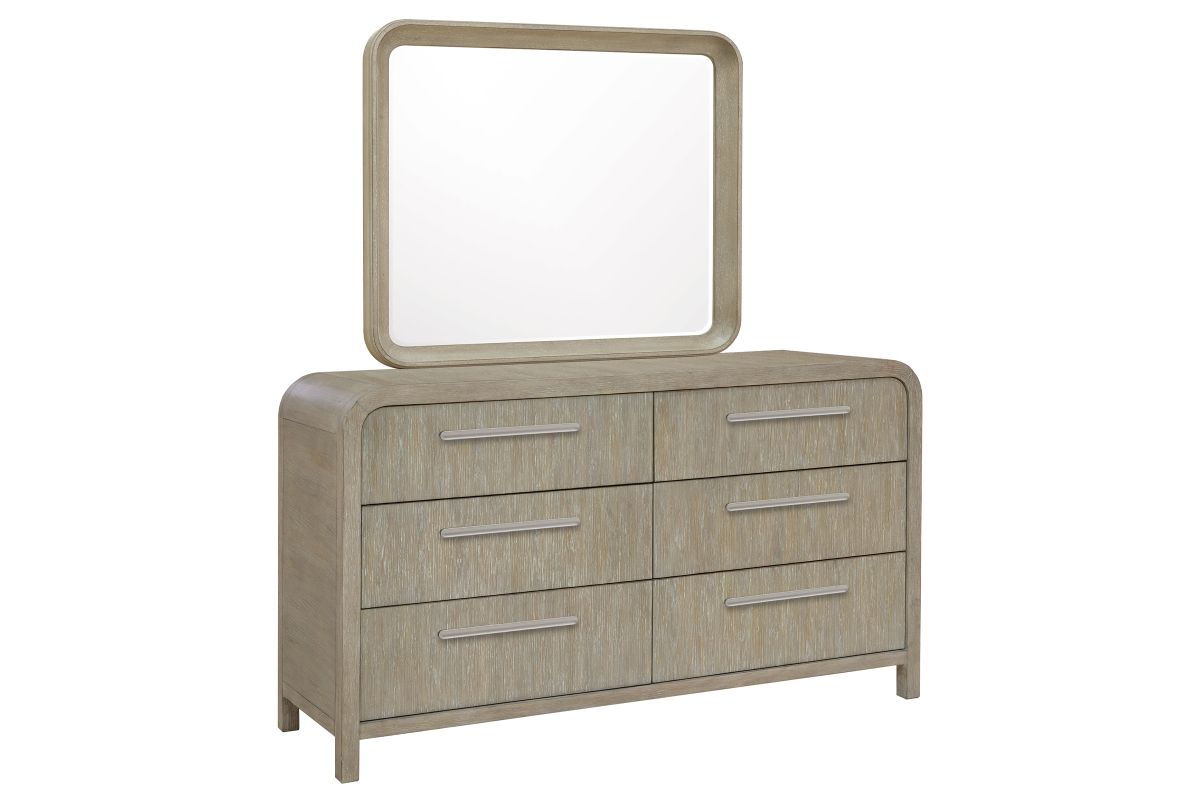 Bring effortless elegance and modern charm to your bedroom with this 6-Drawer Canyon Dresser & Mirror, beautifully crafted with rounded corners and a smooth buff finish. The sleek design is elevated by distinctive silver cloud hardware, adding a touch of sophistication to its clean lines.
