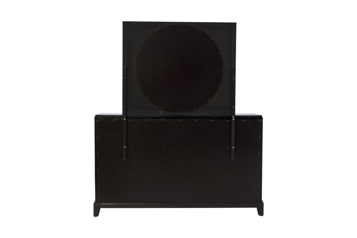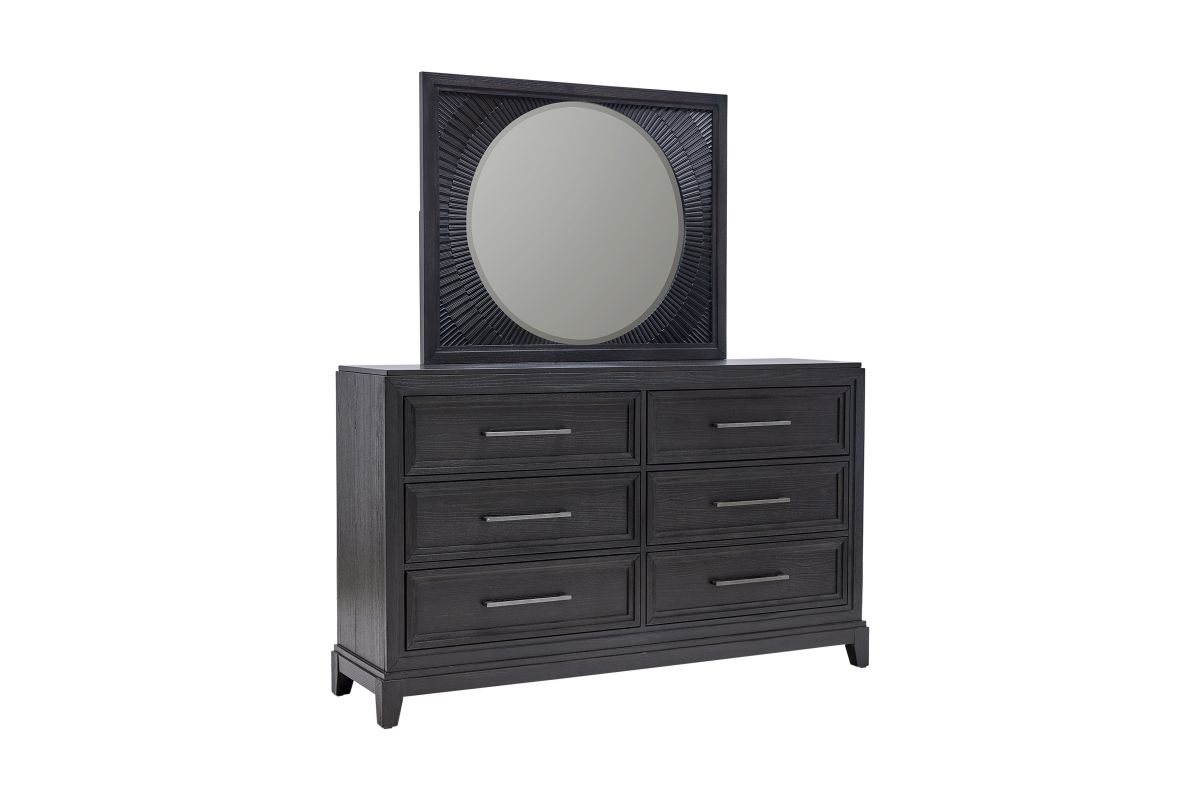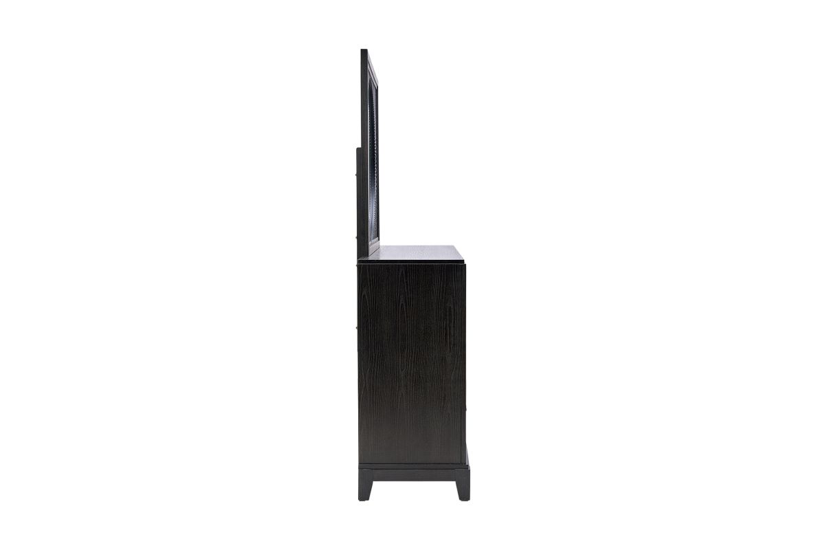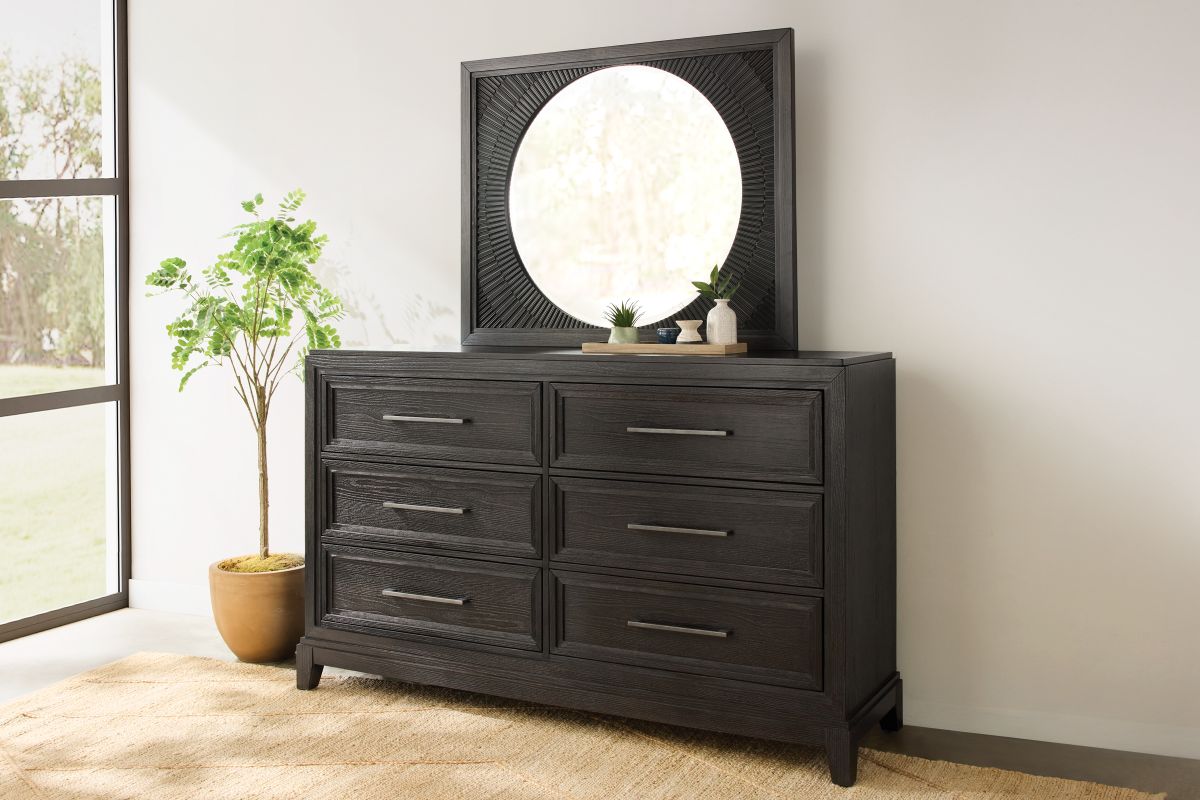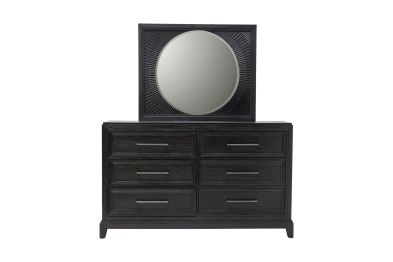 Introducing our Meredith exquisite 6-Drawer Black Dresser & Mirror, a perfect marriage of elegance and contrast. This dresser not only provides ample storage but also combines the sophistication of chrome drawer pulls and an oak grain finish, creating a visually stunning and versatile piece for your bedroom.