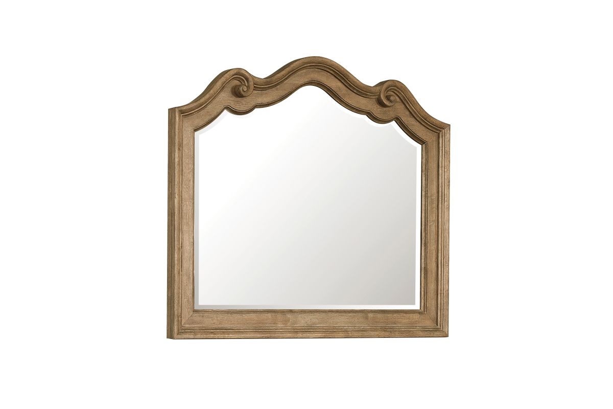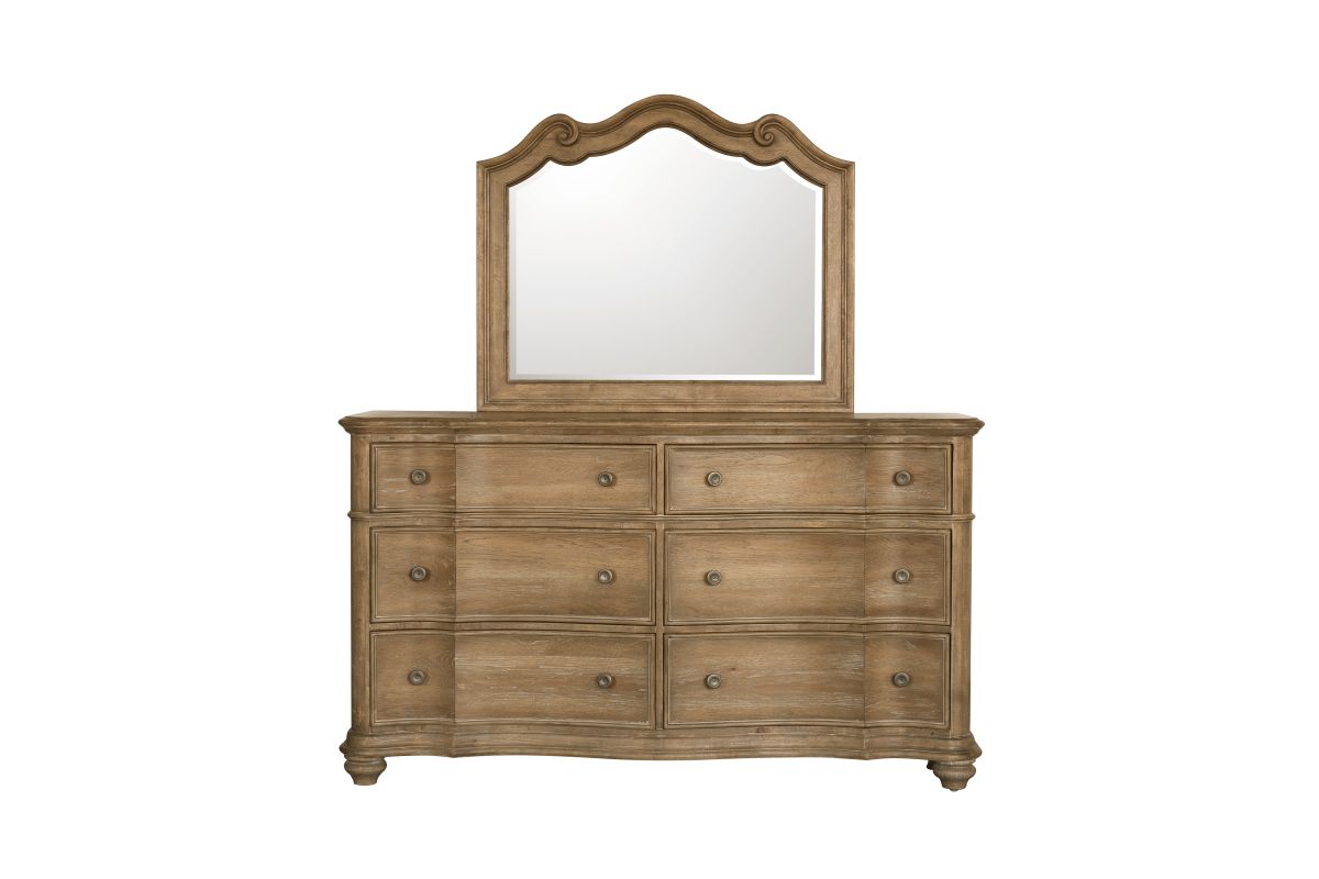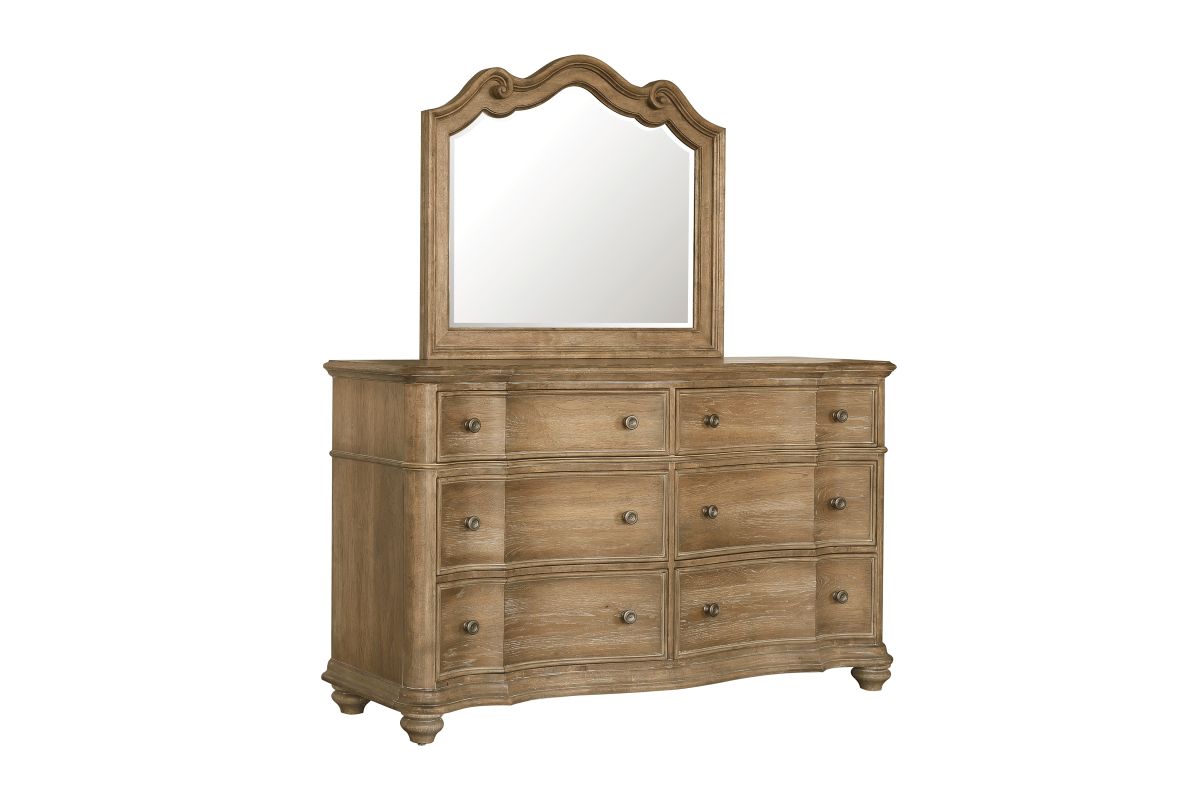 Bring the essence of an elegant home in the French countryside to your bedroom with Weston Hills Dresser Mirror. This beveled mirror features a shaped wood frame with wood trim that displays intricately detailed scrollwork. White cerusing on cathedral hickory veneers enhances the grain and adds softness to the warm tones of the wood. Shapley fronts, rounded corners, and walnut inlays add distinction and character. Weston Hills --perfectly timeless, perfectly today, perfectly you.