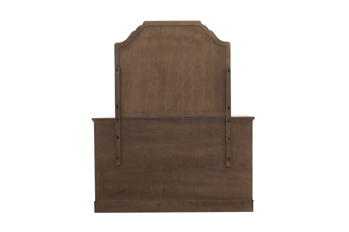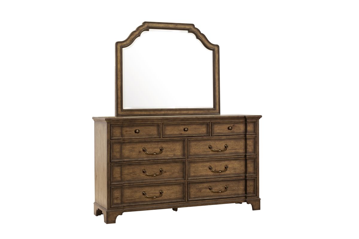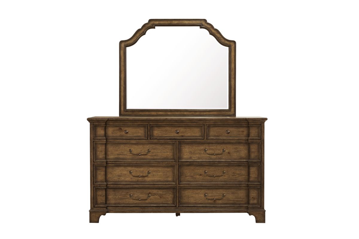 Add a touch of sophistication to your bedroom with the Revival Row Landscape Dresser Mirror. Intricate and ornate carvings on the frame showcase French and English elements, while the beveled mirror creates a sense of openness to the room. Unique and visually appealing, this mirror exudes timeless charm and becomes a focal point in any living space.