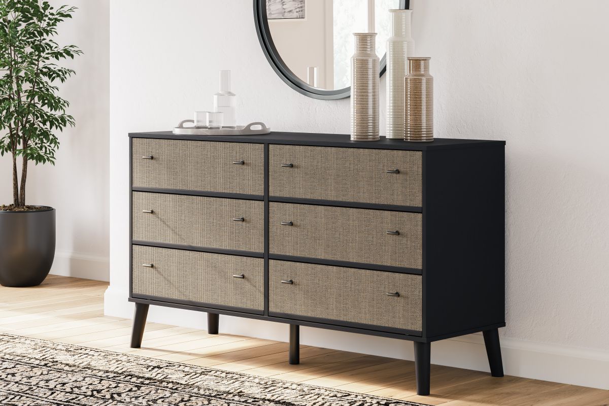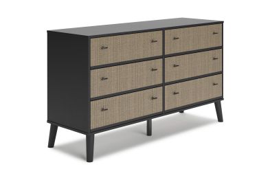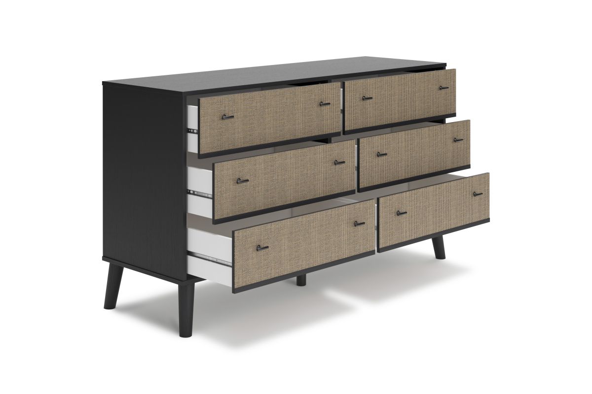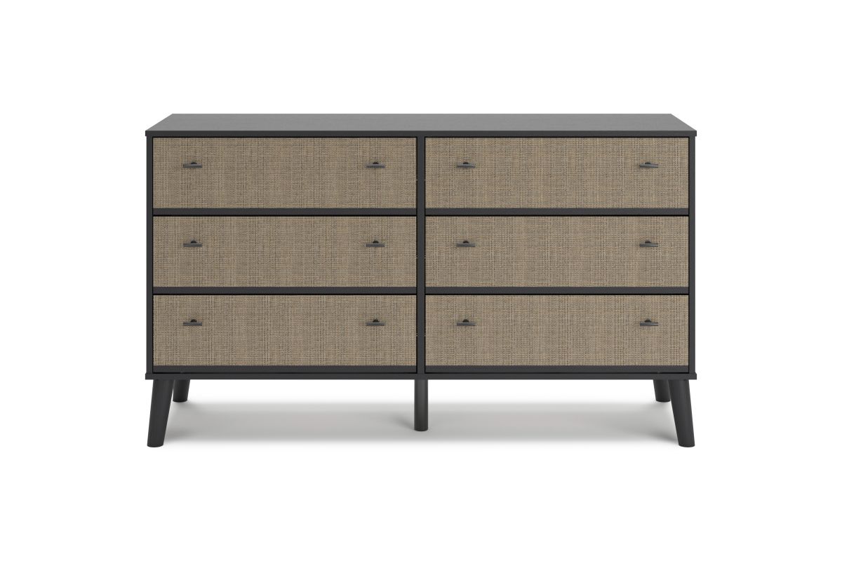 Put a retro spin on current trends with this dresser. Its mixed-material look of matte black and replicated beige cane brings a casually cool feel to your bedroom. Simple, sleek hardware and splay legs round out the urban meets mid-century vibe.