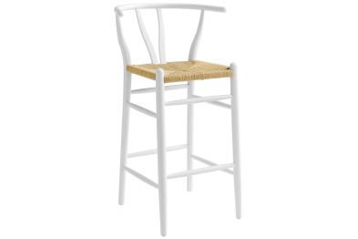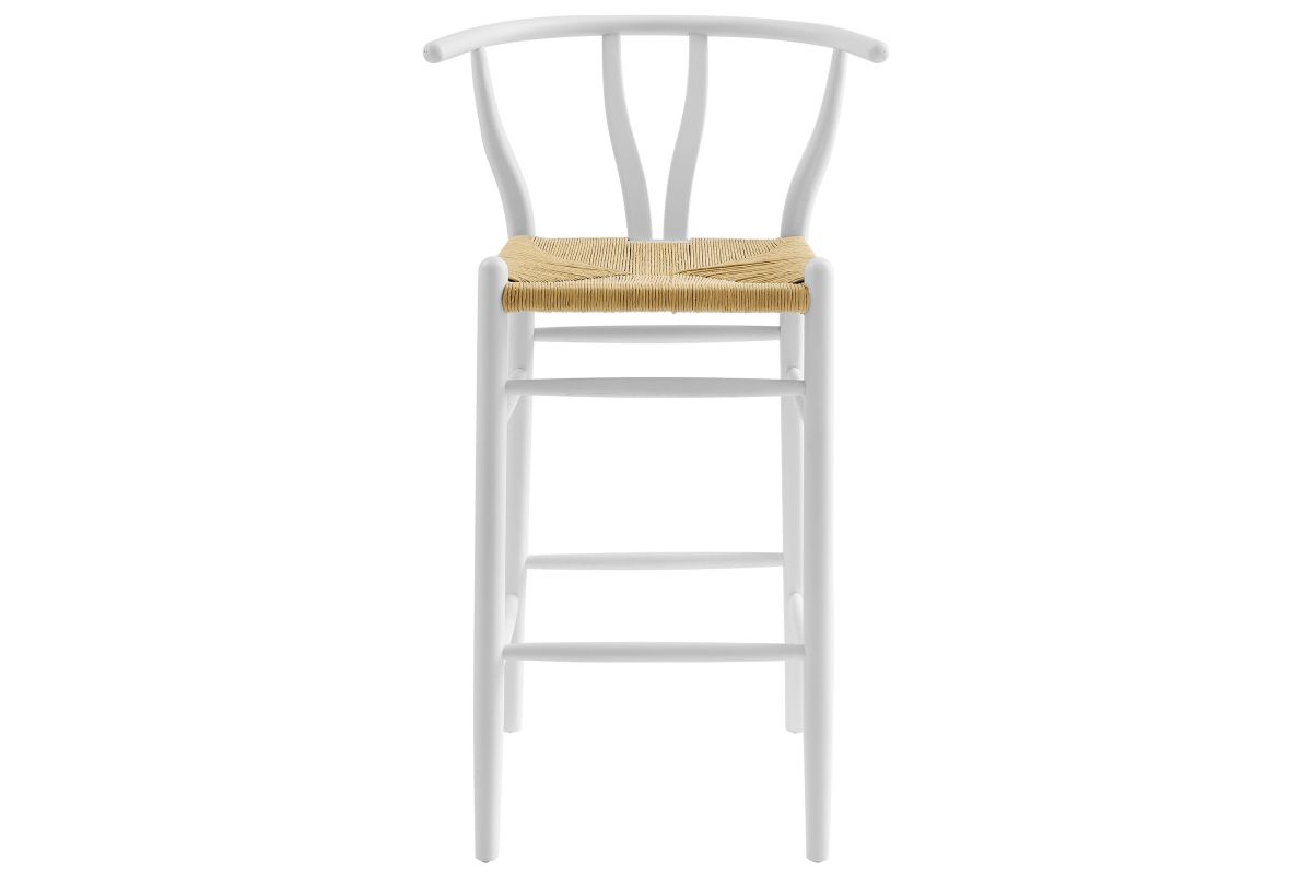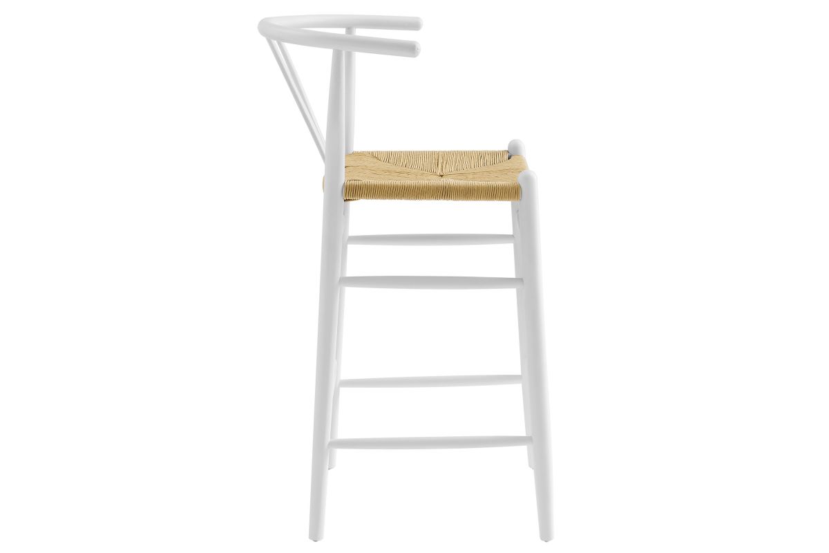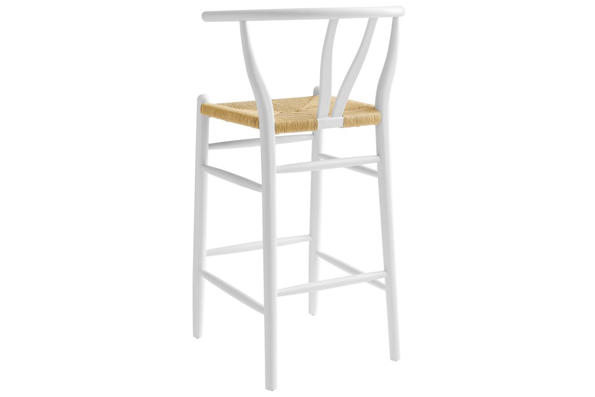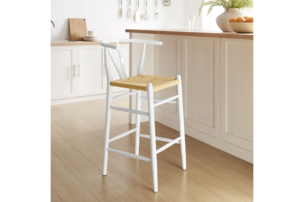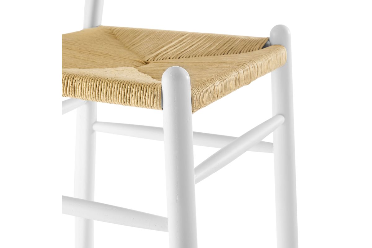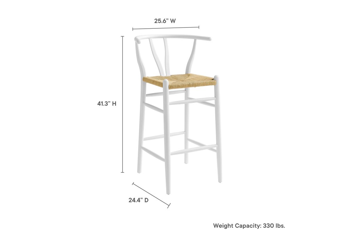 Rustic lines form the flowing frame of the Amish Wooden Bar Stool. Set with a mid-century style, this bar height chair combines minimalist aesthetics with natural details, bringing beauty to your bistro and bar area. Featuring an elm wood frame with a curved half moon backrest that dips into a distinctive V-shaped cutaway, this barstool follows a classic retro chair design. Its woven paper rope seat complements the solid wood construction, making this modern bar stool perfect for your living room, lounge, bistro, café, or kitchen décor. Arriving fully assembled, the Amish mid-century bar stool features an ergonomic design with foot bar supports, offering both comfort and farmhouse style for long-lasting enjoyment. Modern Stool Weight Capacity: 331 lbs