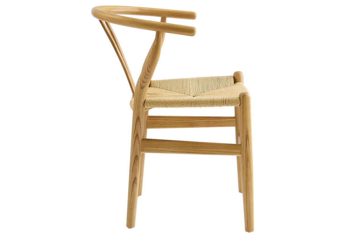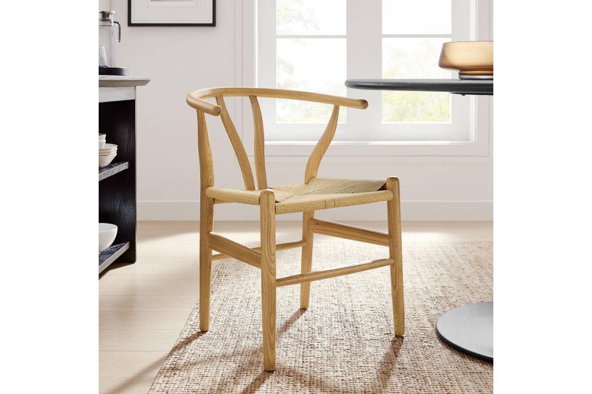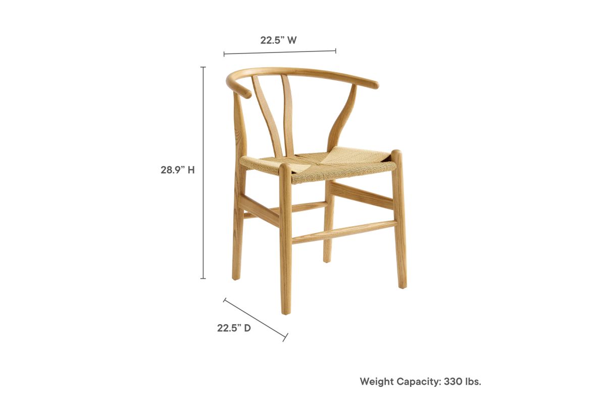 Rustic lines form the flowing frame of the Amish Wood Rope Dining Side Chair. Set with a mid-century style, this rope accent chair combines minimalist aesthetics with natural details, bringing beauty to your kitchen and dining areas. Featuring an elm wood frame with a curved half moon backrest that dips into a distinctive V-shaped cutaway, this side chair follows a classic retro chair design. Its woven paper rope seat complements the solid wood construction, making this armless dining chair perfect for your living room, lounge, bistro, café, or kitchen décor. Arriving fully assembled, the 29-inch tall Amish Side Chair features an ergonomic design with foot bar supports, offering both comfort and style for long-lasting enjoyment. Rope Chair Weight Capacity: 331 lbs.