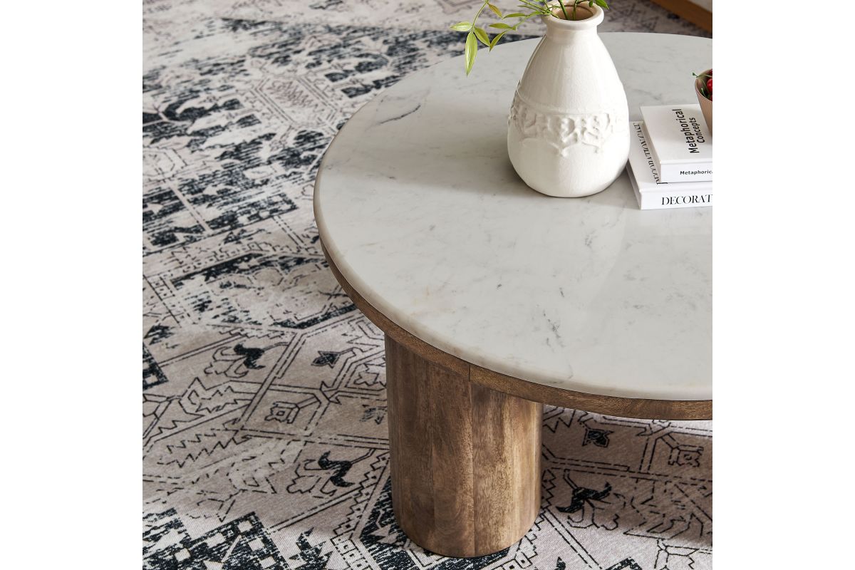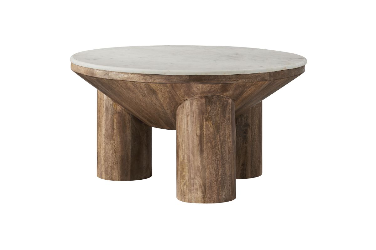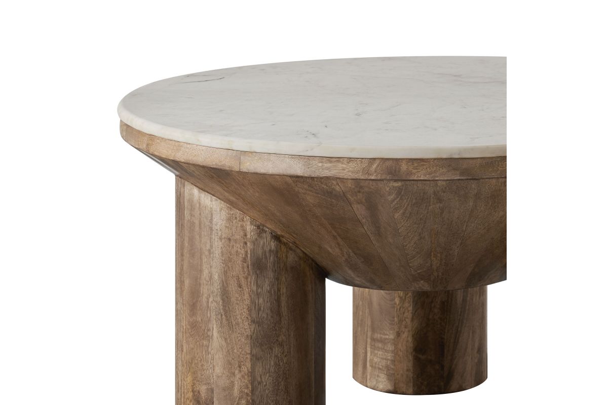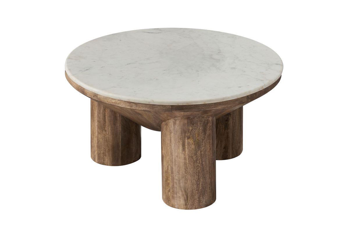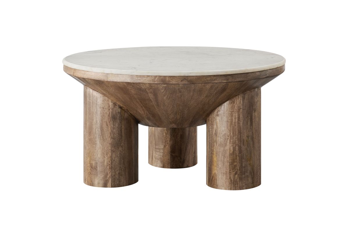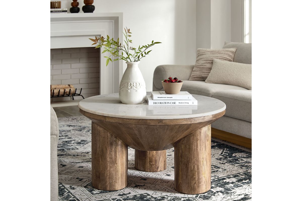 Elevate your living room with the Ellison Round Mango Wood Coffee Table, a stunning fusion of natural materials and sculptural design. Topped with luxurious genuine marble, this 33-inch coffee table adds timeless elegance to your space while offering a durable surface for decor, drinks, or everyday essentials. The base of this circular coffee table, crafted from solid mango wood, features a bold drum silhouette supported by three cylindrical legs, blending natural warmth with modern sophistication. Perfect for contemporary and mid-century modern interiors, the Ellison Wood and Marble Coffee Table is a true statement piece that complements any living space. Equipped with felt floor pads to protect your flooring, this drum coffee table is as practical as it is stylish. Best of all, it arrives fully assembled, ready to bring effortless charm to your home. Accent Table Weight Capacity: 91 lbs.
