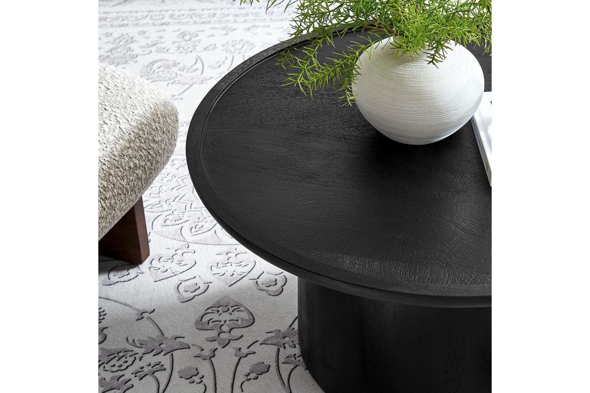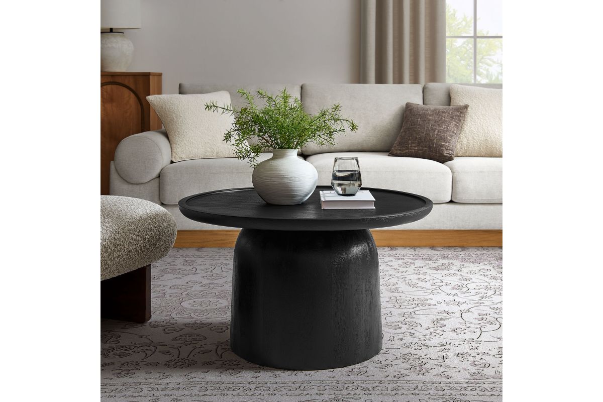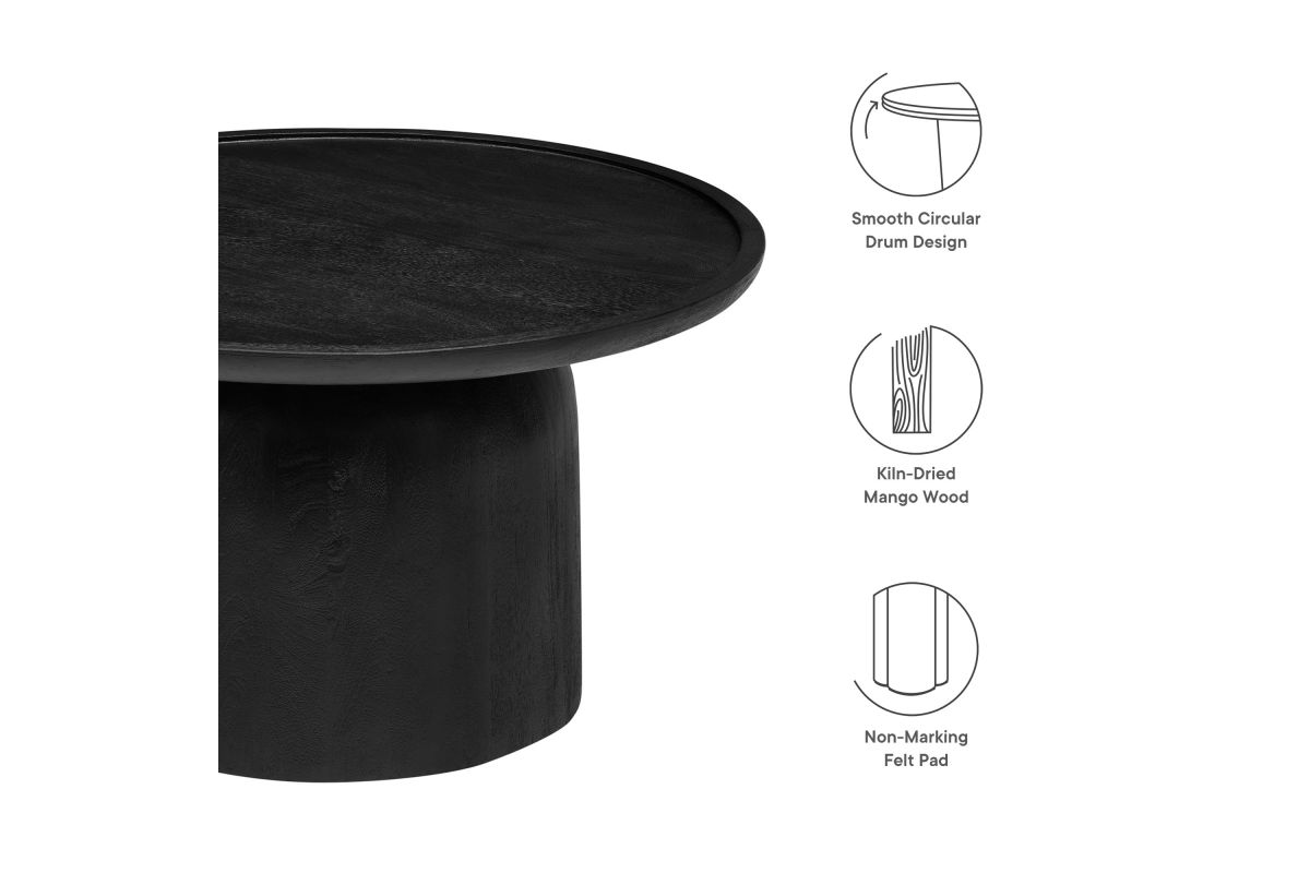 Bring timeless elegance to your living space with the Holloway Round Mango Wood Coffee Table. Crafted from solid mango wood, this 30-inch coffee table boasts a smooth, circular drum design that combines contemporary style with mid-century modern appeal. The solid tabletop provides a durable surface for displaying decor, holding drinks, or serving as a centerpiece in your living room. Designed to complement small spaces and apartments, this round wood coffee table offers an inviting aesthetic that enhances a variety of interiors. The natural wood grain and warm tones highlight the beauty of mango wood, creating a versatile and sophisticated accent table that’s perfect for modern and minimalist living rooms alike. Weight Capacity: 156 lbs.