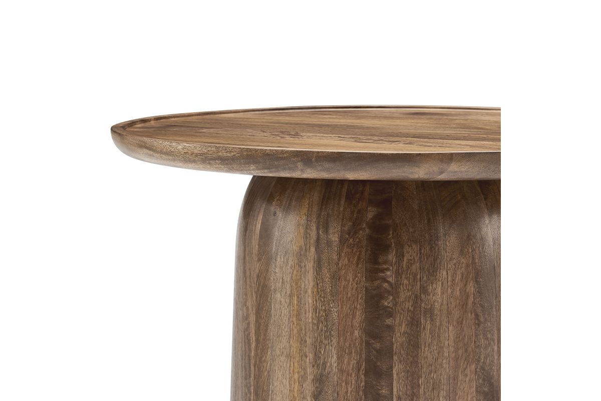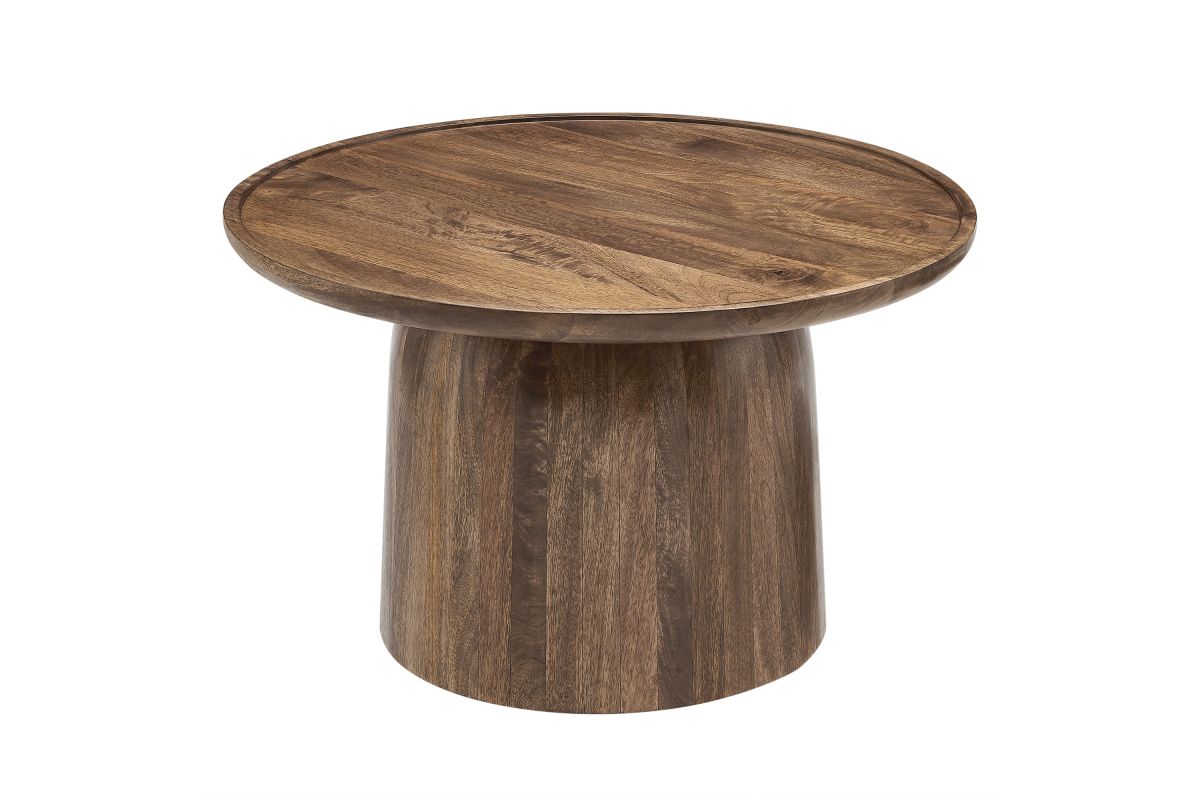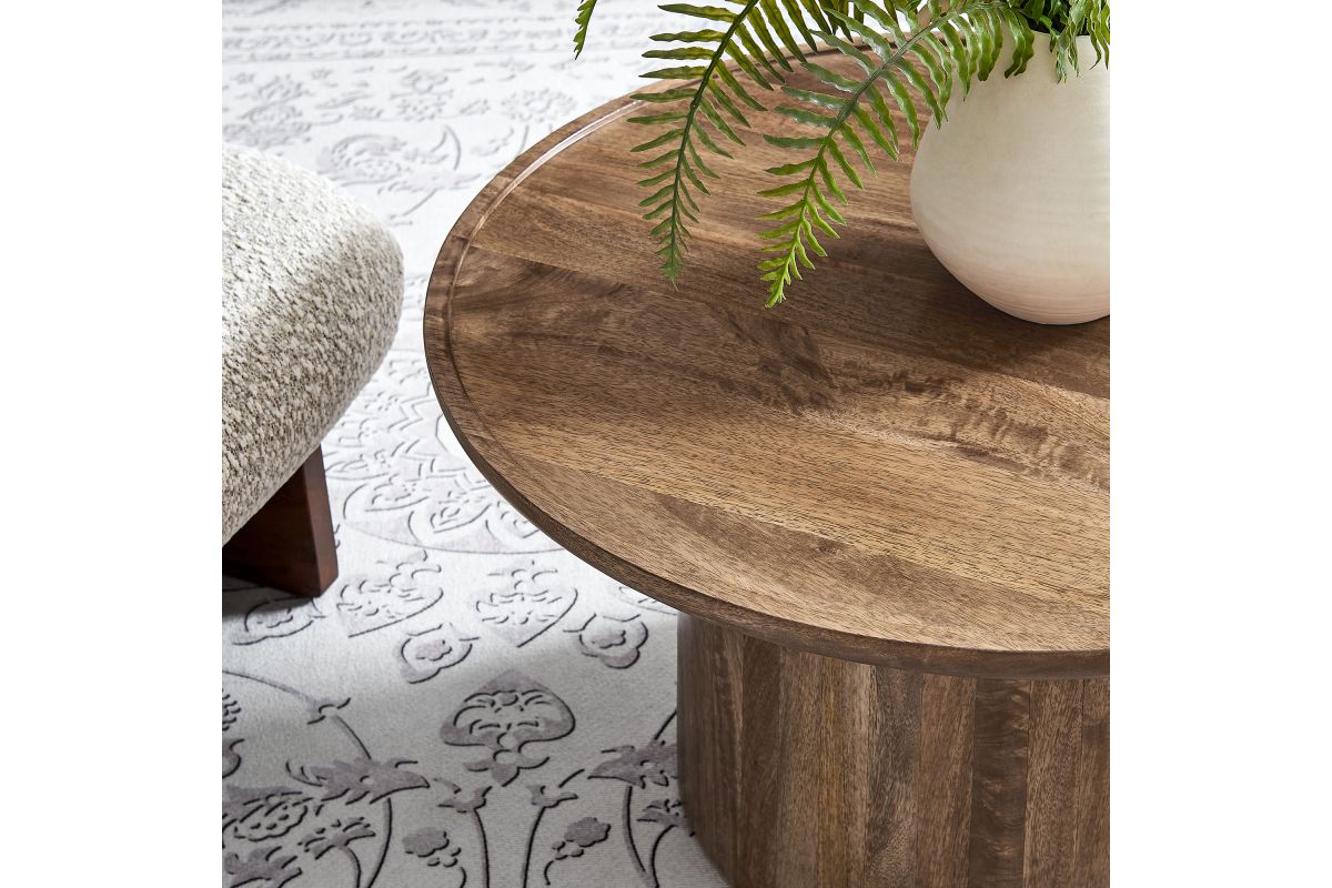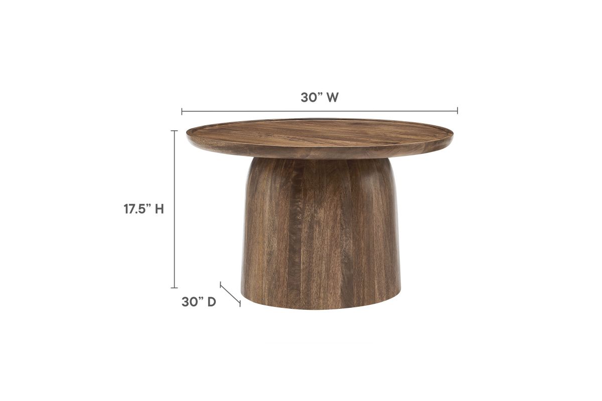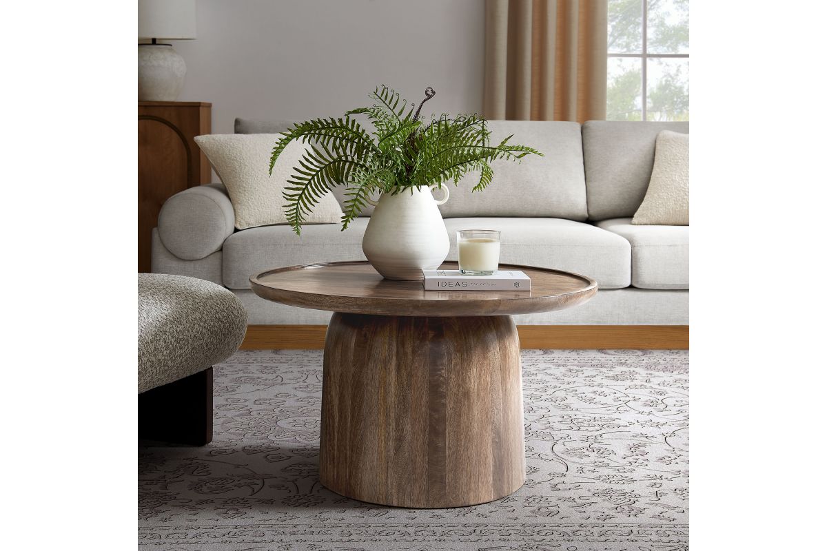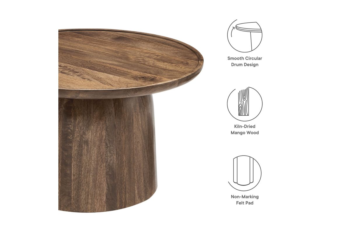 Bring timeless elegance to your living space with the Holloway Round Mango Wood Coffee Table. Crafted from solid mango wood, this 30-inch coffee table boasts a smooth, circular drum design that combines contemporary style with mid-century modern appeal. The solid tabletop provides a durable surface for displaying decor, holding drinks, or serving as a centerpiece in your living room. Designed to complement small spaces and apartments, this round wood coffee table offers an inviting aesthetic that enhances a variety of interiors. The natural wood grain and warm tones highlight the beauty of mango wood, creating a versatile and sophisticated accent table that’s perfect for modern and minimalist living rooms alike. Weight Capacity: 156 lbs.
