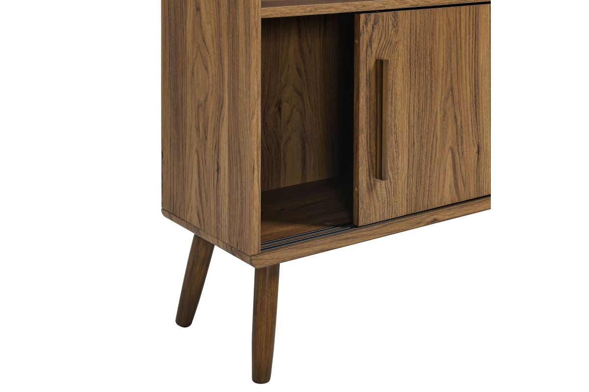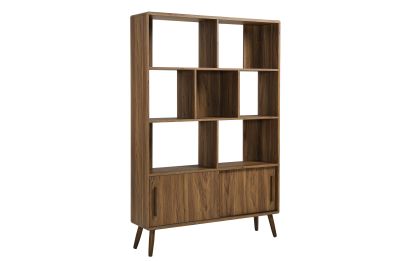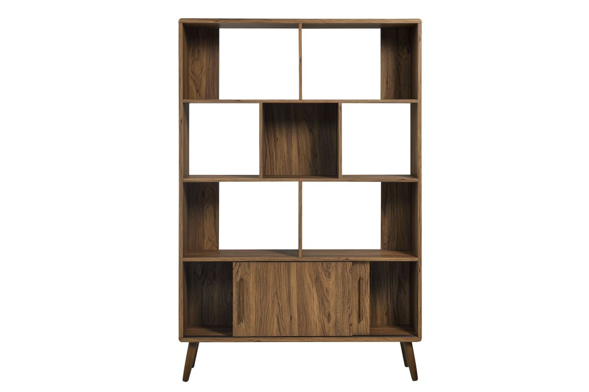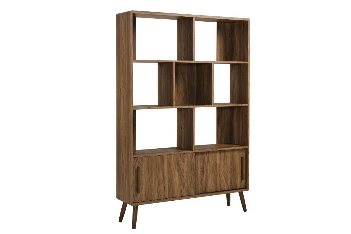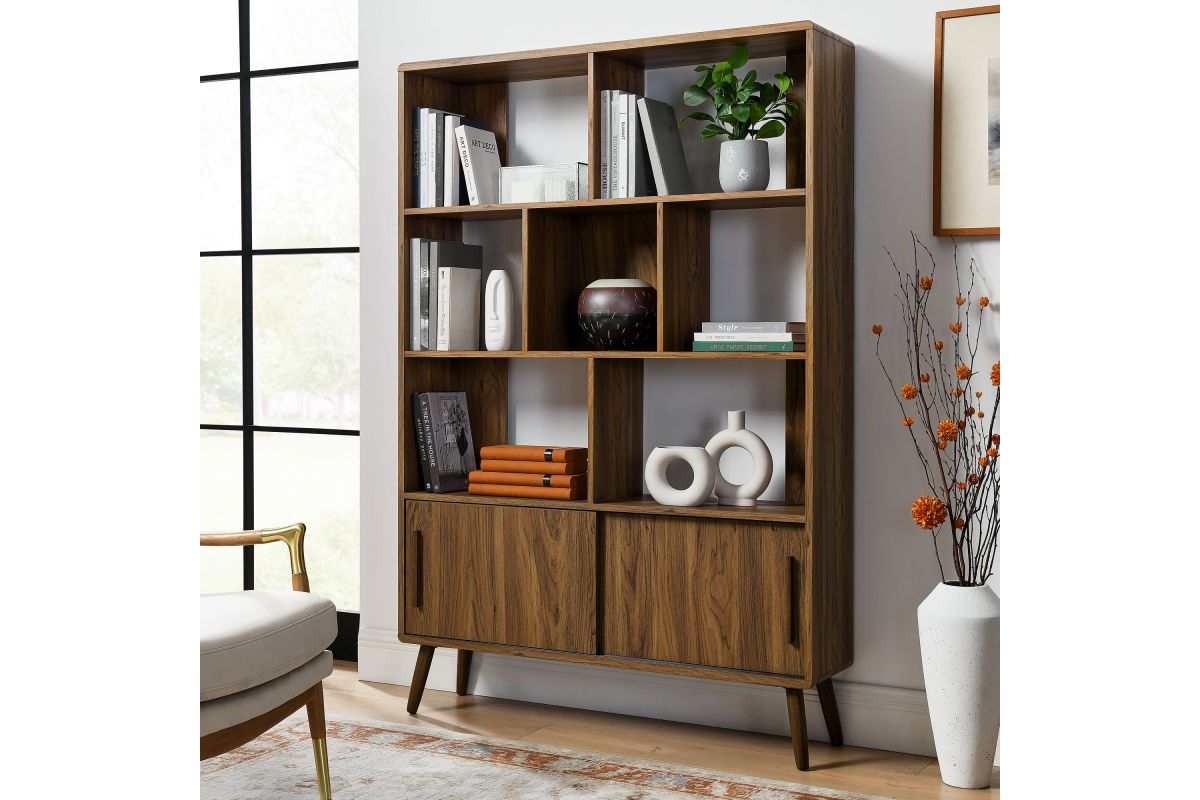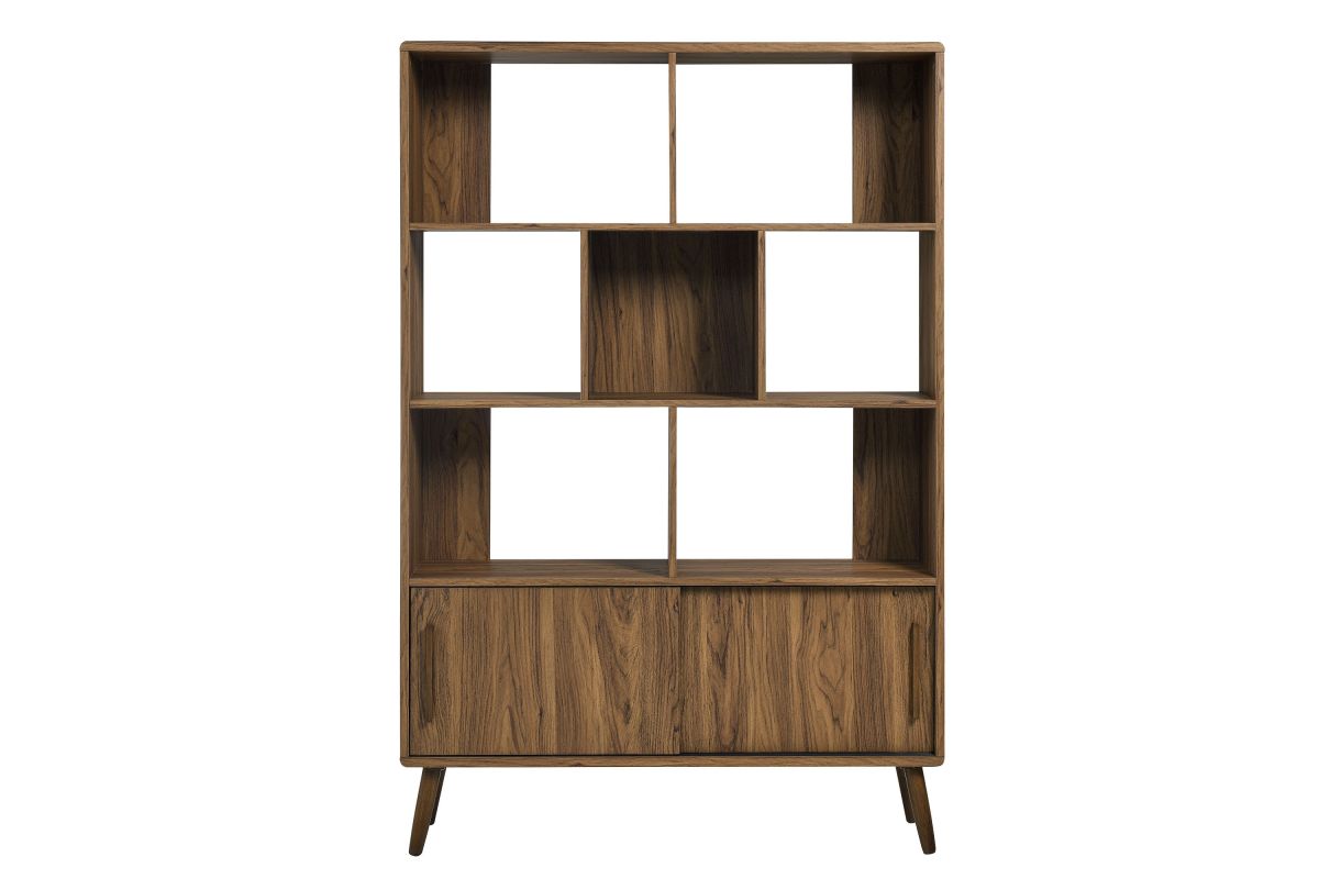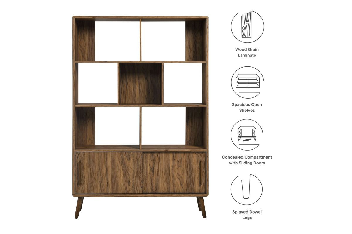 Refresh your home decor with the Transmit 45" Open Display Storage Bookshelf. Crafted with a wood grain laminate finish, this four-tiered large bookcase stands proudly on four splayed dowel legs. Its unique shelf layout offers a contemporary touch, providing seven open display areas and a bottom shelf with sliding doors for concealed storage. Whether placed in a living room, hallway, entryway, or office, this mid-century bookcase with storage effortlessly transforms any empty space into a stylish spot for showcasing books, photos, accent pieces, and cherished collectibles. Assembly Required. Weight Capacity: Top - 88 lbs; Open Shelves - 55 lbs each; Bottom Concealed Shelf - 44 lbs