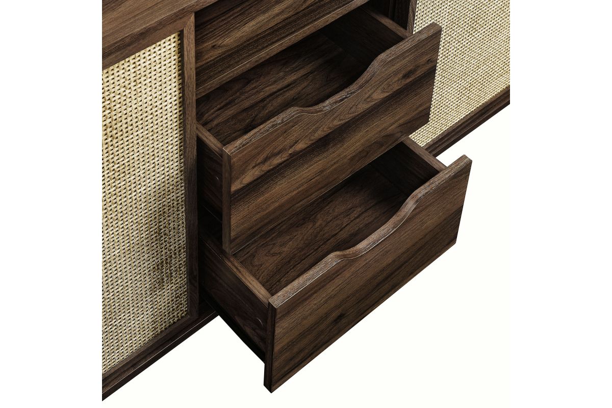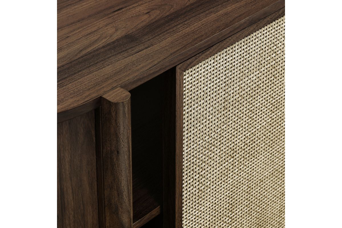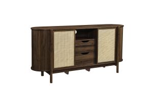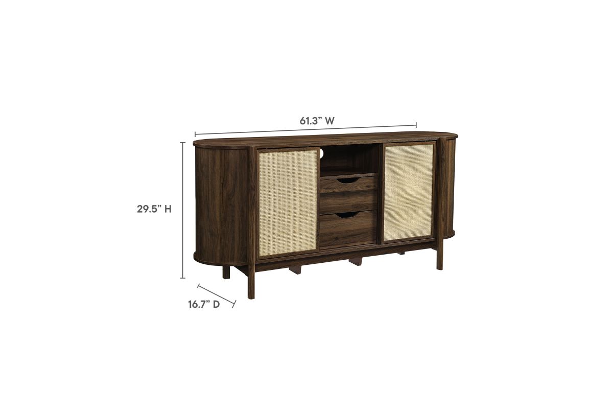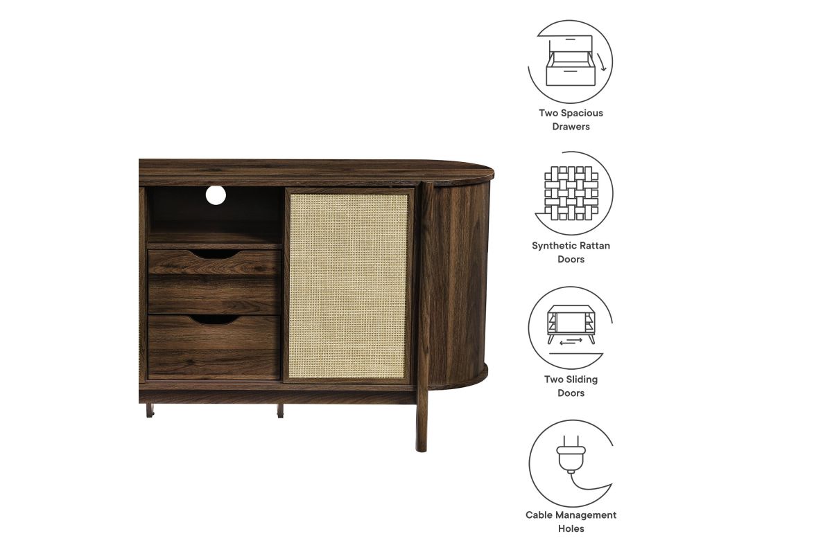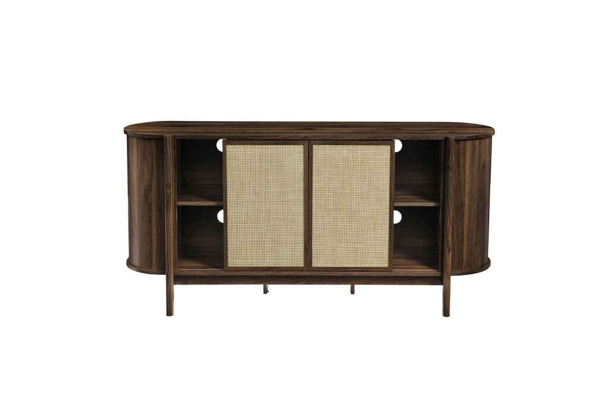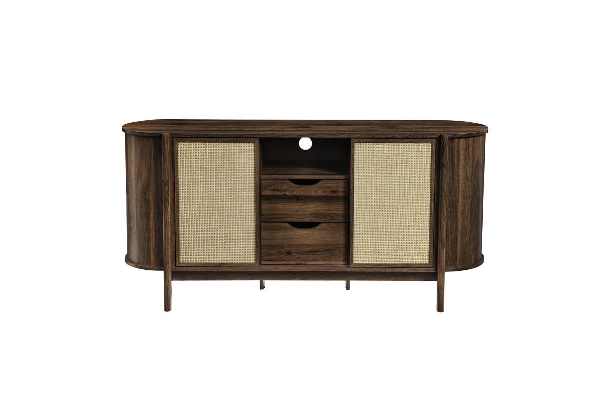 Introducing the Reid 63" Sideboard, which perfectly marries mid-century modern design with practical utility. This sideboard buffet cabinet flaunts a distinctive oval shape and covered in smooth laminate for a polished look. Synthetic rattan sliding doors open to reveal two shelving sections on each side, ideal for neatly organizing household items. In the center, an open top shelf and two drawers provide additional storage. The leg design on this modern storage cabinet is a standout, extending from top to bottom with a subtle curve that adds stylish flair and robust support to the frame. Additional legs below reinforce stability and ensure an even distribution of weight. Complete with non-marking foot glides, the Reid Curved Sideboard ensures your space is both tidy and stylish, whether used as a living room storage cabinet, a dining room buffet sideboard or as an entryway storage table. Reid also functions as a tall TV stand, accommodating wall mounted or anchored TVs up to 70 inches. Assembly required. Weight capacity: 192 lbs.