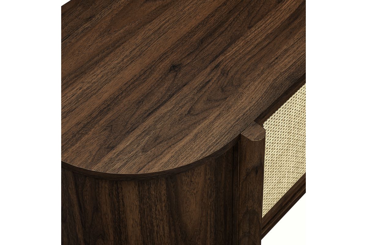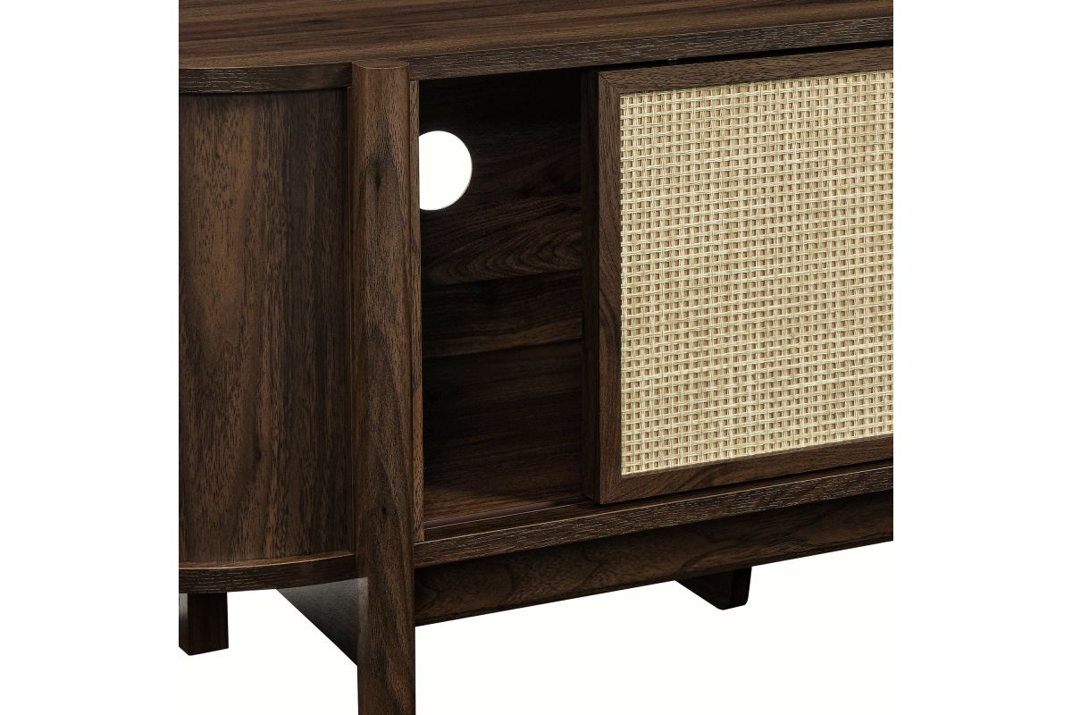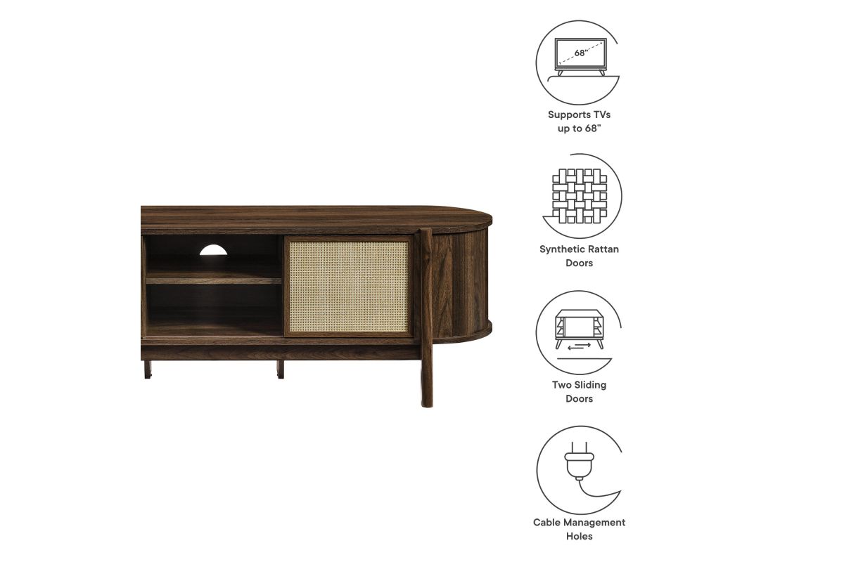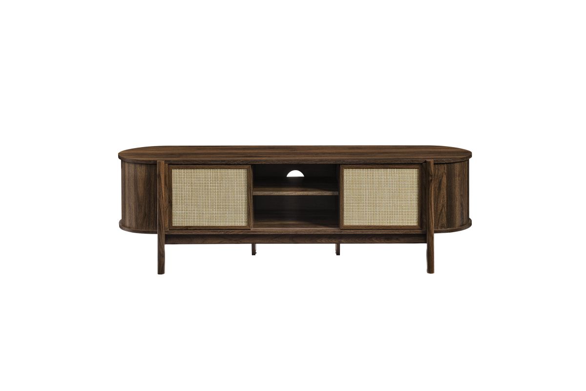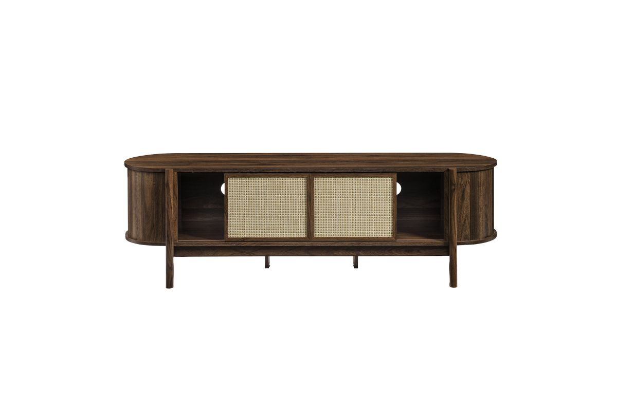 Introducing the Reid 61" TV Stand, which perfectly marries mid-century modern design with practical utility. This TV stand cabinet flaunts a distinctive oval shape and is covered in smooth laminate for a polished look. Synthetic rattan sliding doors glide to reveal spacious side compartments, perfect for storing various media devices, complemented by an adjustable center shelf that enhances storage flexibility. The leg design is a standout, extending from top to bottom with a subtle curve that adds stylish flair and robust support to the frame. Additional legs below reinforce stability and ensure an even distribution of weight. Complete with non-marking foot glides and three cable management holes, the Reid TV Media Console ensures your setup is both tidy and stylish. Accommodates flat-screen TVs up to 68 inches, assembly required. Weight capacity: 192 lbs.