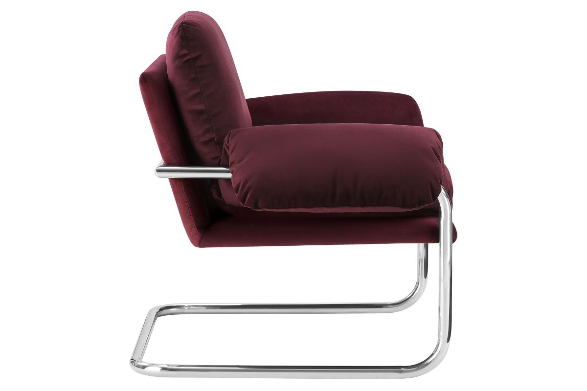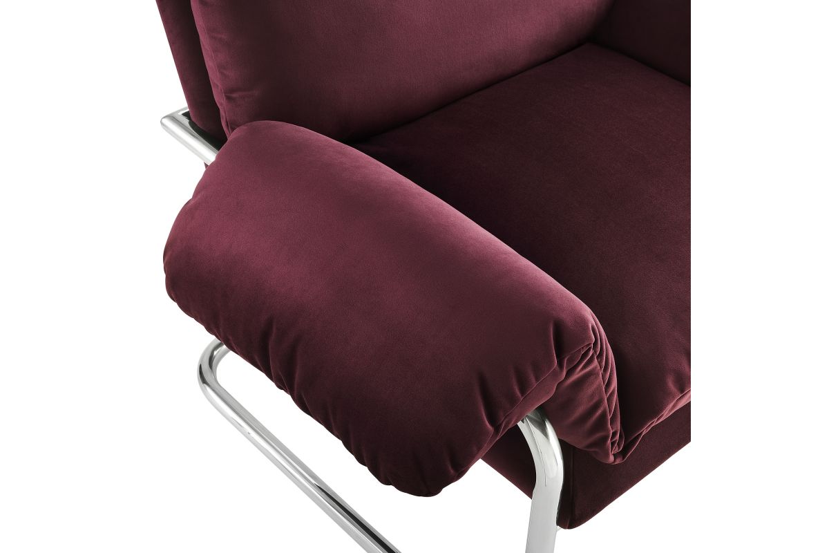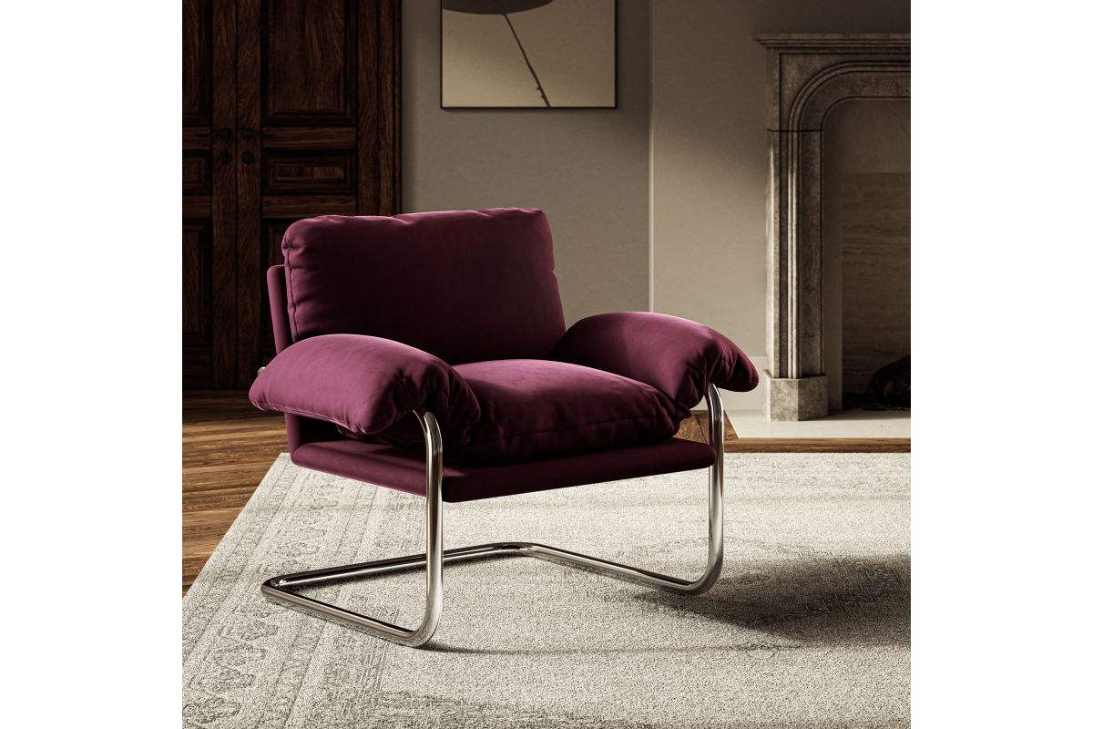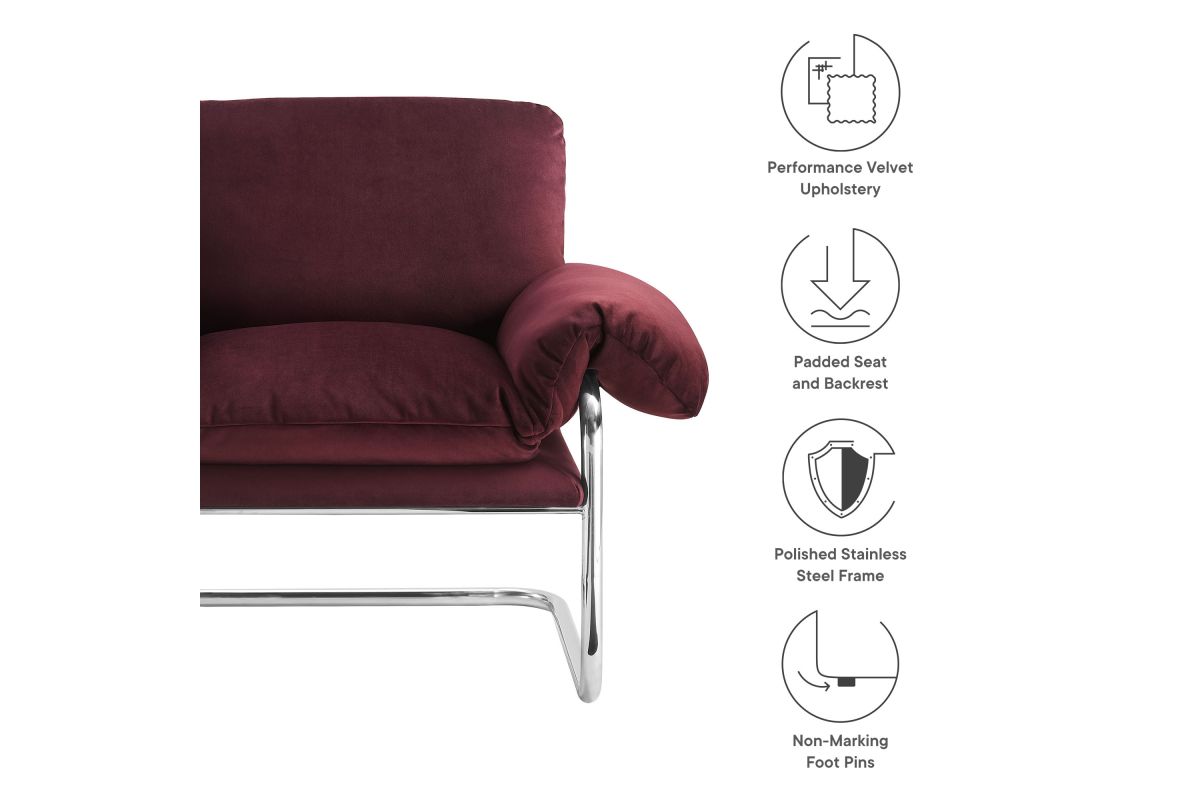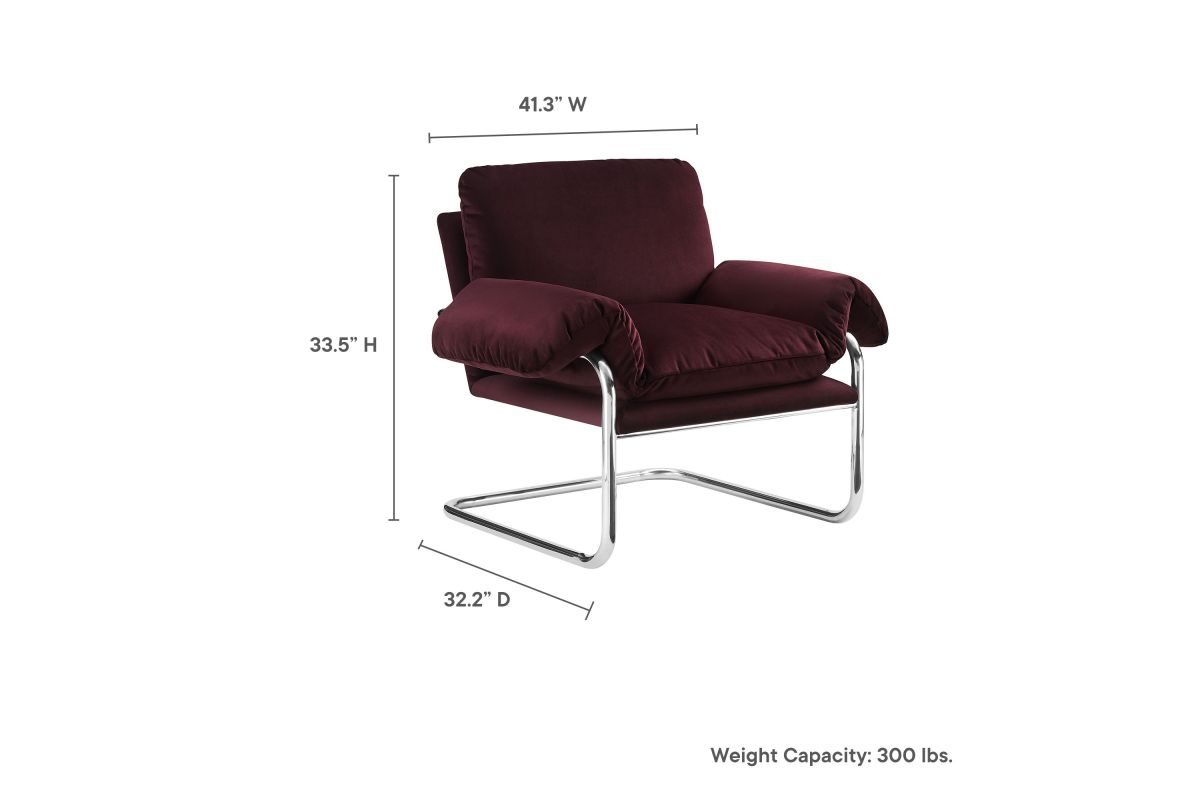 Sink into comfort with the Ansel Vintage Accent Armchair, an inviting statement chair perfect for your living room, bedroom, or lounge area. This modern retro armchair combines a stainless steel cantilever frame with stain-resistant performance velvet upholstery. The fixed back and seat provide a stable, lightly padded base, a comfortable back cushion and a thick body cushion that drapes over the arms—add extra flair. Secured with metal fasteners, the body cushion stays firmly in place, creating an inviting, velvety feel that complements the lounge chair’s mid century modern-inspired look. Designed with non-marking foot pins to protect your floors, this velvet accent chair effortlessly merges style with practicality. Ansel brings a sophisticated vintage charm to any space, creating a cozy yet refined atmosphere for relaxation and conversation. Weight Capacity: 300 lbs