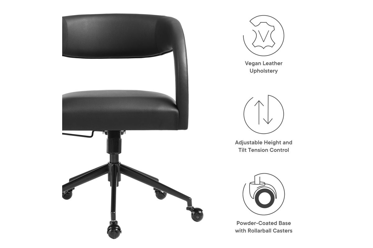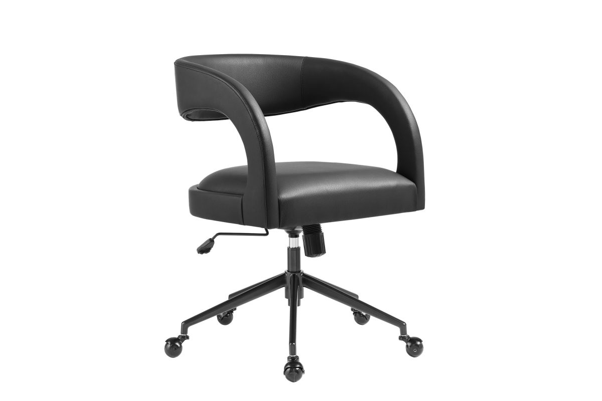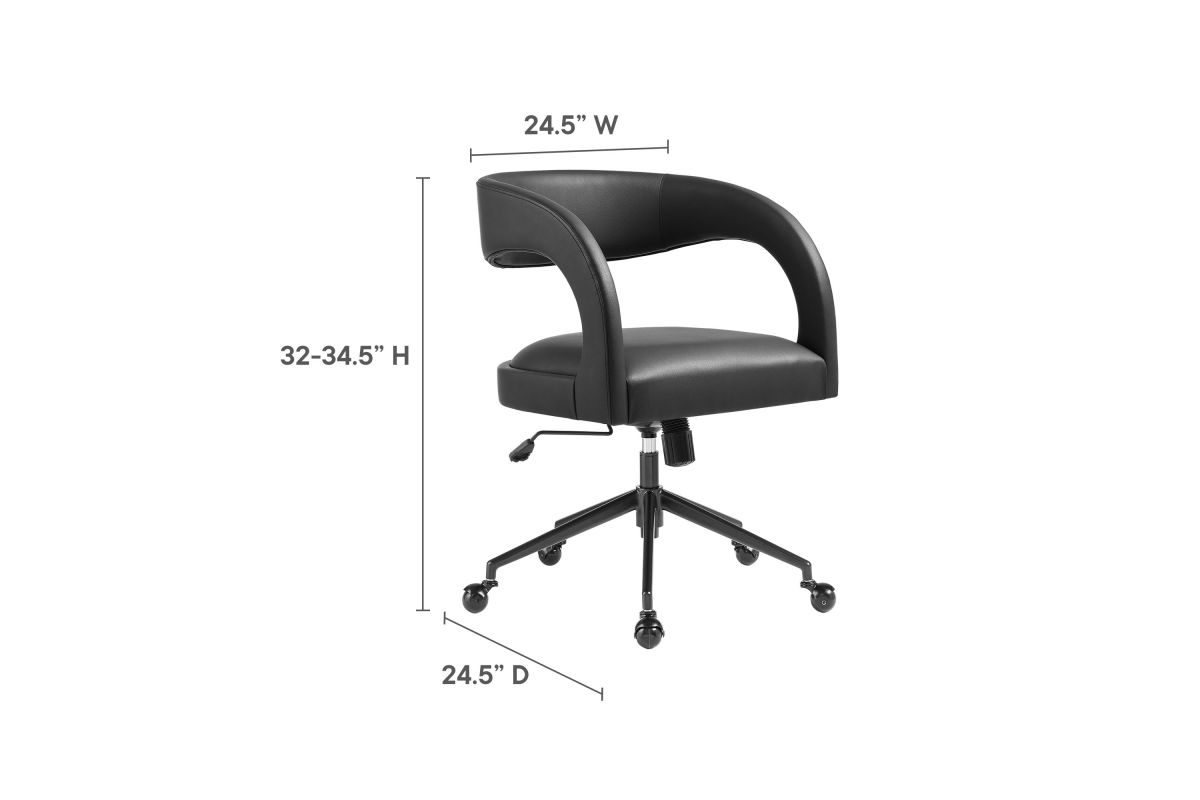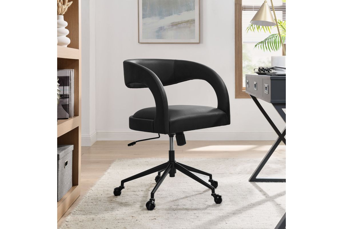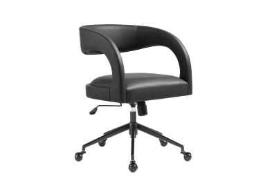 Experience the perfect blend of modern sophistication and luxurious comfort with the Pinnacle Faux Leather Home Office Desk Chair. This barrel office armchair showcases a distinct silhouette with a curved backrest and open design, adding sleek flair to your home office, study, or vanity space. Upholstered in soft, vegan leather, this adjustable height office chair offers a plush seating experience while elevating your workspace aesthetic. The black powder-coated tubular base features smooth-rolling rollerball casters for easy mobility, and the adjustable seat is equipped with a gas lift and tilt tension control for personalized comfort. With minimal assembly required, the Pinnacle Faux Leather Office Chair delivers both style and practicality for any workspace. Weight Capacity: 299 lbs.