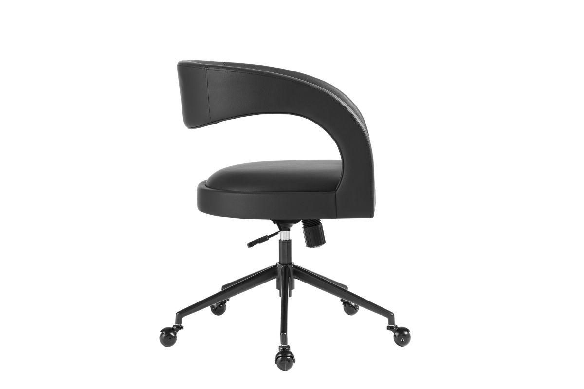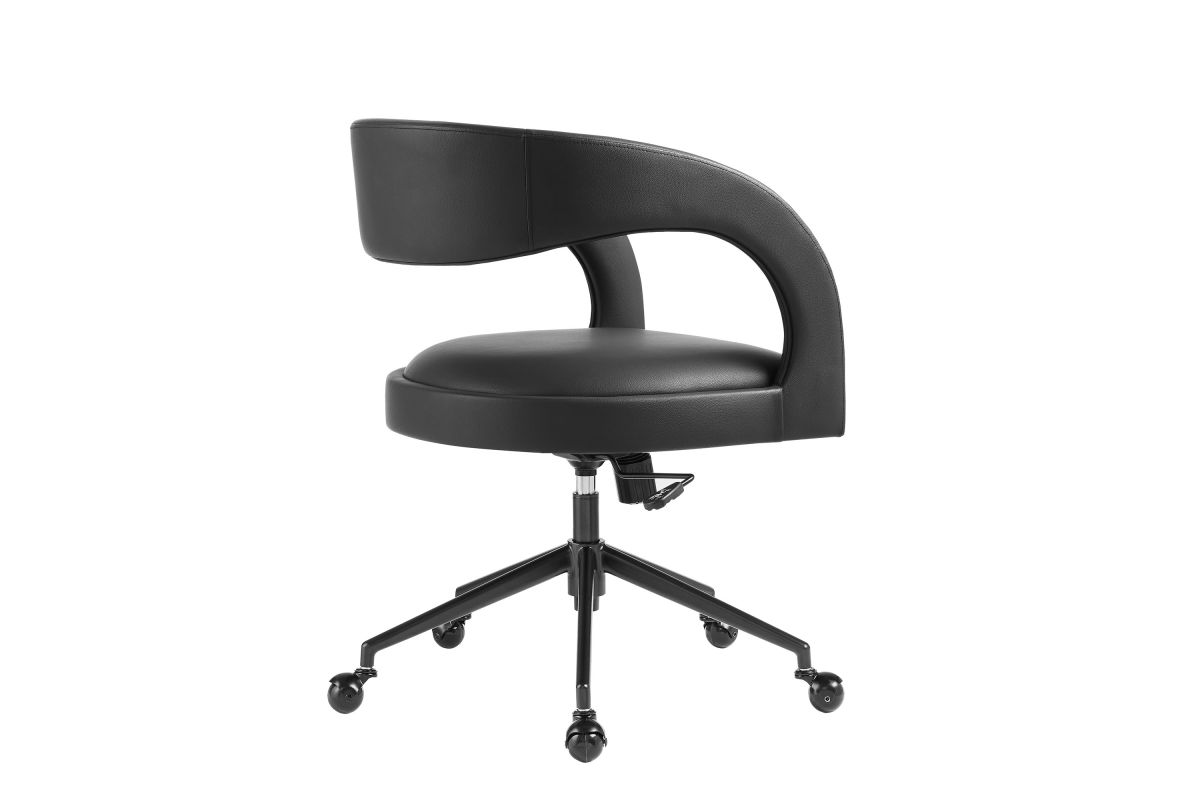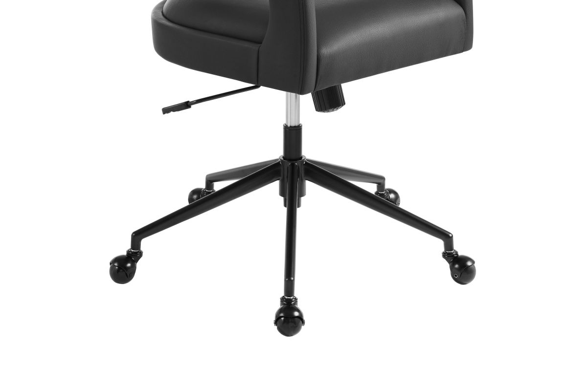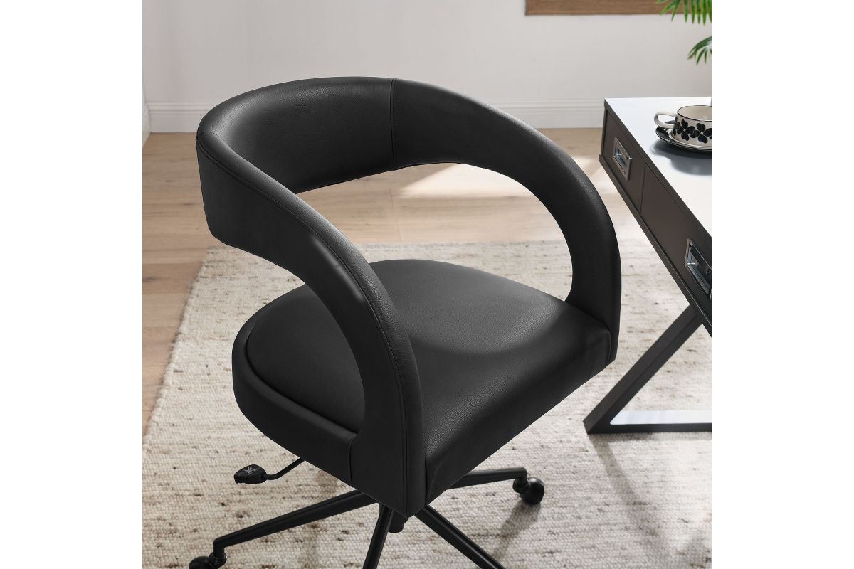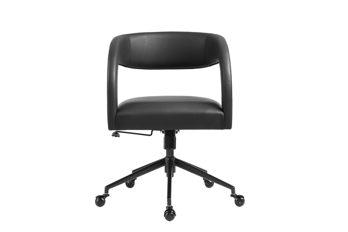 Experience the perfect blend of modern sophistication and luxurious comfort with the Pinnacle Faux Leather Home Office Desk Chair. This barrel office armchair showcases a distinct silhouette with a curved backrest and open design, adding sleek flair to your home office, study, or vanity space. Upholstered in soft, vegan leather, this adjustable height office chair offers a plush seating experience while elevating your workspace aesthetic. The black powder-coated tubular base features smooth-rolling rollerball casters for easy mobility, and the adjustable seat is equipped with a gas lift and tilt tension control for personalized comfort. With minimal assembly required, the Pinnacle Faux Leather Office Chair delivers both style and practicality for any workspace. Weight Capacity: 299 lbs.