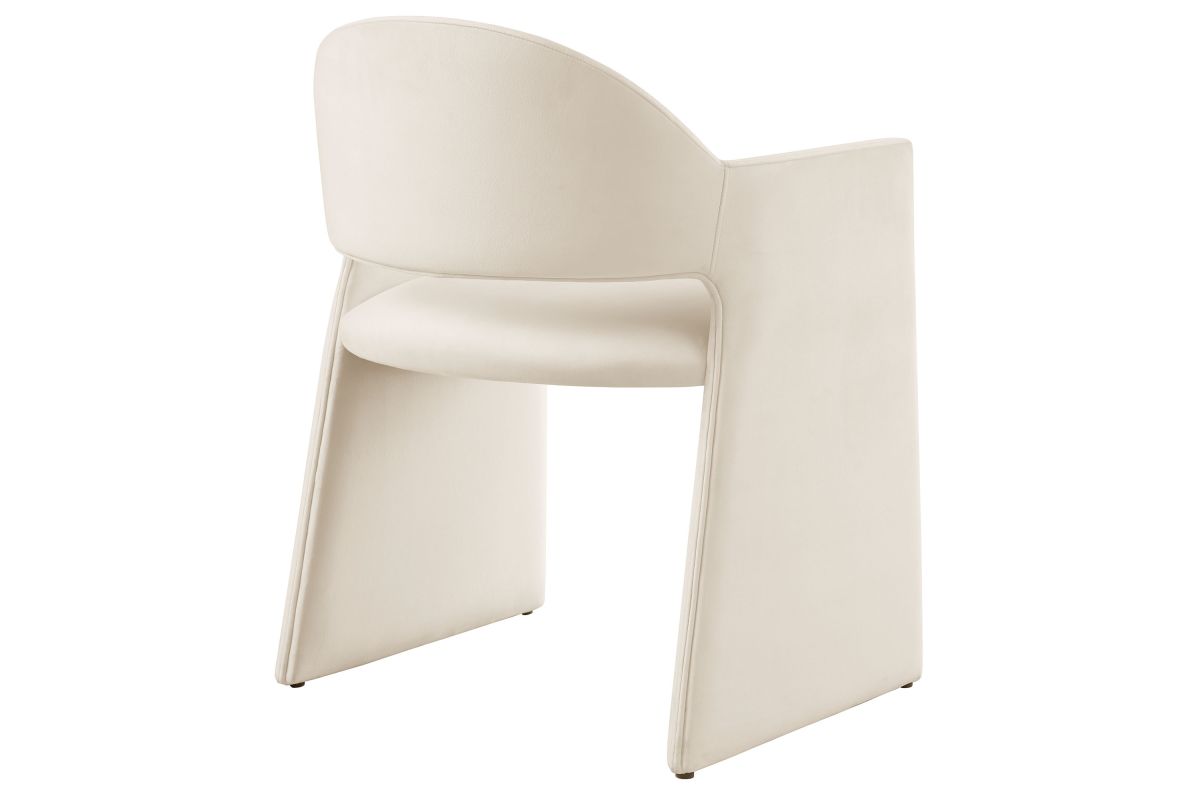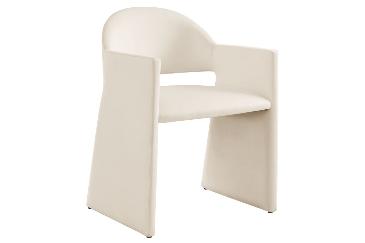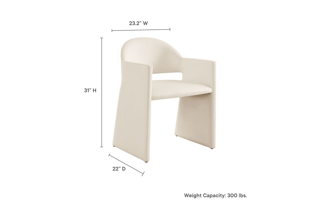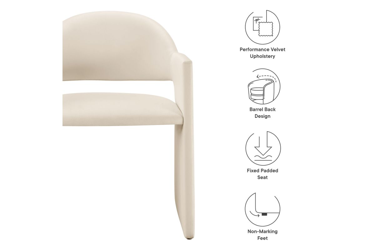 The Talia Performance Velvet Dining Chair is a stunning example of modern design, blending clean lines with luxurious comfort. Whether as a stylish living room accent chair, a statement piece in the dining area, or even a chic office accent chair, the Talia Barrel Back Dining Chair offers both timeless style and versatility. Built on a sturdy bentwood frame, this dining chair with arms is fully upholstered in soft, stain-resistant performance velvet for a premium feel. Its elegantly curved backrest flows seamlessly into wide, angular armrests that extend down to the floor, creating a sculptural look that's perfect for minimalist and contemporary spaces. The open-back design of this curved dining chair provides a light and airy feel, while the generously padded seat ensures lasting comfort. Completing the design, floor-protecting foot pins are included to prevent scratches, making it easy to move and enjoy without worry. The Talia Velvet Armchair arrives fully assembled, ready to elevate your space. Weight Capacity: 300 lbs.