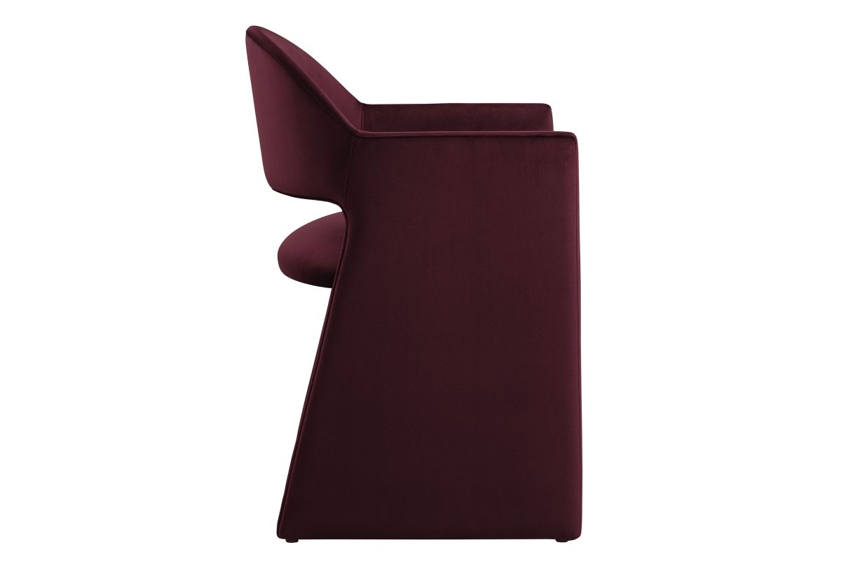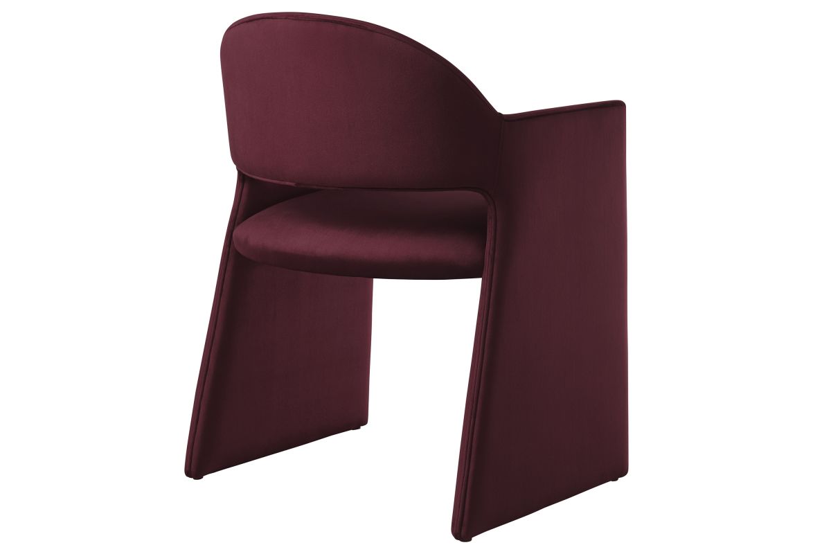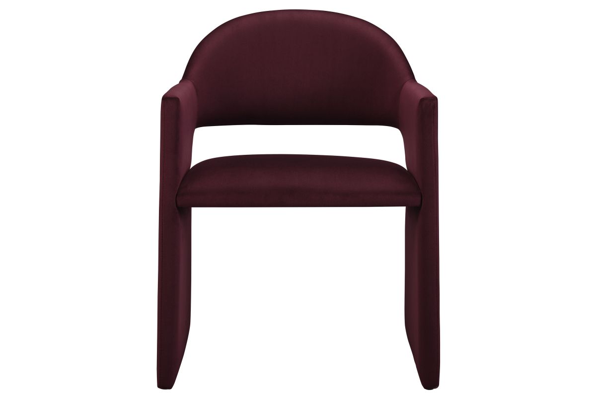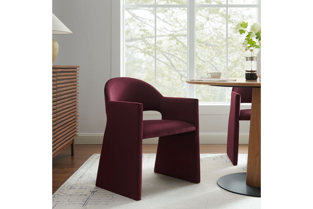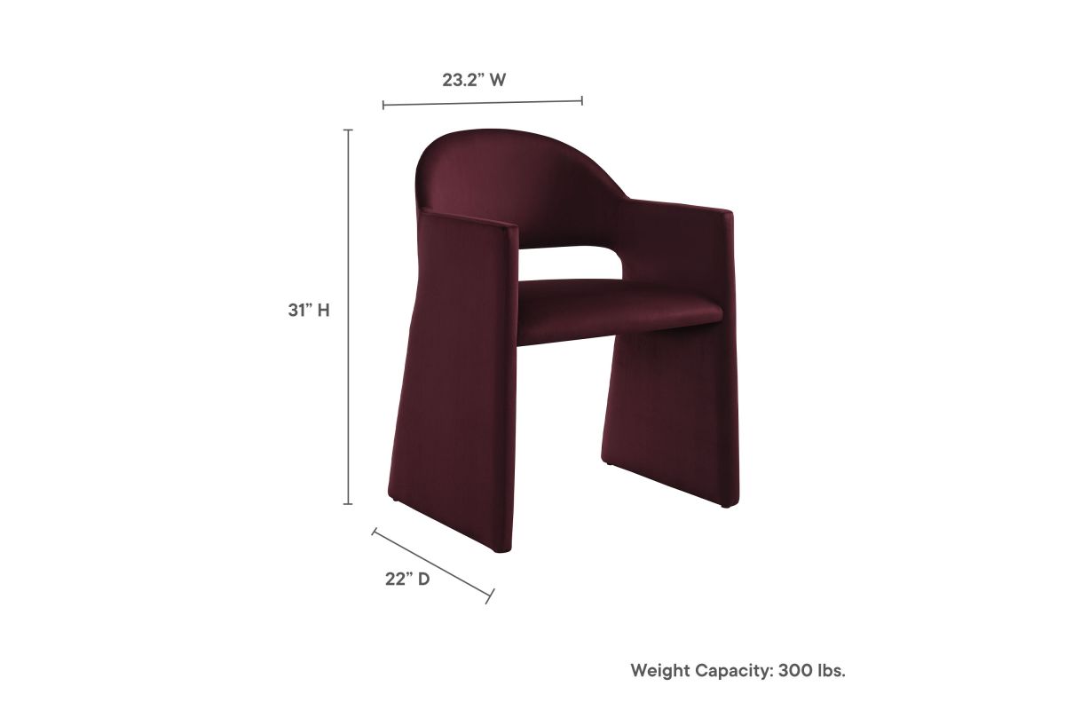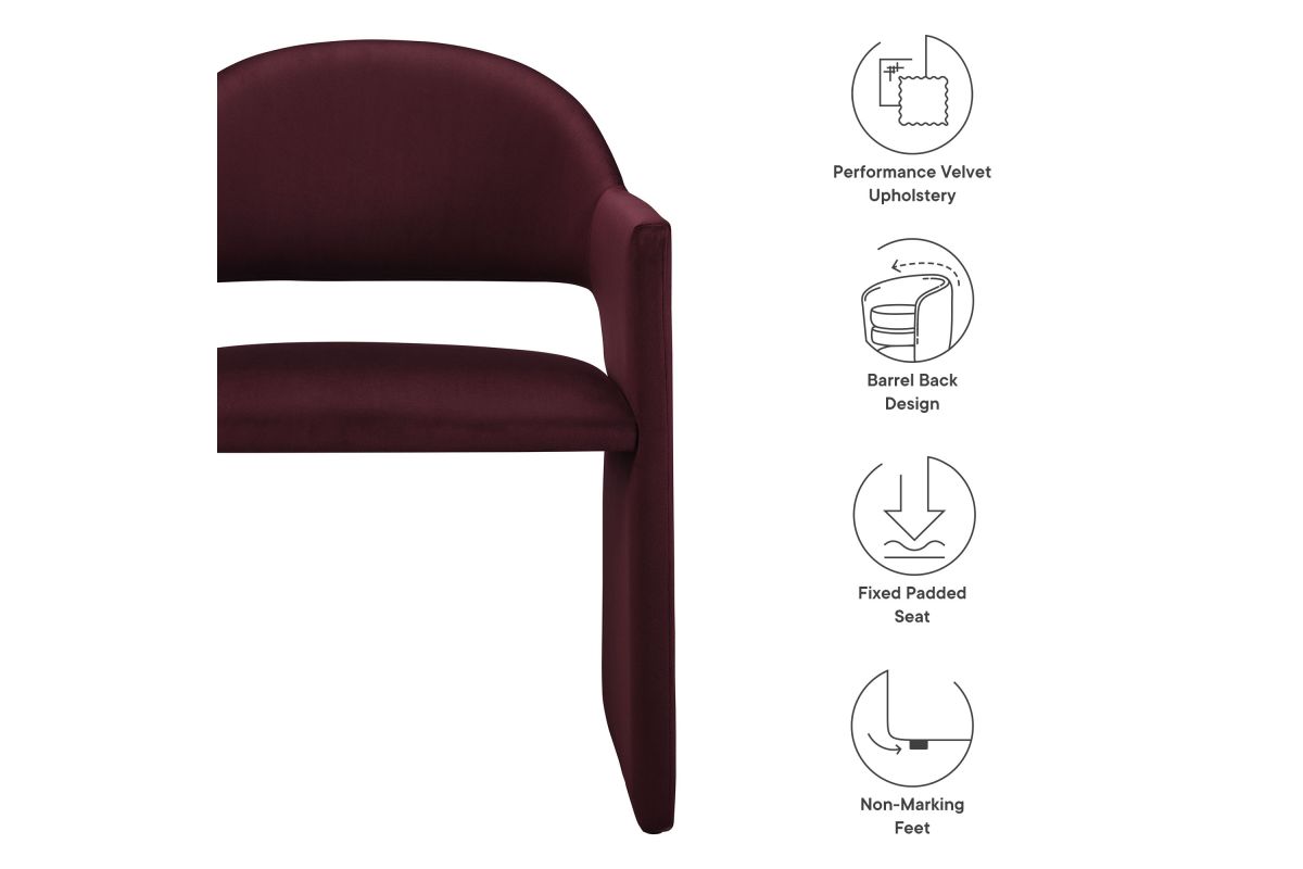 The Talia Performance Velvet Dining Chair is a stunning example of modern design, blending clean lines with luxurious comfort. Whether as a stylish living room accent chair, a statement piece in the dining area, or even a chic office accent chair, the Talia Barrel Back Dining Chair offers both timeless style and versatility. Built on a sturdy bentwood frame, this dining chair with arms is fully upholstered in soft, stain-resistant performance velvet for a premium feel. Its elegantly curved backrest flows seamlessly into wide, angular armrests that extend down to the floor, creating a sculptural look that's perfect for minimalist and contemporary spaces. The open-back design of this curved dining chair provides a light and airy feel, while the generously padded seat ensures lasting comfort. Completing the design, floor-protecting foot pins are included to prevent scratches, making it easy to move and enjoy without worry. The Talia Velvet Armchair arrives fully assembled, ready to elevate your space. Weight Capacity: 300 lbs.