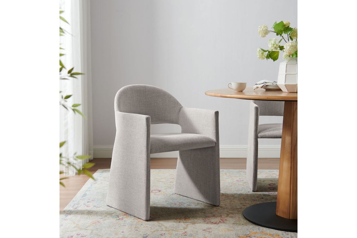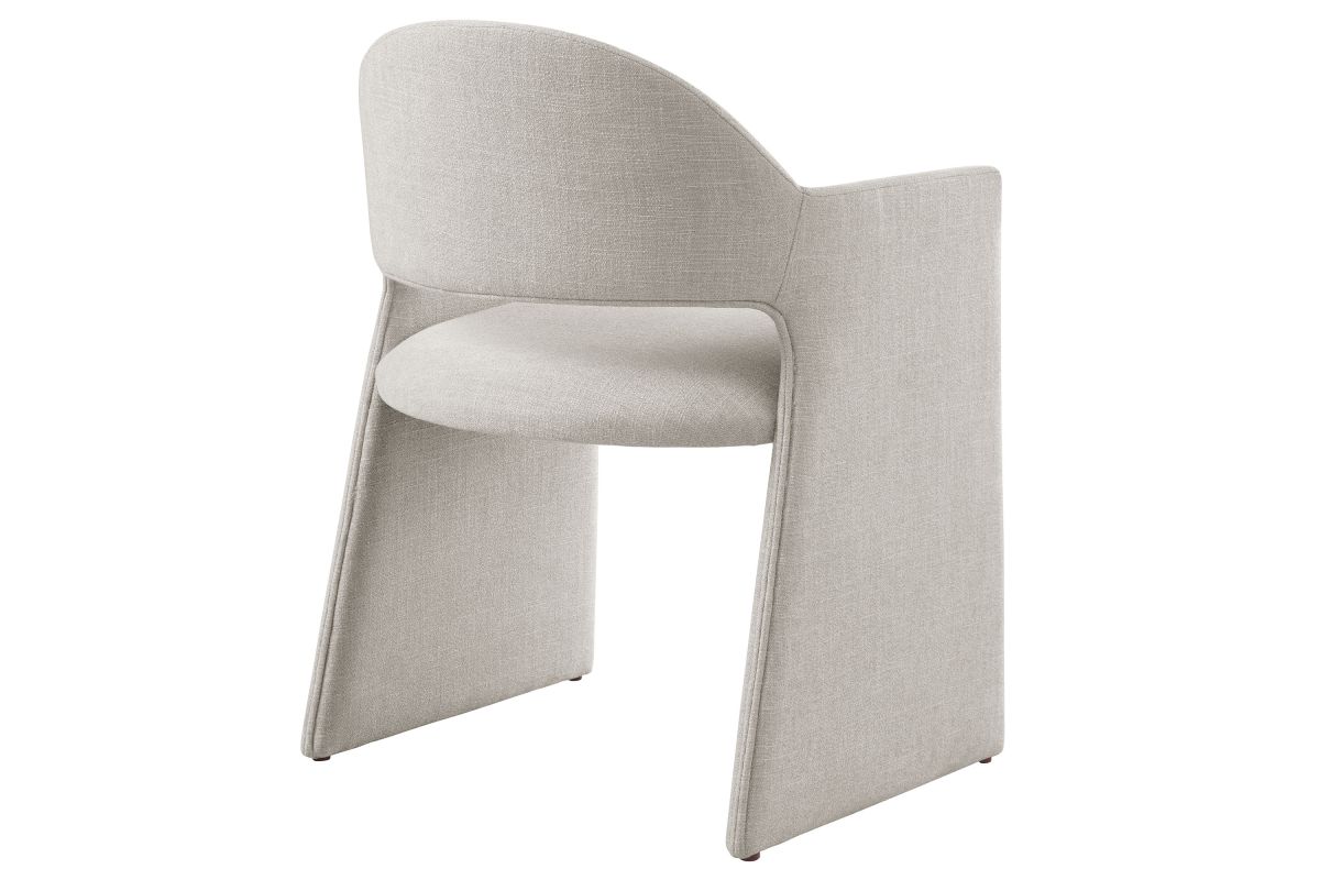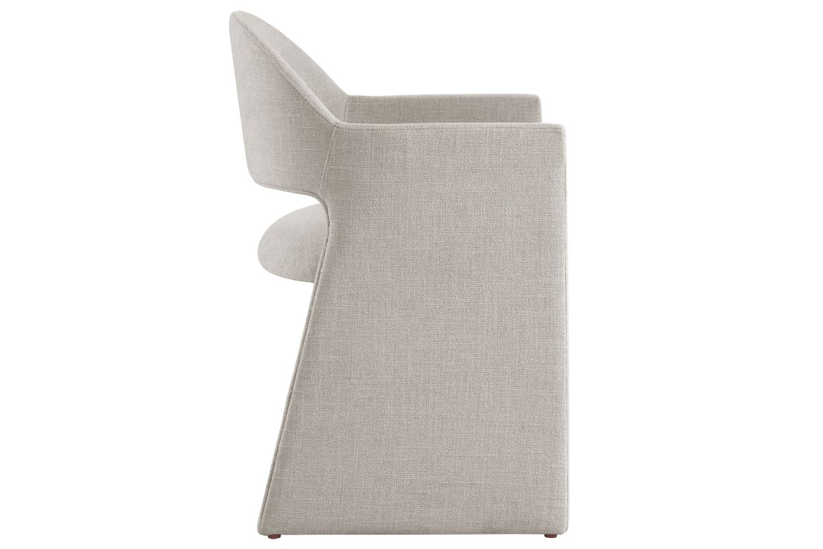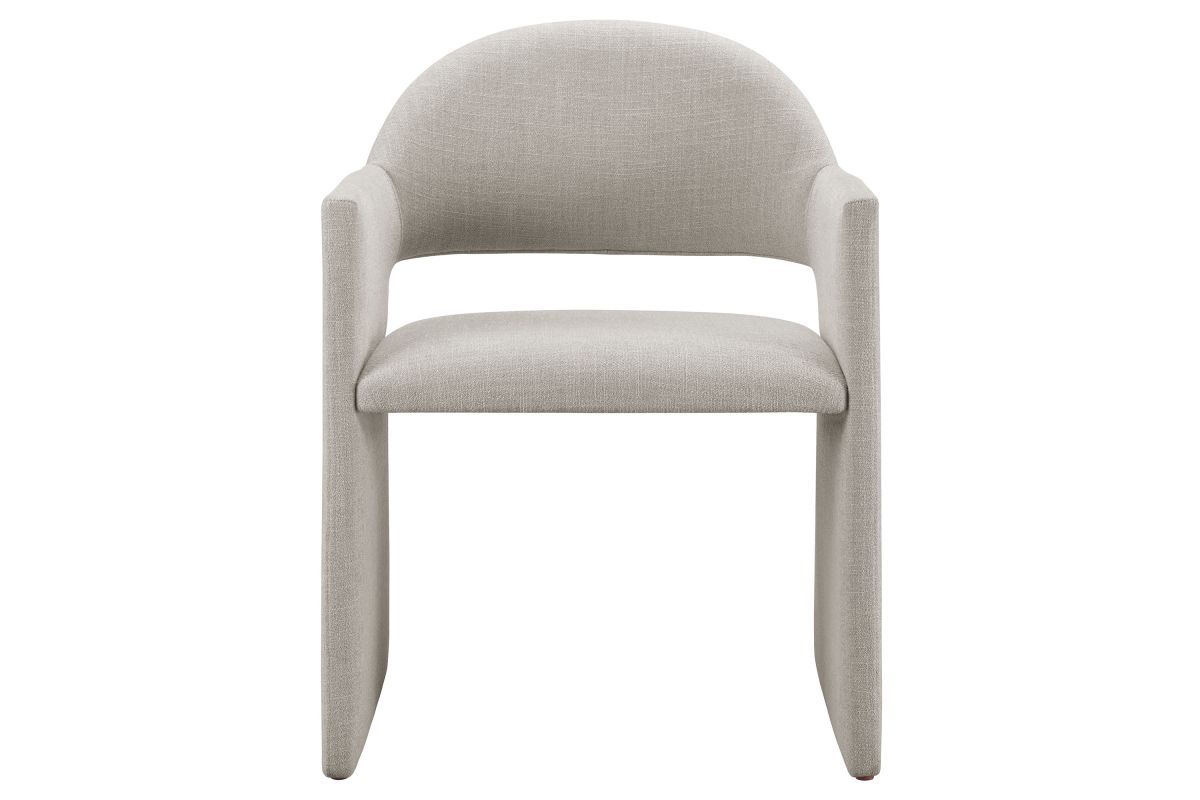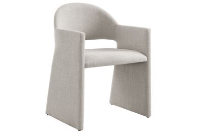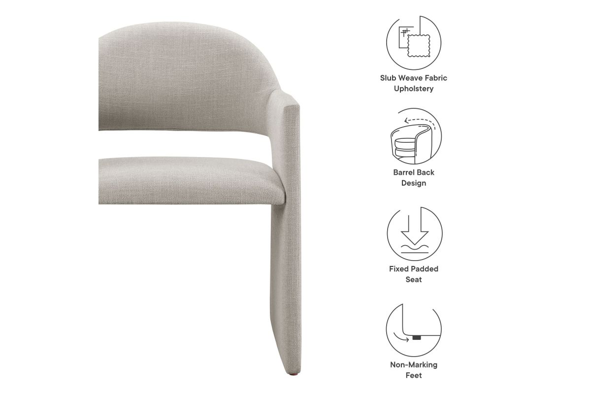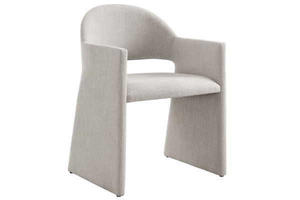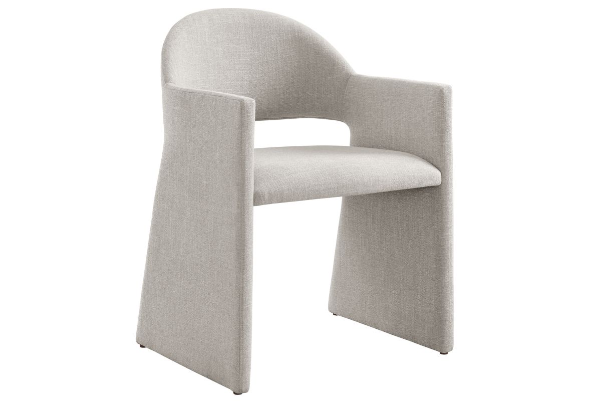 The Talia Upholstered Dining Chair is a stunning example of modern design, blending clean lines with luxurious comfort. Whether as a stylish living room accent chair, a statement piece in the dining area, or even a chic office accent chair, the Talia Barrel Back Dining Chair offers both timeless style and versatility. Built on a sturdy bentwood frame, this dining chair with arms is fully upholstered in soft slub weave fabric for a premium feel. Its elegantly curved backrest flows seamlessly into angular armrests that extend down to the floor, creating a sculptural look that's perfect for minimalist and contemporary spaces. The open-back design of this curved dining chair provides a light and airy feel, while the generously padded seat ensures lasting comfort. Completing the design, floor-protecting foot pins are included to prevent scratches, making it easy to move and enjoy without worry. The Talia Dining Armchair arrives fully assembled, ready to elevate your space. Weight Capacity: 300 lbs.