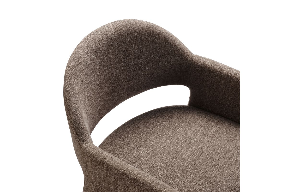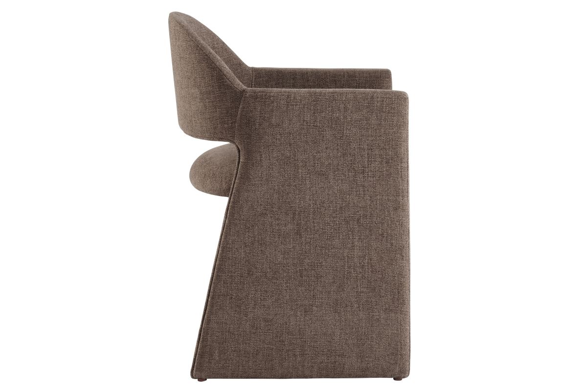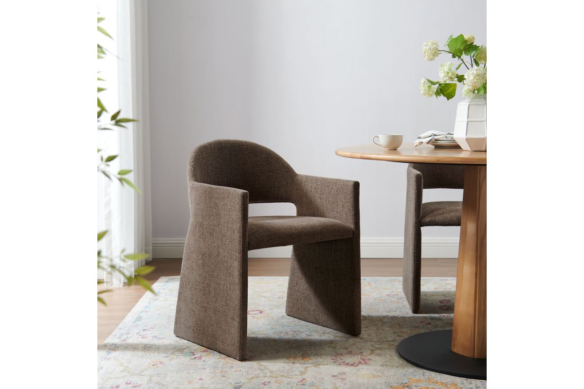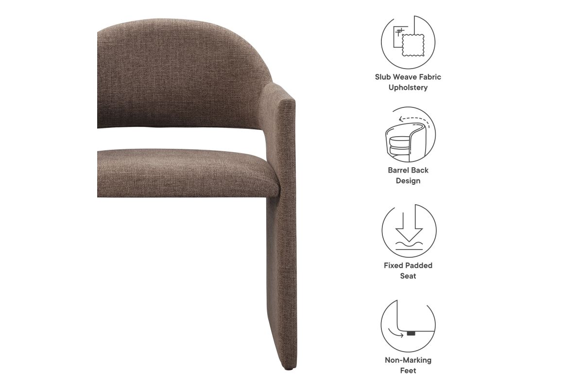 The Talia Upholstered Dining Chair is a stunning example of modern design, blending clean lines with luxurious comfort. Whether as a stylish living room accent chair, a statement piece in the dining area, or even a chic office accent chair, the Talia Barrel Back Dining Chair offers both timeless style and versatility. Built on a sturdy bentwood frame, this dining chair with arms is fully upholstered in soft slub weave fabric for a premium feel. Its elegantly curved backrest flows seamlessly into angular armrests that extend down to the floor, creating a sculptural look that's perfect for minimalist and contemporary spaces. The open-back design of this curved dining chair provides a light and airy feel, while the generously padded seat ensures lasting comfort. Completing the design, floor-protecting foot pins are included to prevent scratches, making it easy to move and enjoy without worry. The Talia Dining Armchair arrives fully assembled, ready to elevate your space. Weight Capacity: 300 lbs.