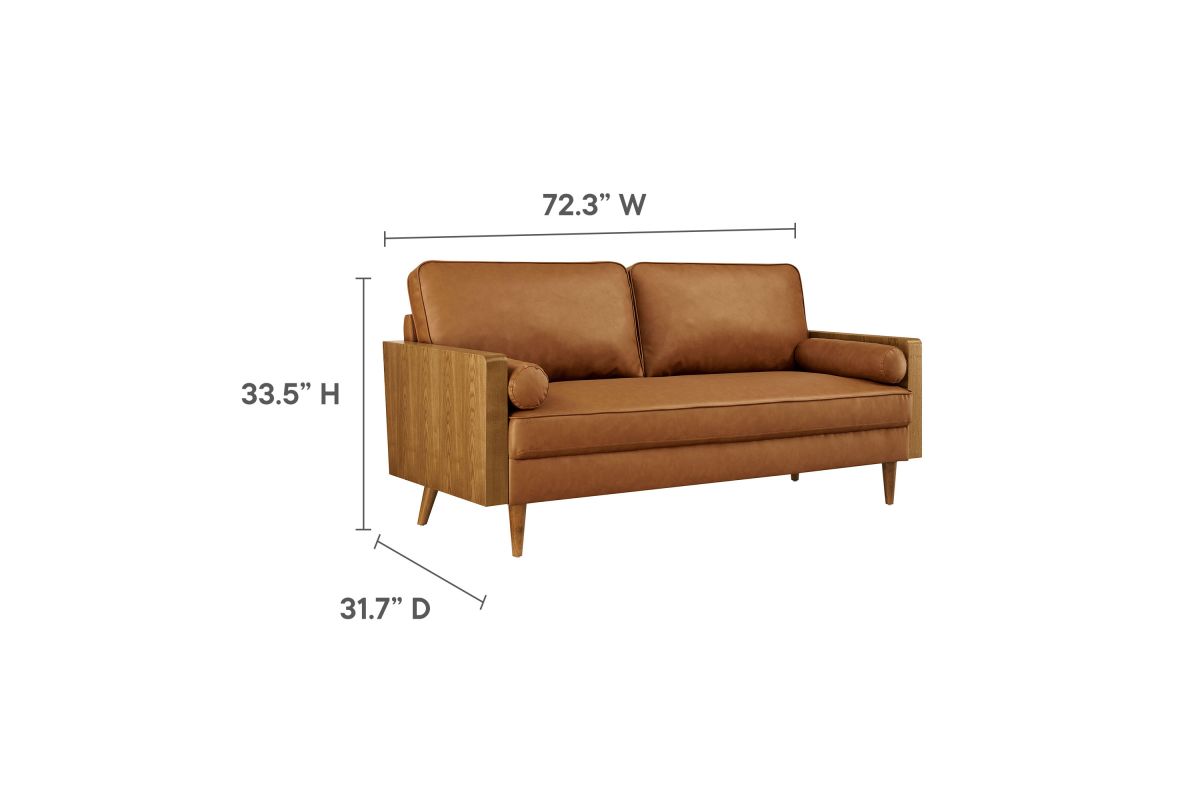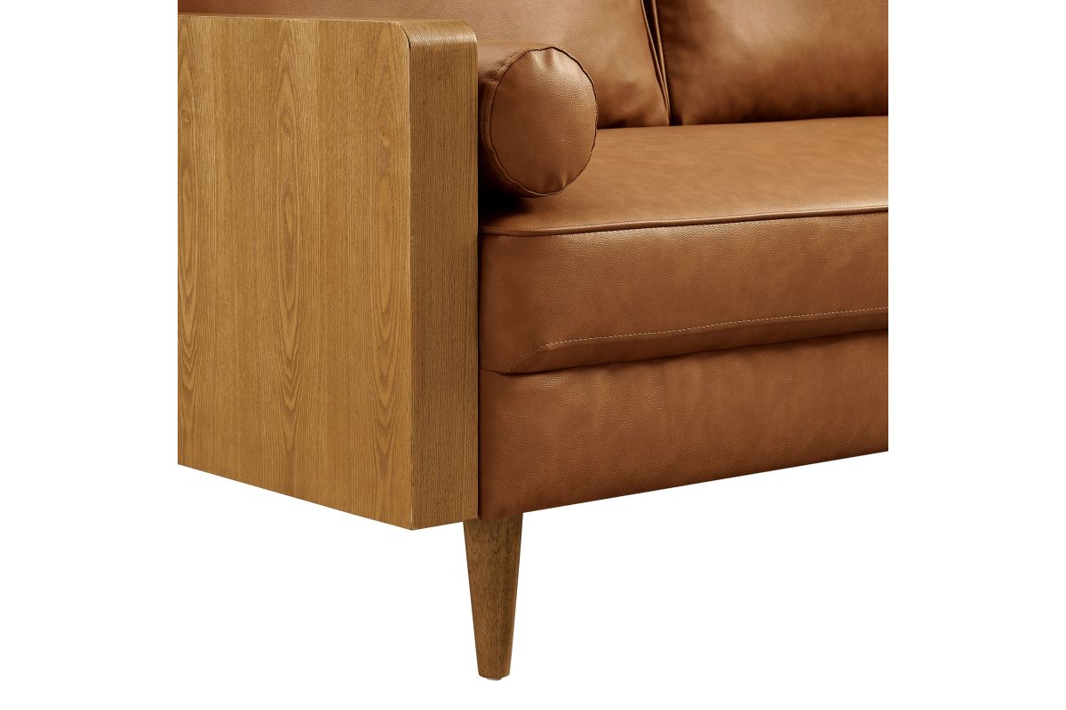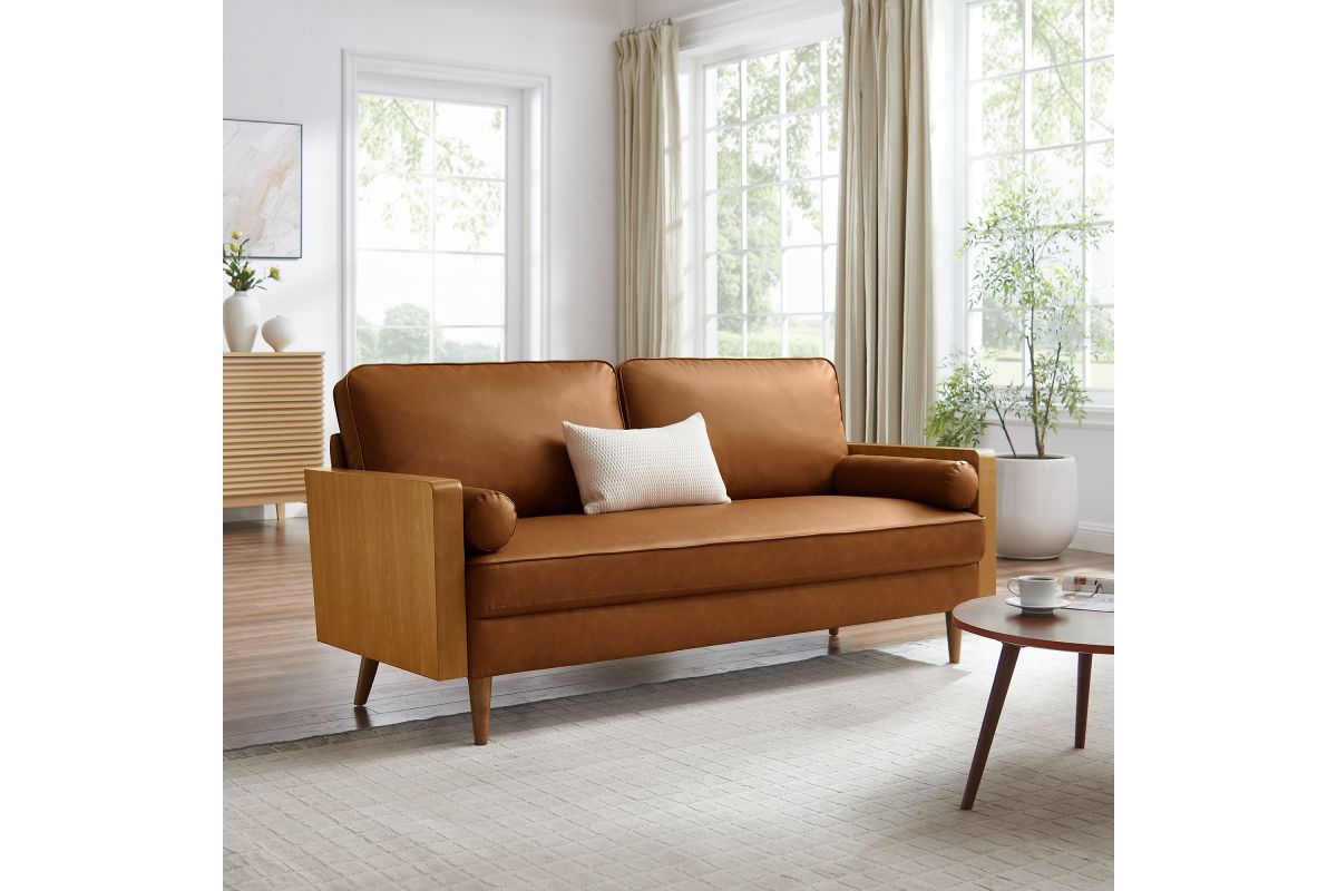 A statement piece for the discerning home, the Kellan 72-Inch Vegan Leather Sofa brings together style and comfort in an updated retro design. This faux leather sofa couch with wood legs is upholstered in smooth vegan leather, offering a chic, sleek look. The beautiful wood grain armrests, crafted from rich veneer, add a touch of natural warmth to its mid century modern contemporary aesthetic. Supported by tapered wood legs with non-marking floor glides, this deep seat sofa offers both style and practicality, protecting your flooring while enhancing the living room, bedroom, office, or reception area's ambiance. High-density foam padding and zigzag spring support provide a premium seating experience, while the down feather blend of the back and bolster cushions add an extra layer of luxury. Whether as a mid century leather office couch or a deep seat couch for relaxing, Kellan is a versatile faux leather sofa that will elevate your living room with its refined style and supportive comfort. Assembly required. 3 Seater Sofa Weight Capacity: 893 lbs.