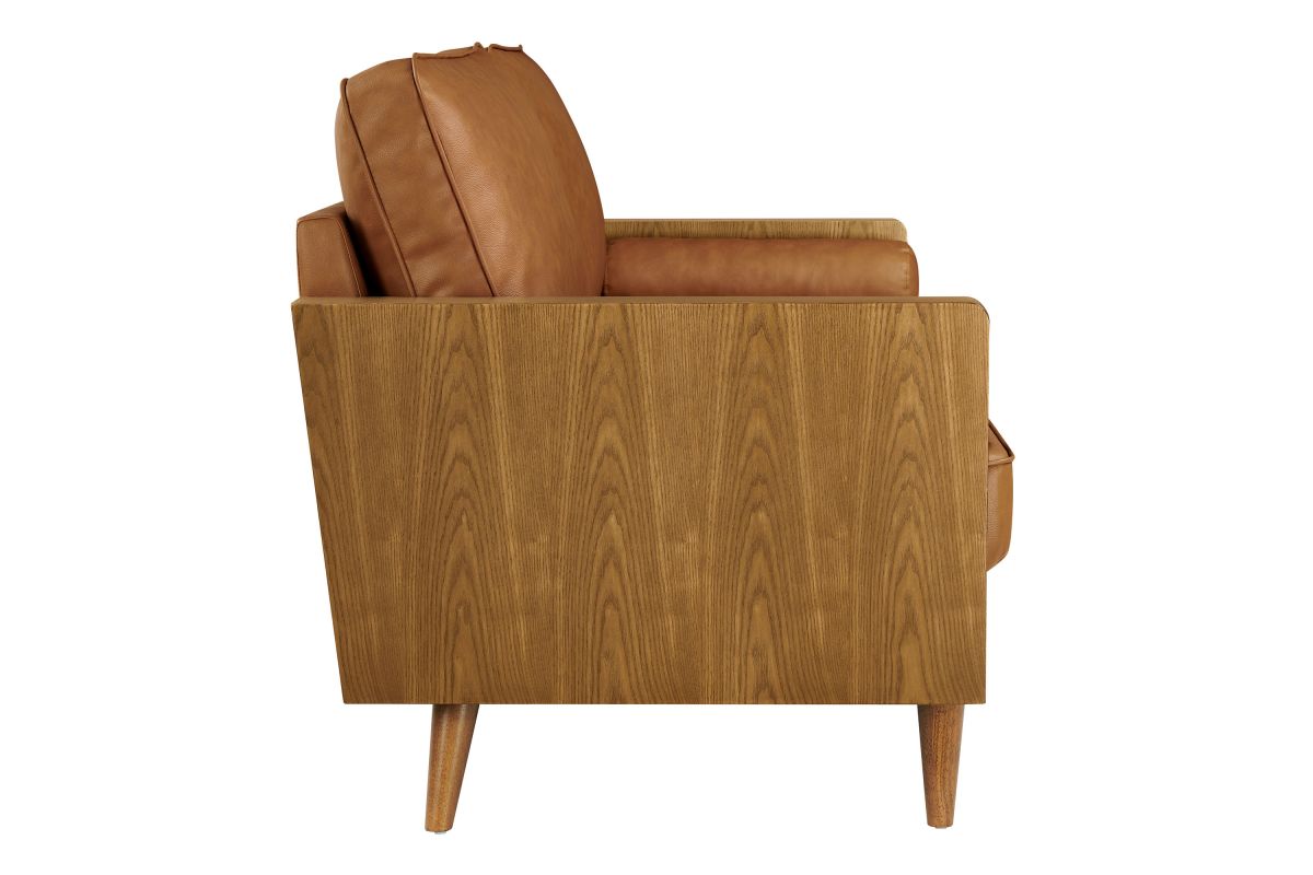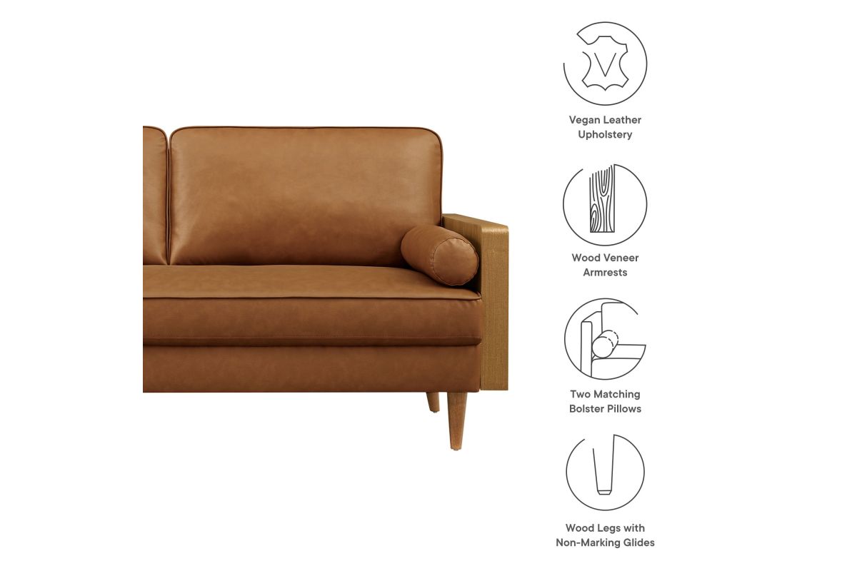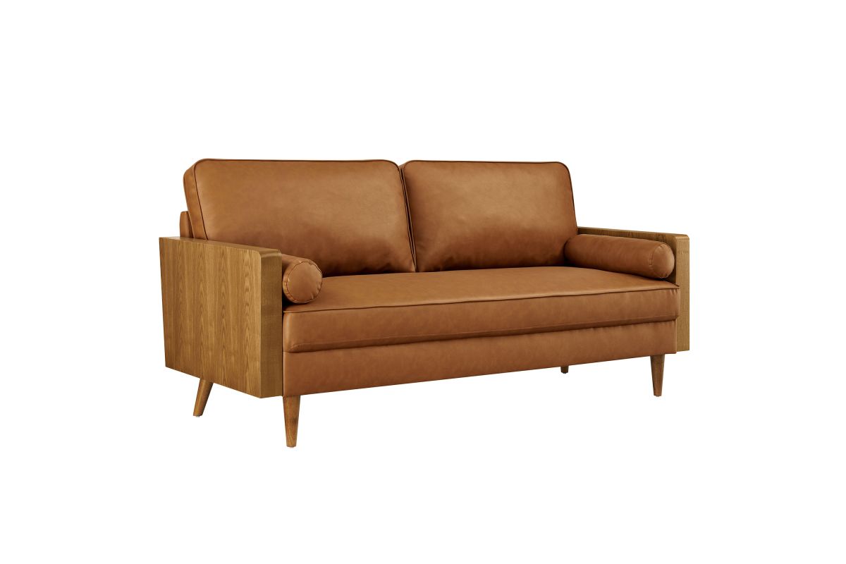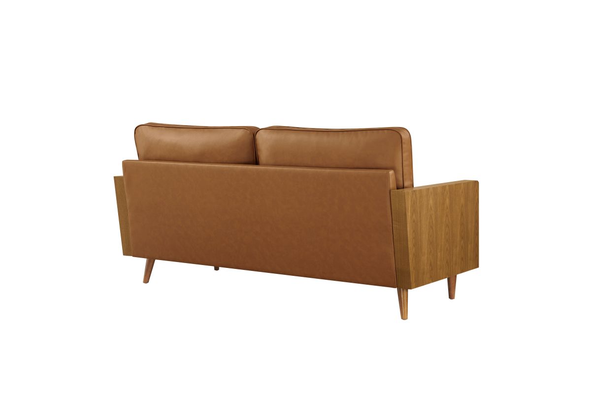 A statement piece for the discerning home, the Kellan 72-Inch Vegan Leather Sofa brings together style and comfort in an updated retro design. This faux leather sofa couch with wood legs is upholstered in smooth vegan leather, offering a chic, sleek look. The beautiful wood grain armrests, crafted from rich veneer, add a touch of natural warmth to its mid century modern contemporary aesthetic. Supported by tapered wood legs with non-marking floor glides, this deep seat sofa offers both style and practicality, protecting your flooring while enhancing the living room, bedroom, office, or reception area's ambiance. High-density foam padding and zigzag spring support provide a premium seating experience, while the down feather blend of the back and bolster cushions add an extra layer of luxury. Whether as a mid century leather office couch or a deep seat couch for relaxing, Kellan is a versatile faux leather sofa that will elevate your living room with its refined style and supportive comfort. Assembly required. 3 Seater Sofa Weight Capacity: 893 lbs.