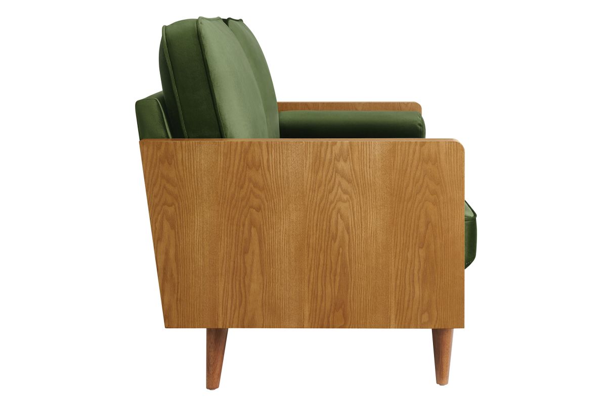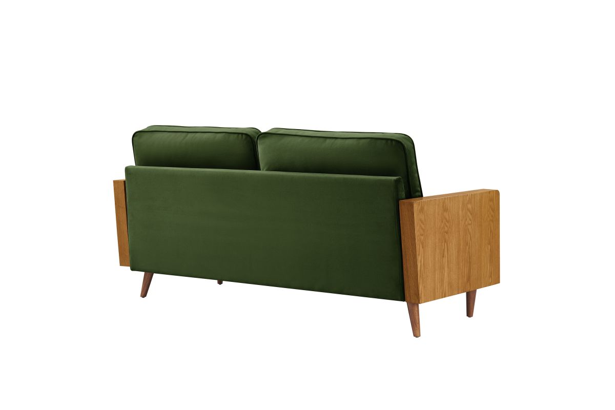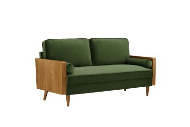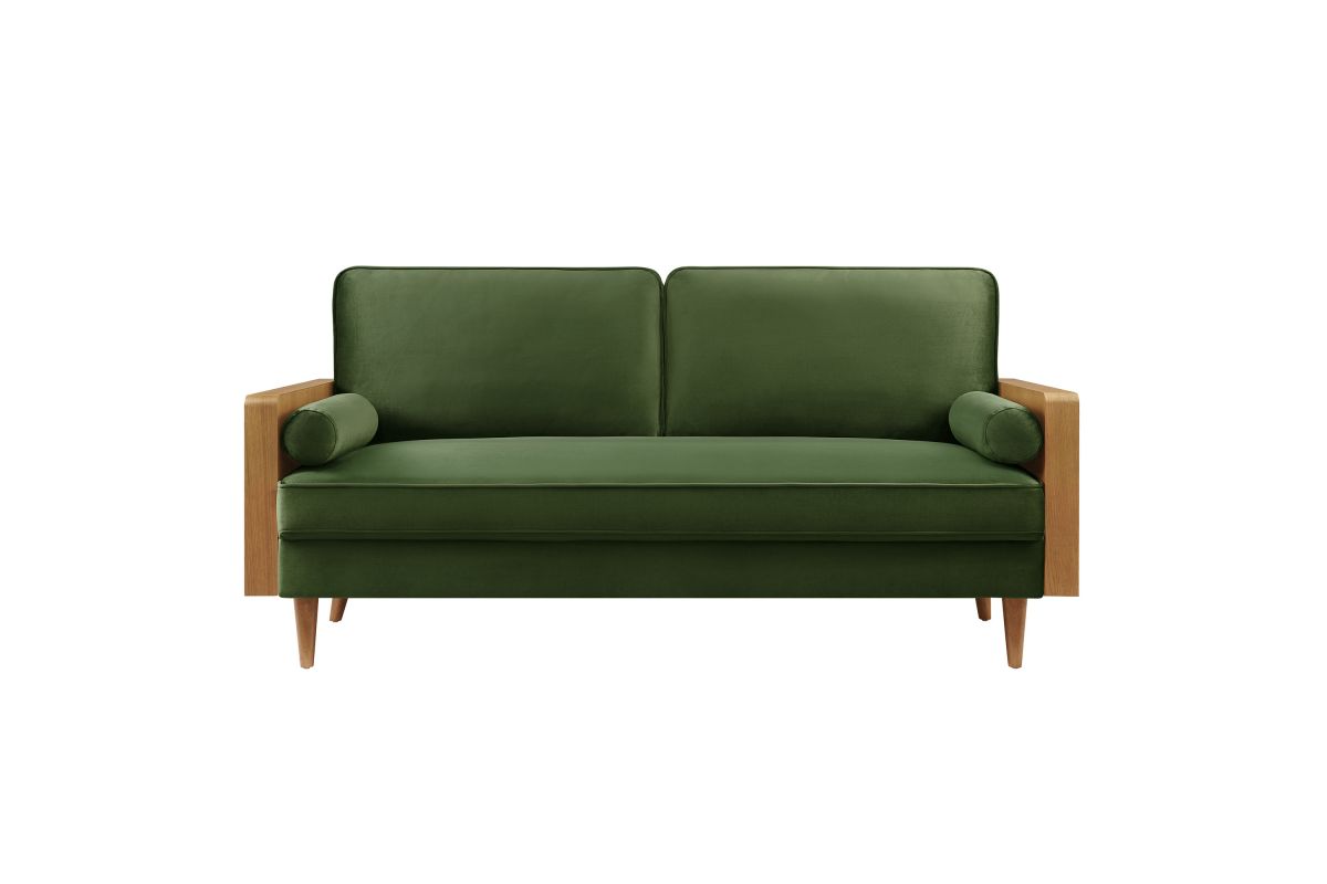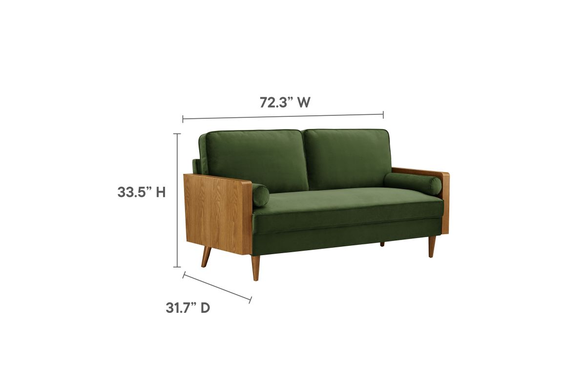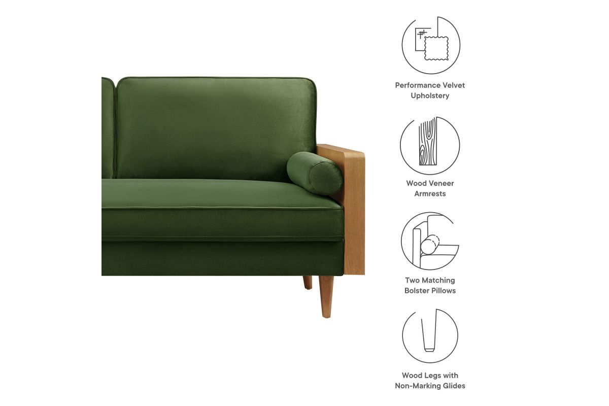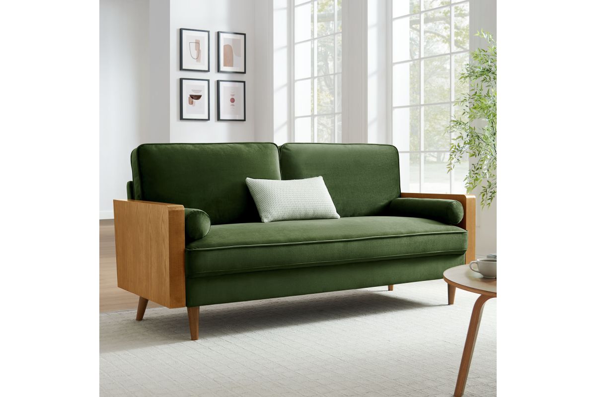 A statement piece for the discerning home, the Kellan Wood Velvet Sofa brings together style and comfort in an updated retro design. This stain-resistant couch is upholstered in luxurious performance velvet, offering a plush, sophisticated look that stands up to everyday life. The beautiful wood grain armrests, crafted from rich veneer, add a touch of natural warmth to its mid century modern contemporary aesthetic. Supported by tapered wood legs with non-marking floor glides, this deep seat sofa provides both style and practicality, protecting your flooring while enhancing the ambiance of your living room, bedroom, office, or reception area. High-density foam padding and zigzag spring support ensure a premium seating experience, while the down feather blend of the back and bolster cushions adds an extra layer of luxury. Whether as a mid century office couch or a plush couch for lounging, the Kellan Retro Sofa is a versatile velvet sofa that will elevate your living space with its refined style and supportive comfort. Assembly required. 3 Seater Sofa Weight Capacity: 893 lbs.