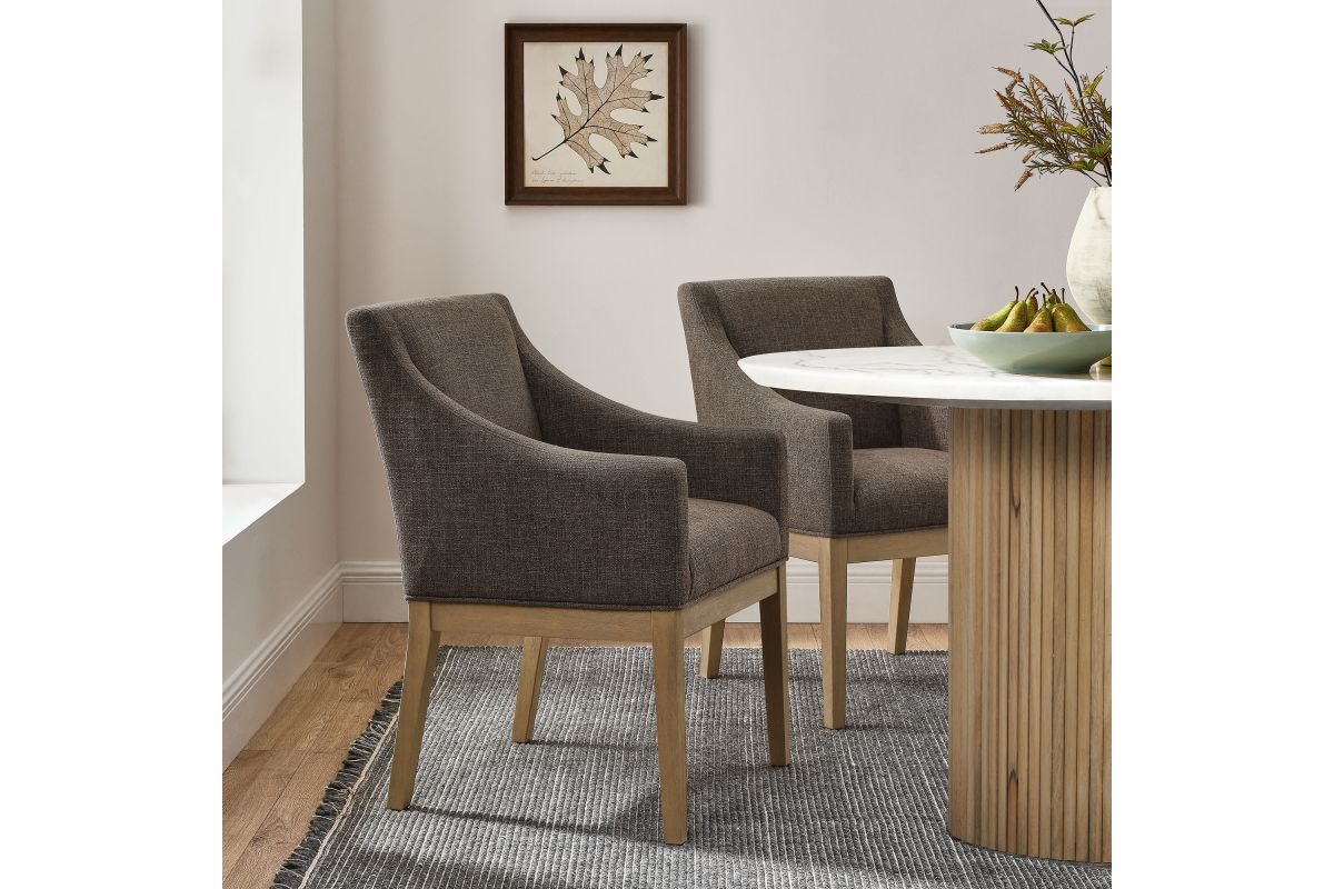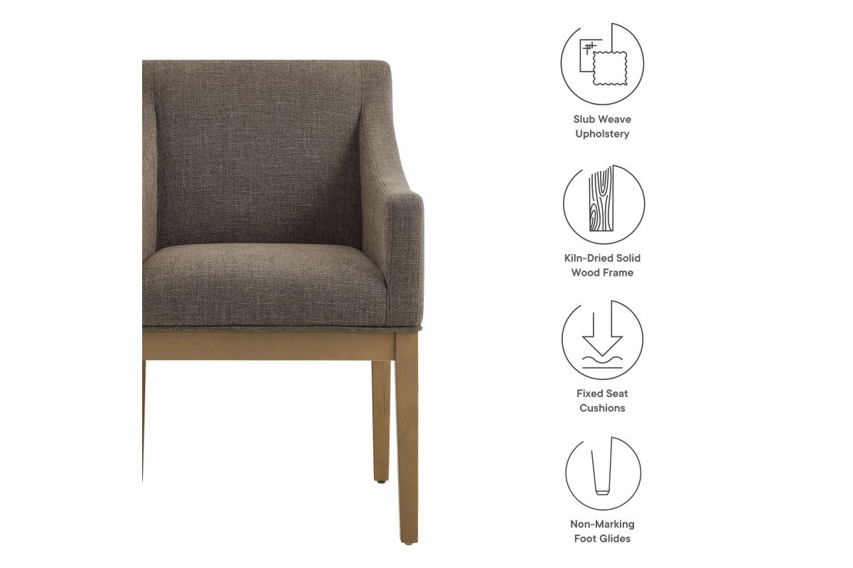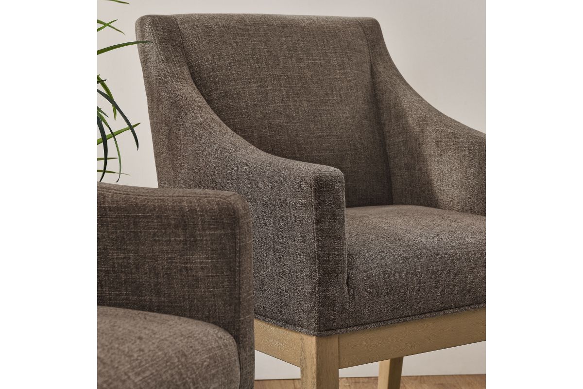 Sophisticated yet versatile, the Alton Dining Chair brings a modern touch to any dining room, kitchen, or living space. Covered in soft slub weave-style fabric, this upholstered chair's tailored profile is complemented by swooping armrests and a sleek silhouette that effortlessly blends mid-century and contemporary styles. Supported by a solid wood frame and legs, this dining chair with arms offers both stability and comfort, with foam padding for a cozy seating experience. Designed to function equally well as a dining room arm chair or a living room accent chair, Alton features non-marking plastic glides to protect your floors. Whether used around the dining table or as extra seating in a lounge area, the Alton Accent Armchair elevates your decor with its understated elegance. Assembly required. Weight Capacity: 300 lbs.