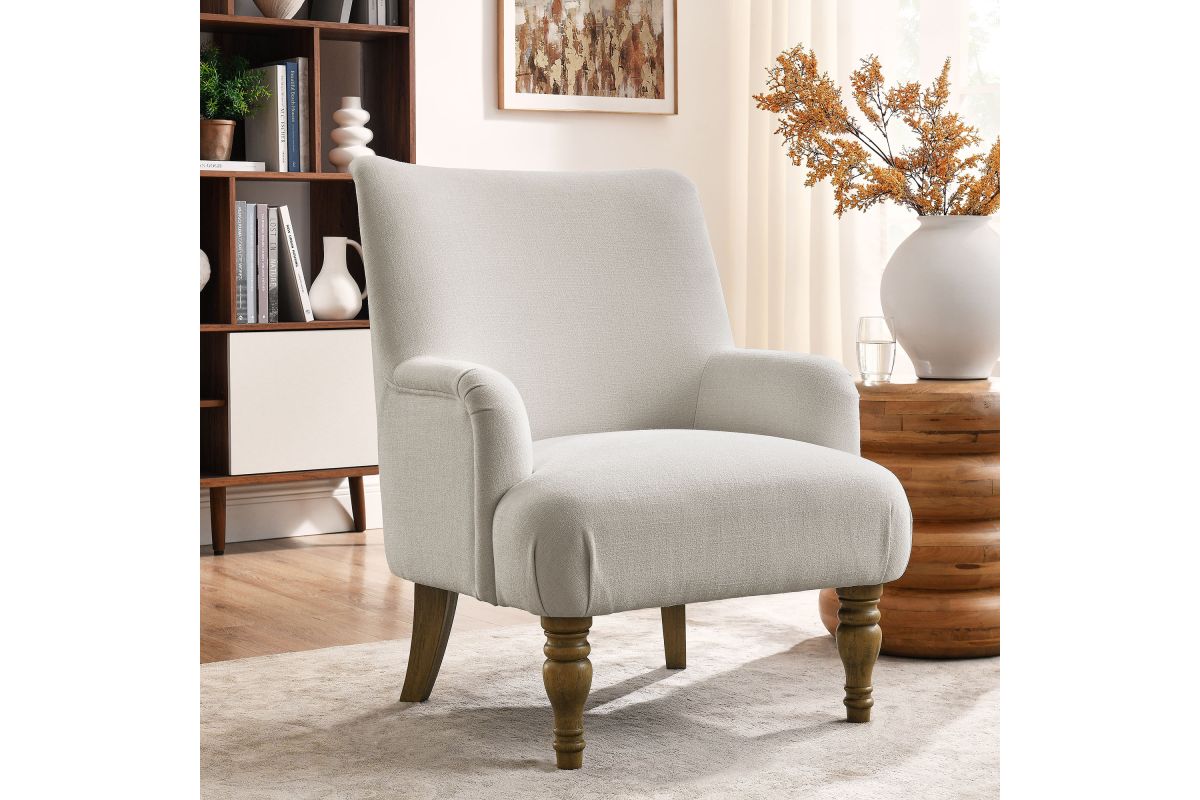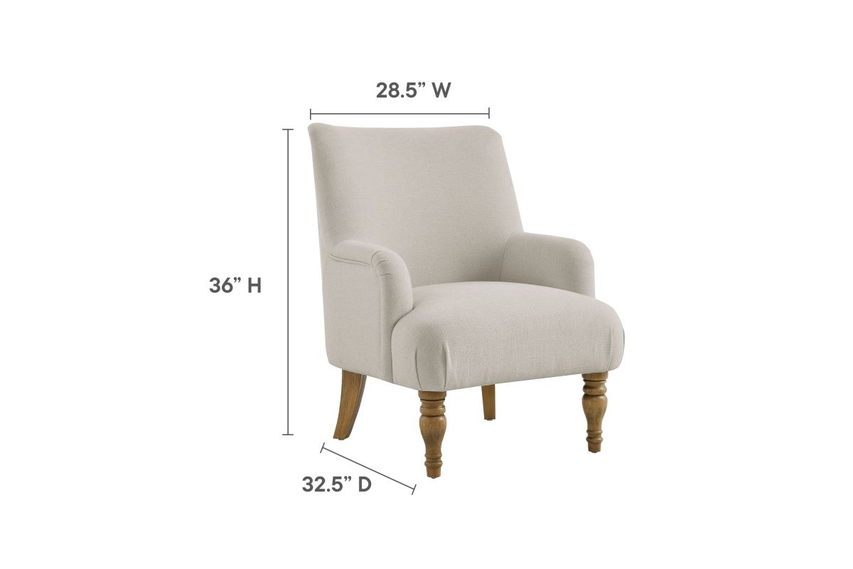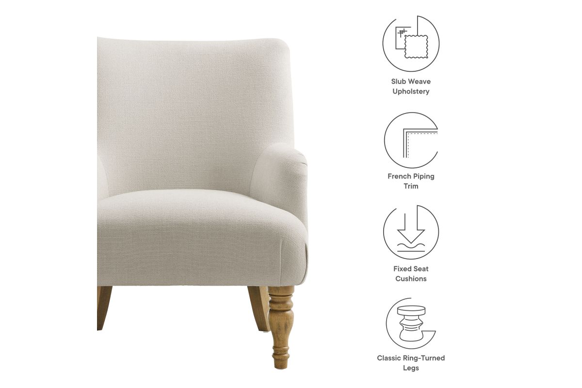Elegance and comfort come together in the Ellington Accent Armchair, a sophisticated addition to any space. This armchair features plush upholstery in a textured slub weave-style fabric, providing a refined touch and inviting comfort. The high back and French piping trim create a polished silhouette, while the foam padding ensures a cozy seating experience. Designed with two turned front legs and two saber-style back legs, this accent chair blends traditional charm with a modern flair. Whether used as a lounge chair in the living room, a reading chair in the bedroom, or a cozy corner chair, the Ellington Fabric Chair adds a touch of timeless style to your home. Assembly required. Weight Capacity: 300 lbs.