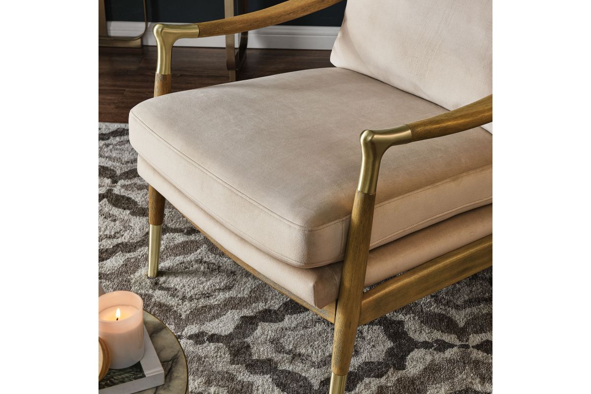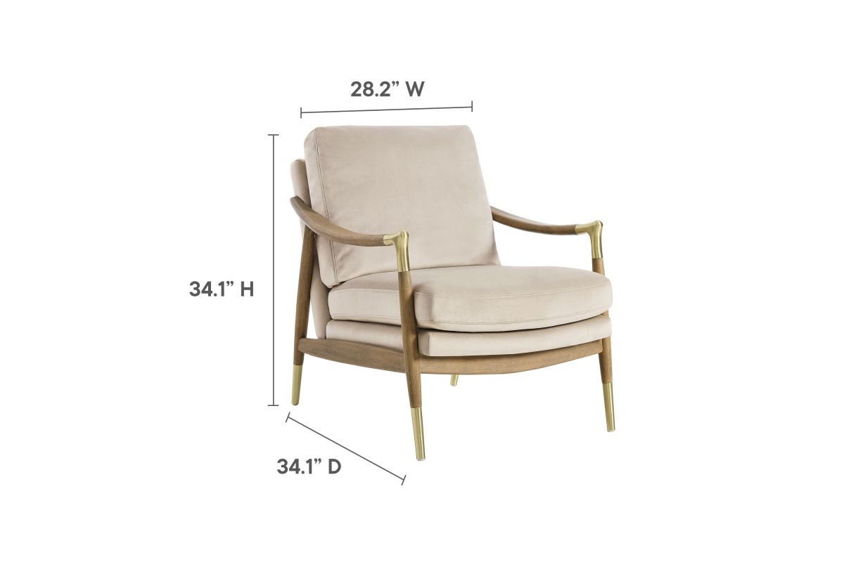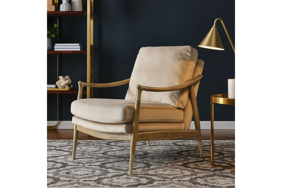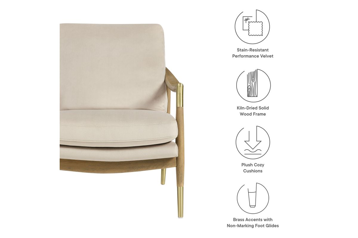 Enhance your living space with the Langford Performance Velvet Living Room Chair, where elegance meets comfort in a timeless mid-century modern design. Upholstered in stain-resistant performance velvet, this accent chair adds a sophisticated touch with its inviting, plush texture and resilient finish. Brass accents on the legs and corners of the swooped armrests bring a refined charm, highlighting the velvet chair's clean lines and classic structure. Crafted with a solid kiln-dried wood frame, this accent chair with arms is as durable as it is stylish, offering long-lasting support and comfort. Langford's cushions provide a consistent look and feel, ensuring this modern armchair remains as cozy as it is chic. Perfect for reading nooks, living rooms, or as a striking bedroom accent, the Langford Reading Nook Chair combines mid-century modern flair with modern functionality. Assembly required, with clear instructions provided for an easy setup. Weight Capacity: 300 lbs.