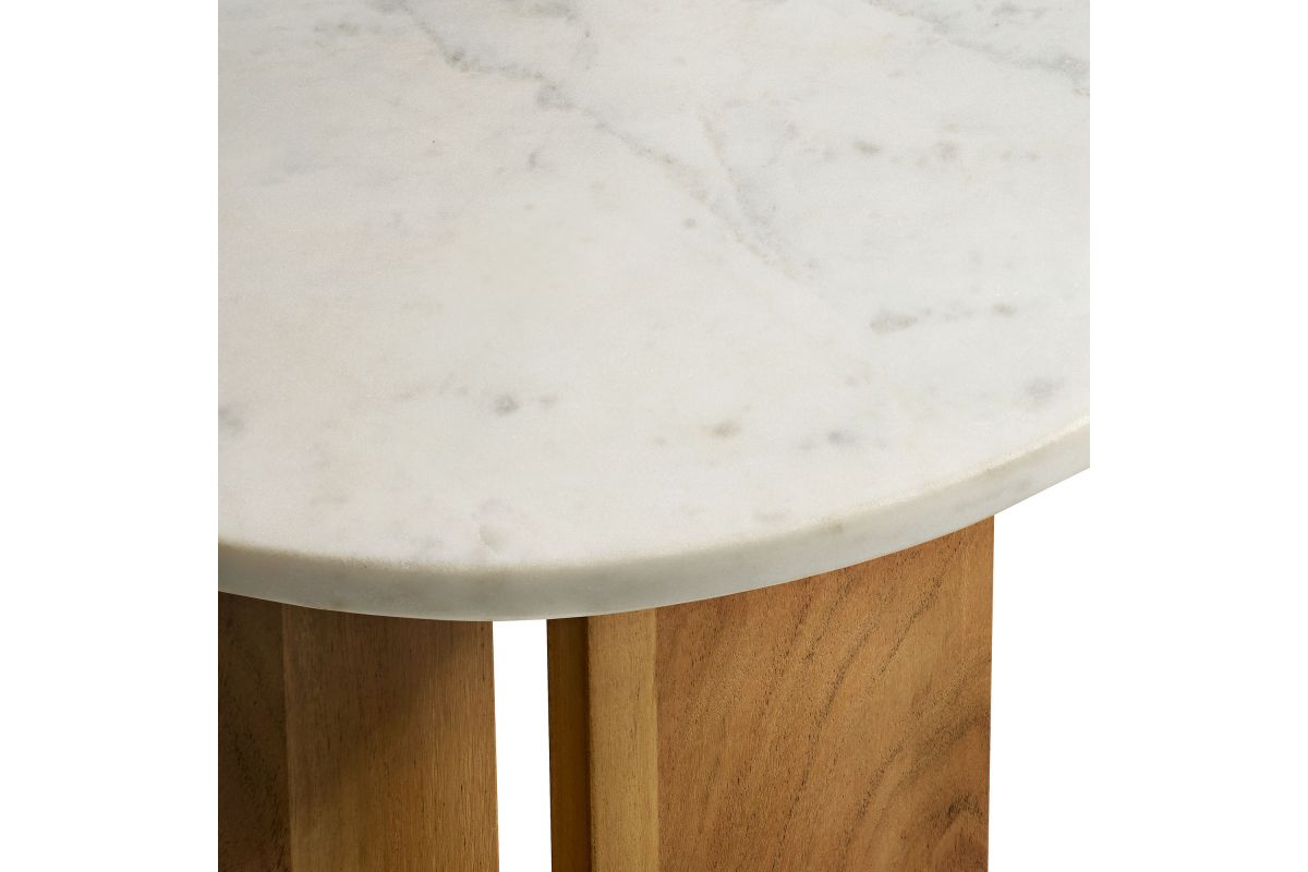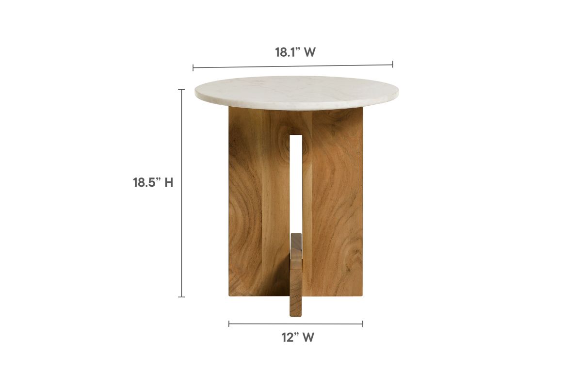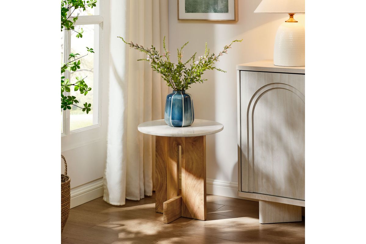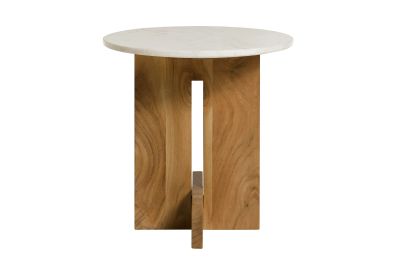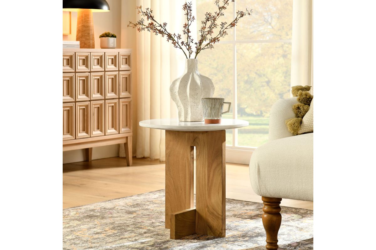 Revitalize your space with the classic-meets-modern design of the Tarin Round Side Table. Featuring a solid marble top that exudes elegance while resting on sturdy acacia wood legs, this marble round table complements a variety of interiors from mid-century modern to minimalist. The accent table's distinctive base highlights the natural beauty of wood, with its crossbeam-style legs featuring wide, flat ends that extend outward for a sturdy and grounded look. Perfect as a marble end table for the living room or an accent table in the bedroom, Tarin pairs natural elements with a chic, updated look. Designed for versatility, it also works beautifully as a modern drink table, side cocktail table, or even a marble plant table. However you choose to use it, Tarin comes with adjustable floor protectors for added stability while safeguarding your floors from scratches. Assembly required. Weight Capacity: 33 lbs.