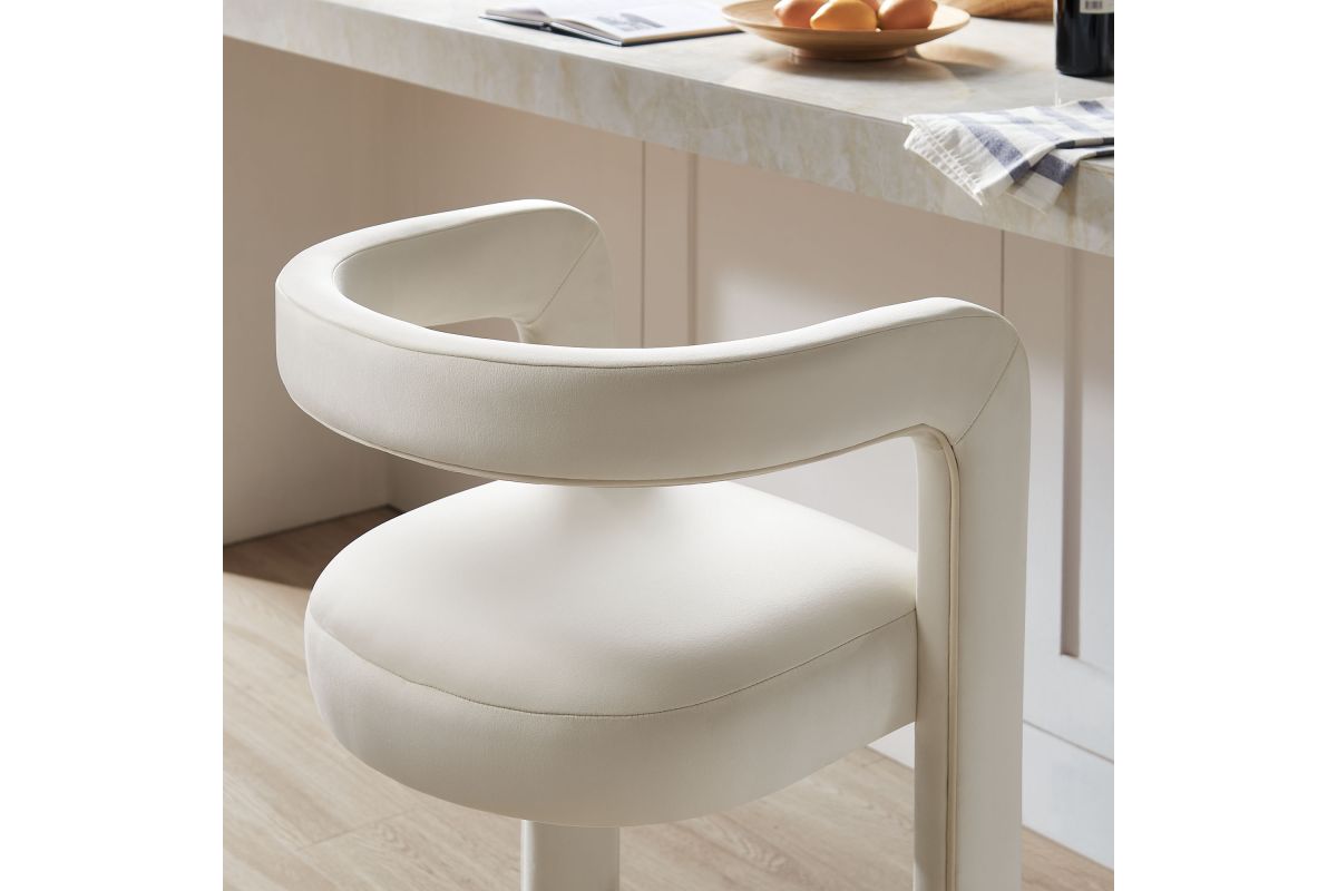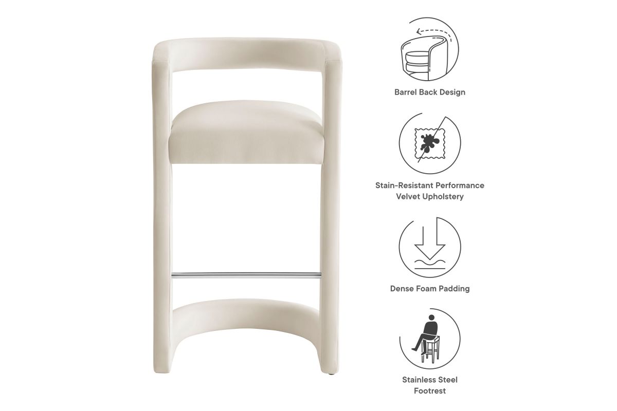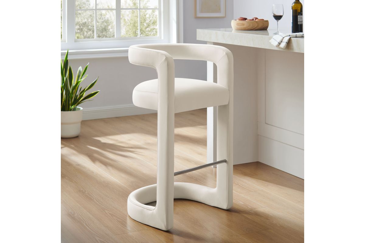 Lift the ambiance of your kitchen counter or bar area with the Winslow Performance Velvet Bar Stool. Featuring a distinctive curved frame and supportive open backrest, this 38-Inch bar stool adds an elevated touch of style to any space. Upholstered in soft performance velvet and padded with dense foam for a comfortable seating experience, this bar-height stool also includes a stainless steel footrest, offering a practical and stylish support feature. The open backrest transitions into smooth, continuous armrests that flow down to meet the elegantly curved legs, which mirror the backrest's shape. This harmonious silhouette enhances the modern aesthetic, while non-marking foot caps protect your flooring. Whether used as a velvet bar stool for your home bar or a chic seating option for the kitchen, the Winslow Bar Stool brings luxurious comfort and modern elegance to your space. Weight Capacity: 330 lbs.
