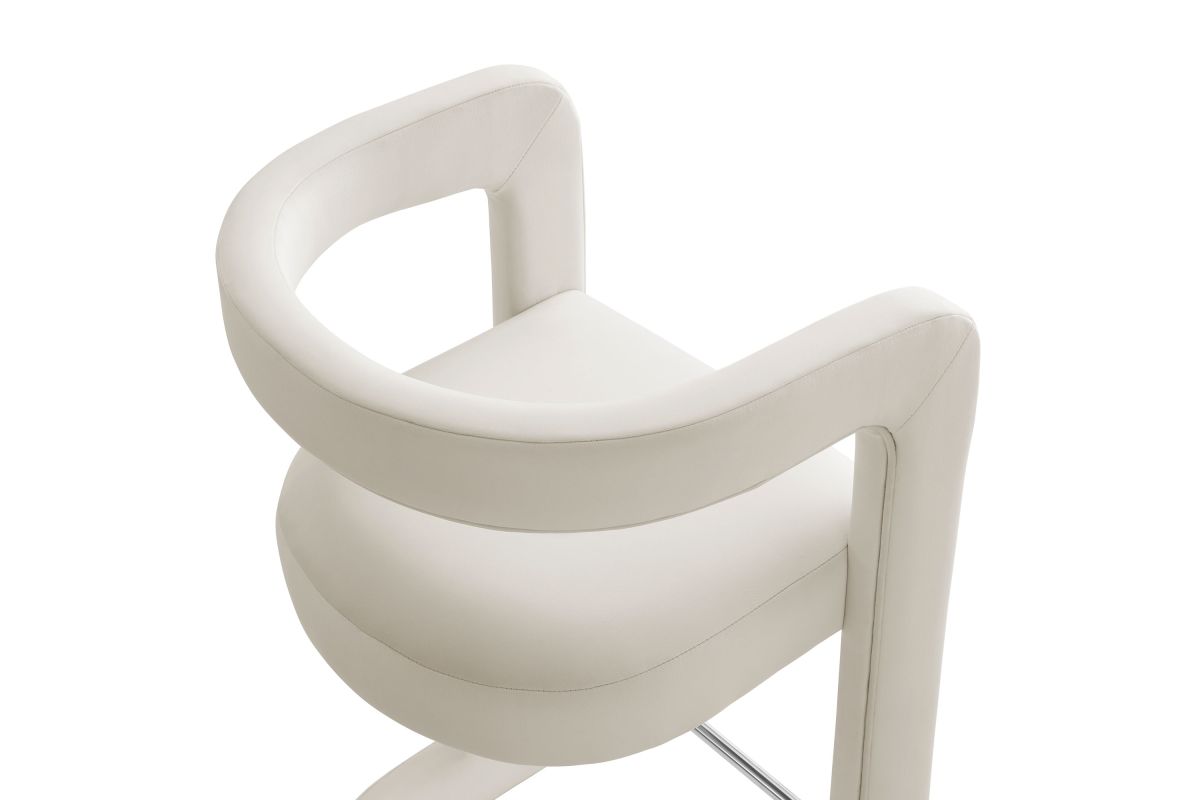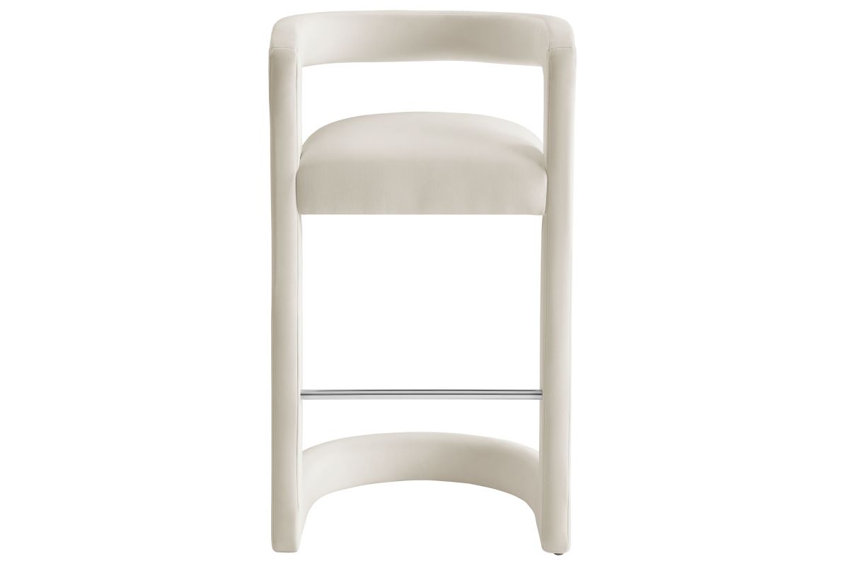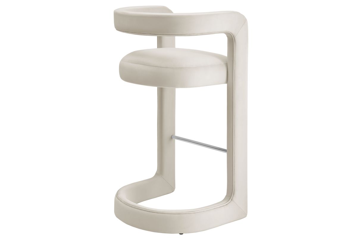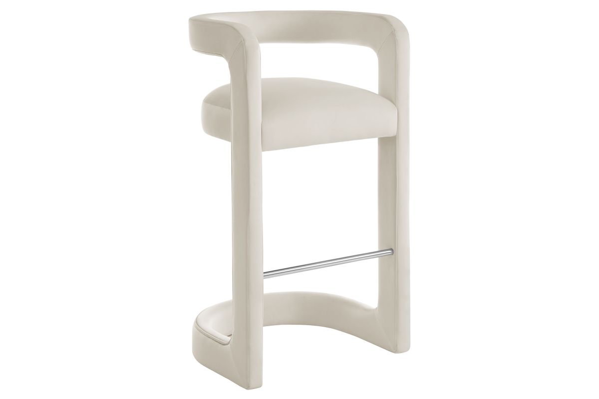 Lift the ambiance of your kitchen counter or bar area with the Winslow Performance Velvet Bar Stool. Featuring a distinctive curved frame and supportive open backrest, this 38-Inch bar stool adds an elevated touch of style to any space. Upholstered in soft performance velvet and padded with dense foam for a comfortable seating experience, this bar-height stool also includes a stainless steel footrest, offering a practical and stylish support feature. The open backrest transitions into smooth, continuous armrests that flow down to meet the elegantly curved legs, which mirror the backrest's shape. This harmonious silhouette enhances the modern aesthetic, while non-marking foot caps protect your flooring. Whether used as a velvet bar stool for your home bar or a chic seating option for the kitchen, the Winslow Bar Stool brings luxurious comfort and modern elegance to your space. Weight Capacity: 330 lbs.