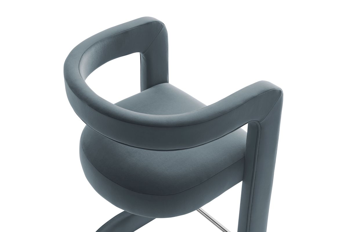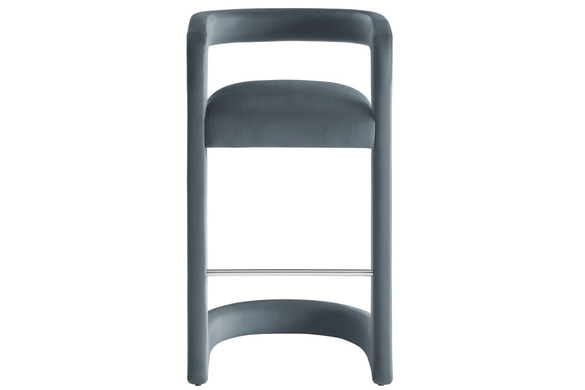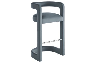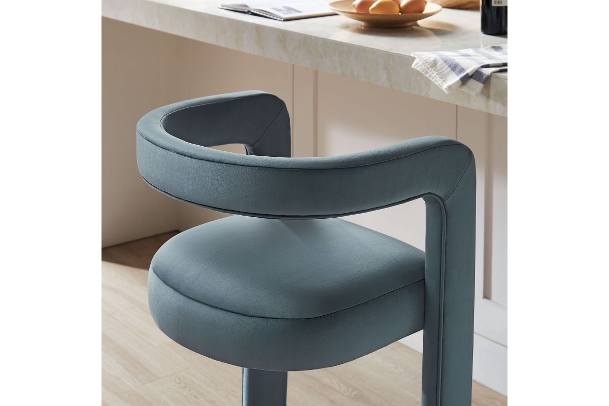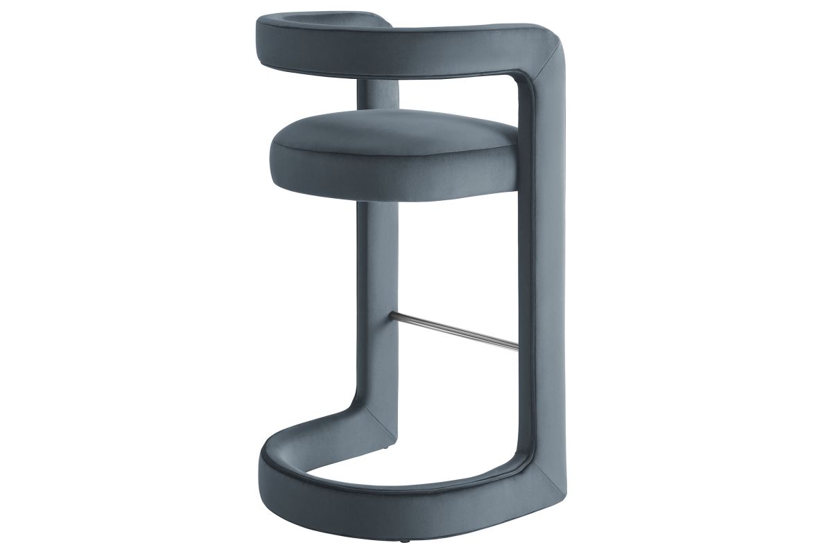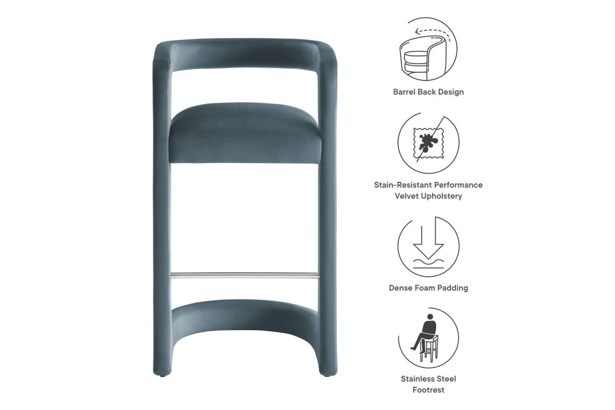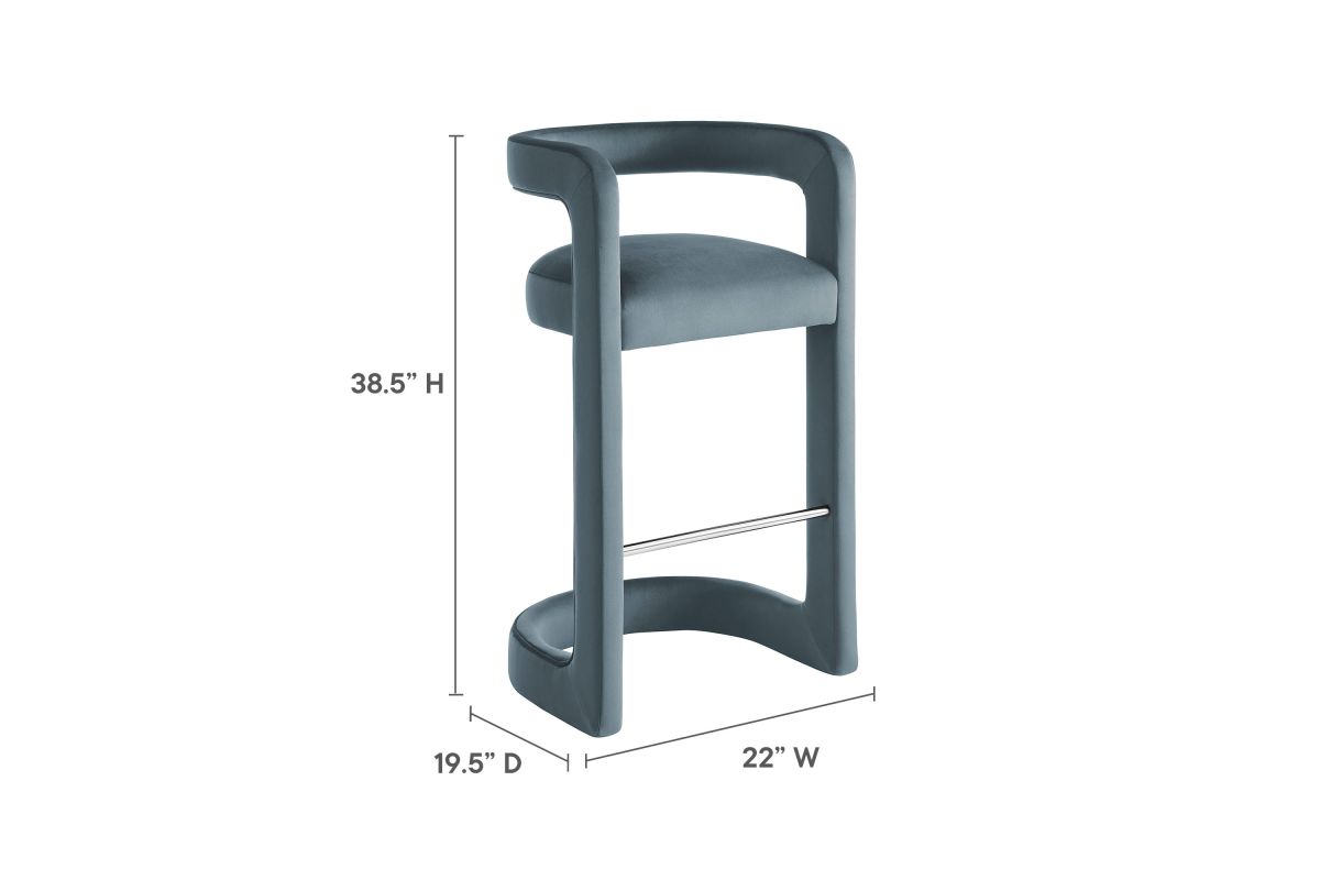Lift the ambiance of your kitchen counter or bar area with the Winslow Performance Velvet Bar Stool. Featuring a distinctive curved frame and supportive open backrest, this 38-Inch bar stool adds an elevated touch of style to any space. Upholstered in soft performance velvet and padded with dense foam for a comfortable seating experience, this bar-height stool also includes a stainless steel footrest, offering a practical and stylish support feature. The open backrest transitions into smooth, continuous armrests that flow down to meet the elegantly curved legs, which mirror the backrest's shape. This harmonious silhouette enhances the modern aesthetic, while non-marking foot caps protect your flooring. Whether used as a velvet bar stool for your home bar or a chic seating option for the kitchen, the Winslow Bar Stool brings luxurious comfort and modern elegance to your space. Weight Capacity: 330 lbs.