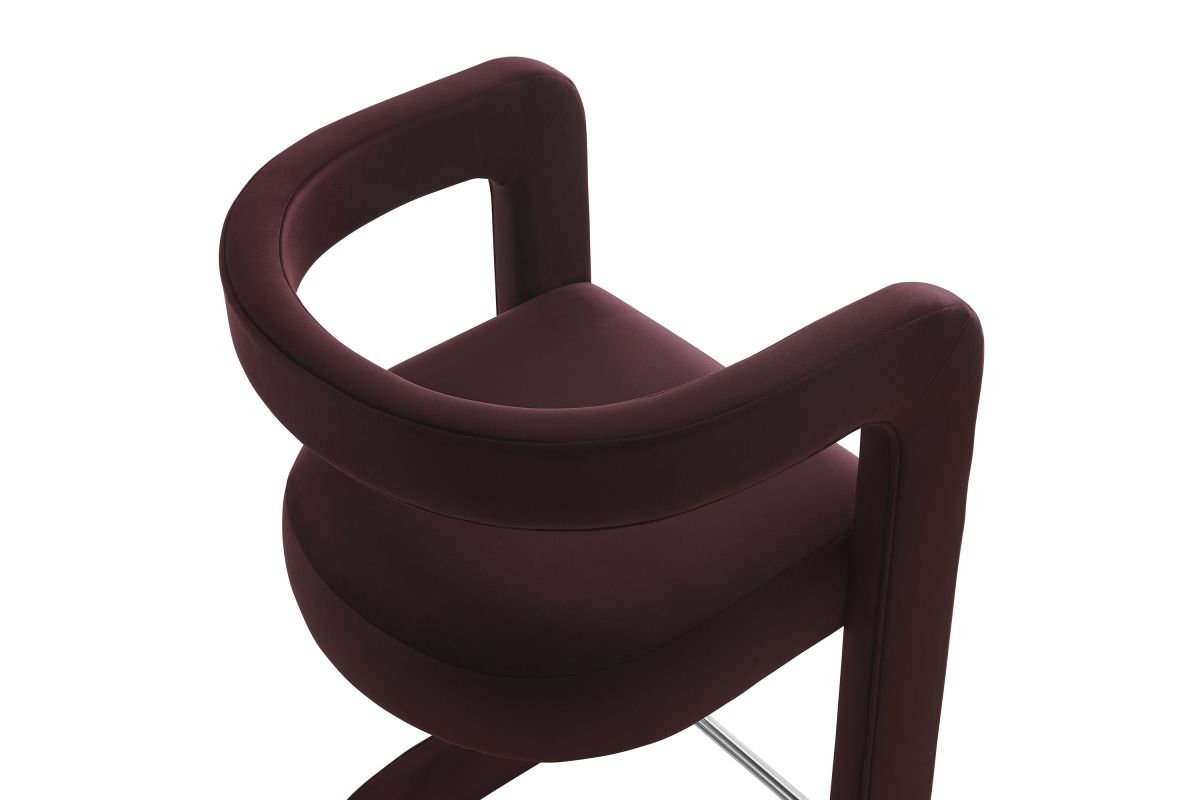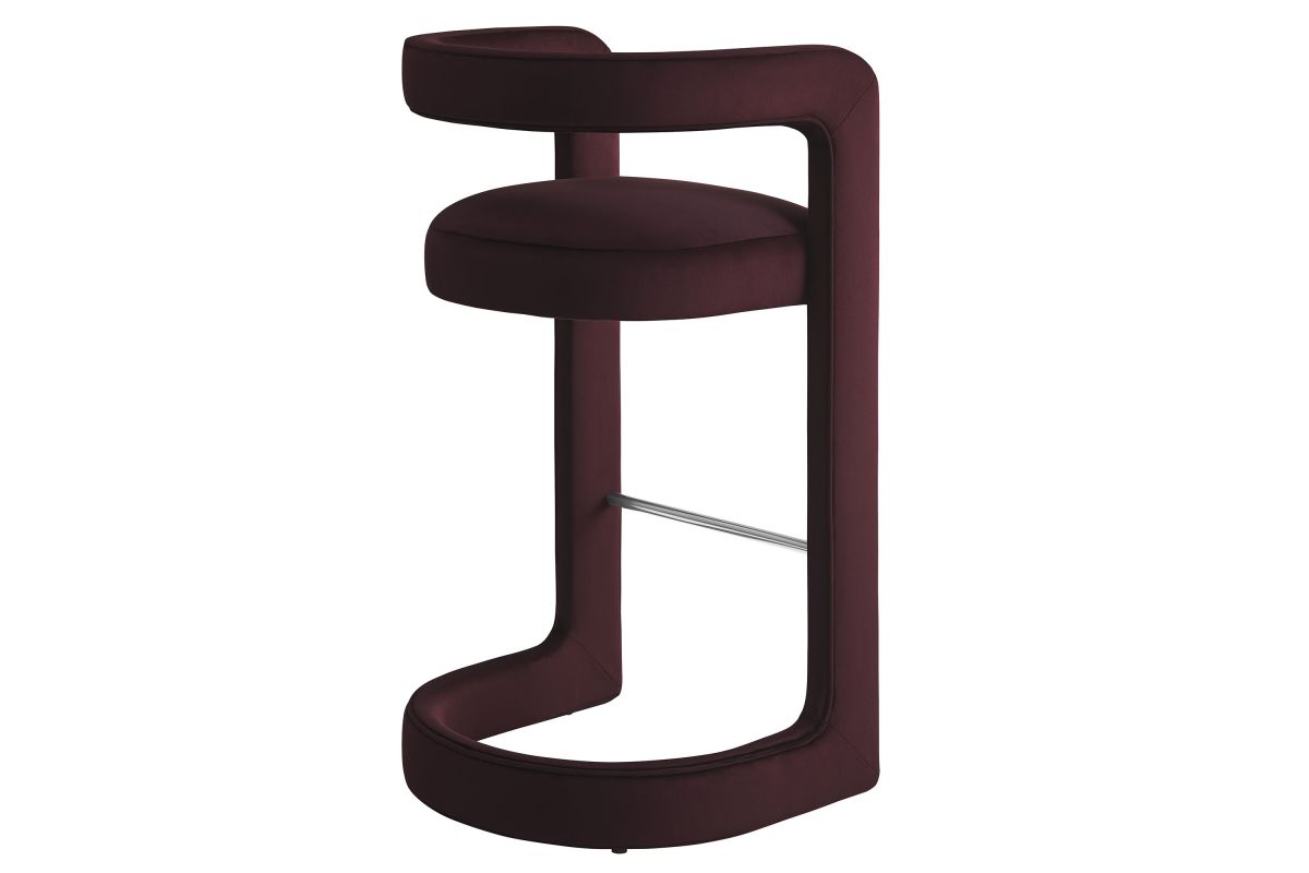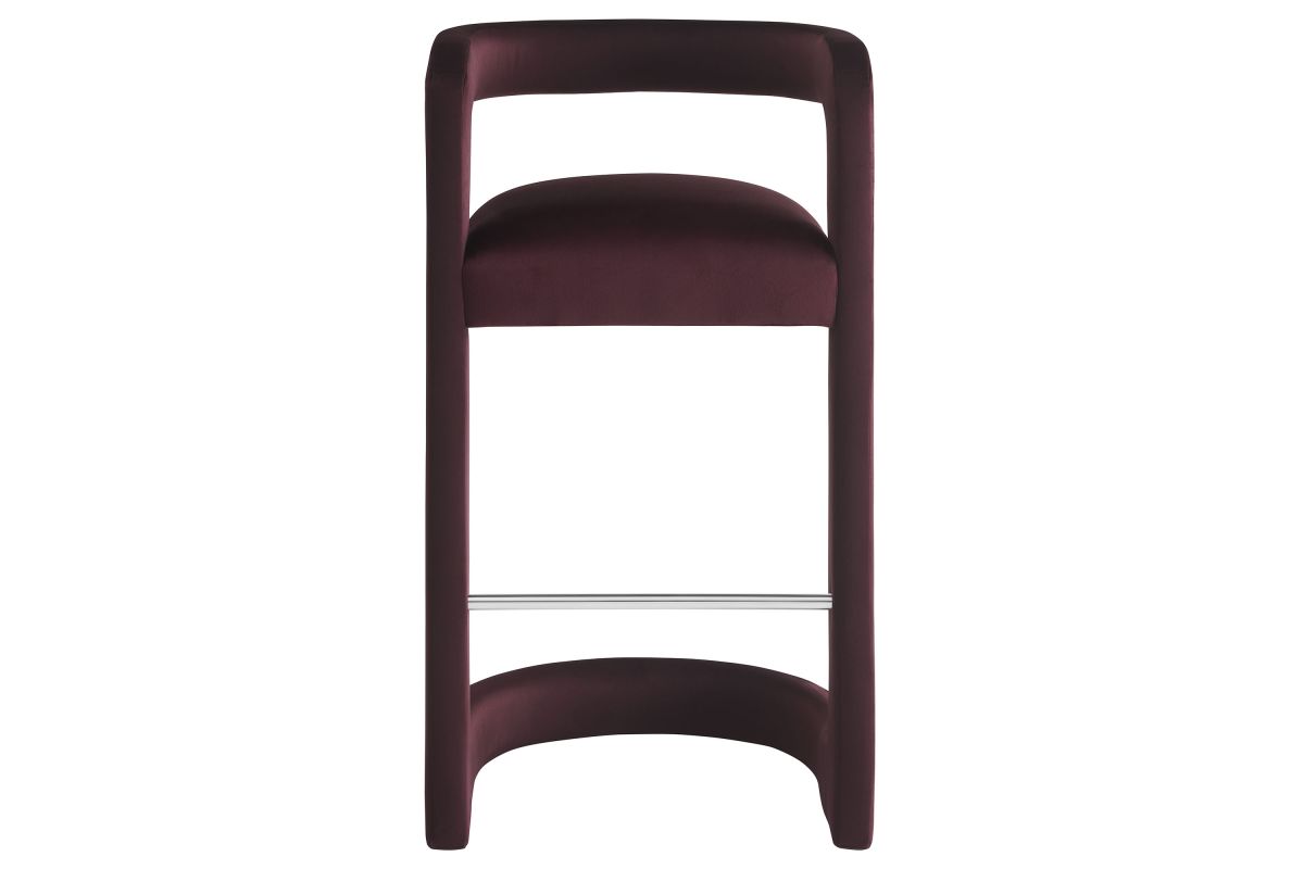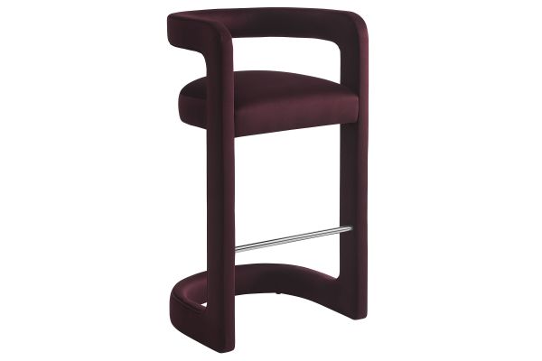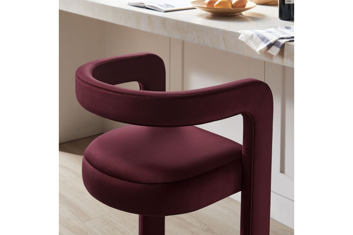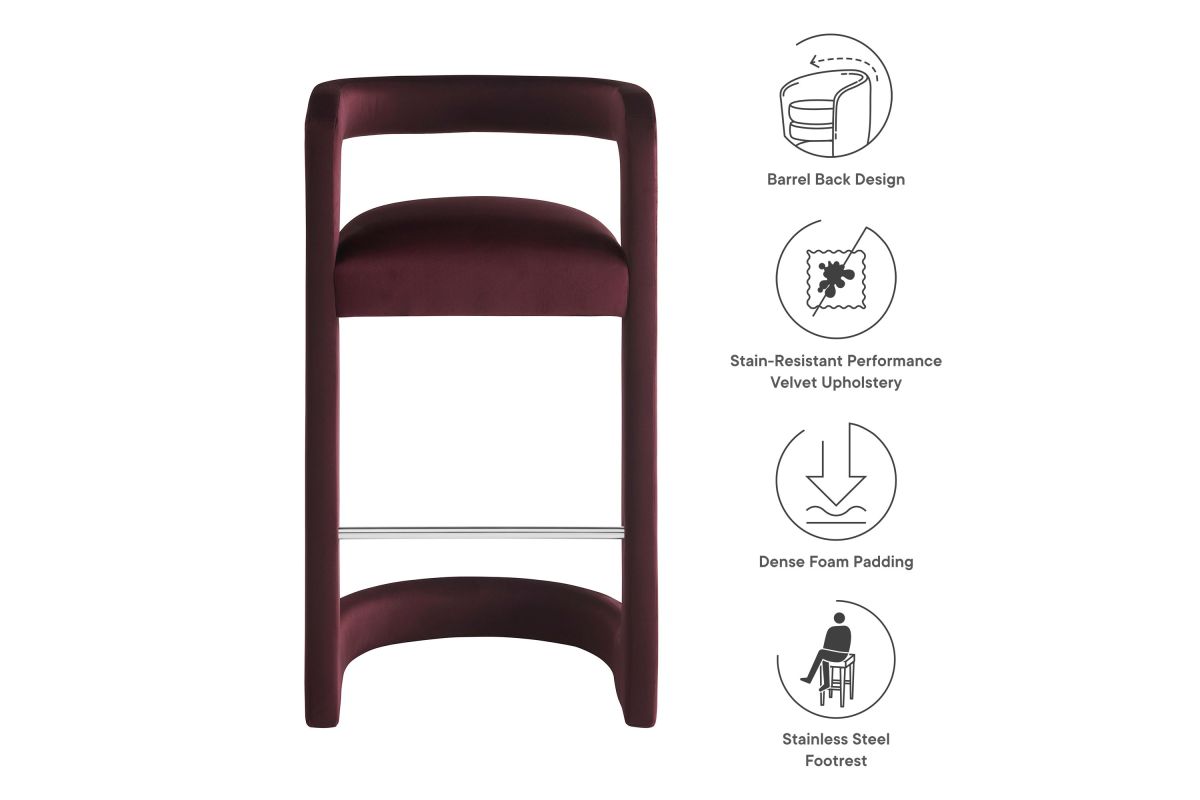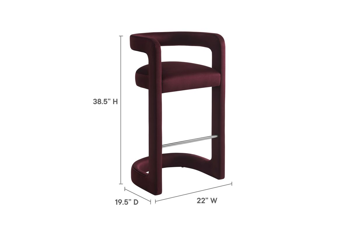 Lift the ambiance of your kitchen counter or bar area with the Winslow Performance Velvet Bar Stool. Featuring a distinctive curved frame and supportive open backrest, this 38-Inch bar stool adds an elevated touch of style to any space. Upholstered in soft performance velvet and padded with dense foam for a comfortable seating experience, this bar-height stool also includes a stainless steel footrest, offering a practical and stylish support feature. The open backrest transitions into smooth, continuous armrests that flow down to meet the elegantly curved legs, which mirror the backrest's shape. This harmonious silhouette enhances the modern aesthetic, while non-marking foot caps protect your flooring. Whether used as a velvet bar stool for your home bar or a chic seating option for the kitchen, the Winslow Bar Stool brings luxurious comfort and modern elegance to your space. Weight Capacity: 330 lbs.