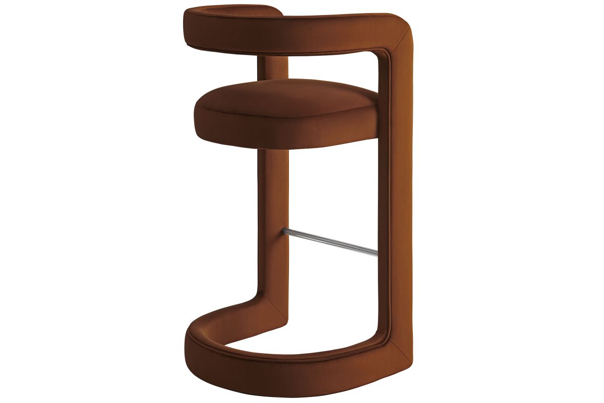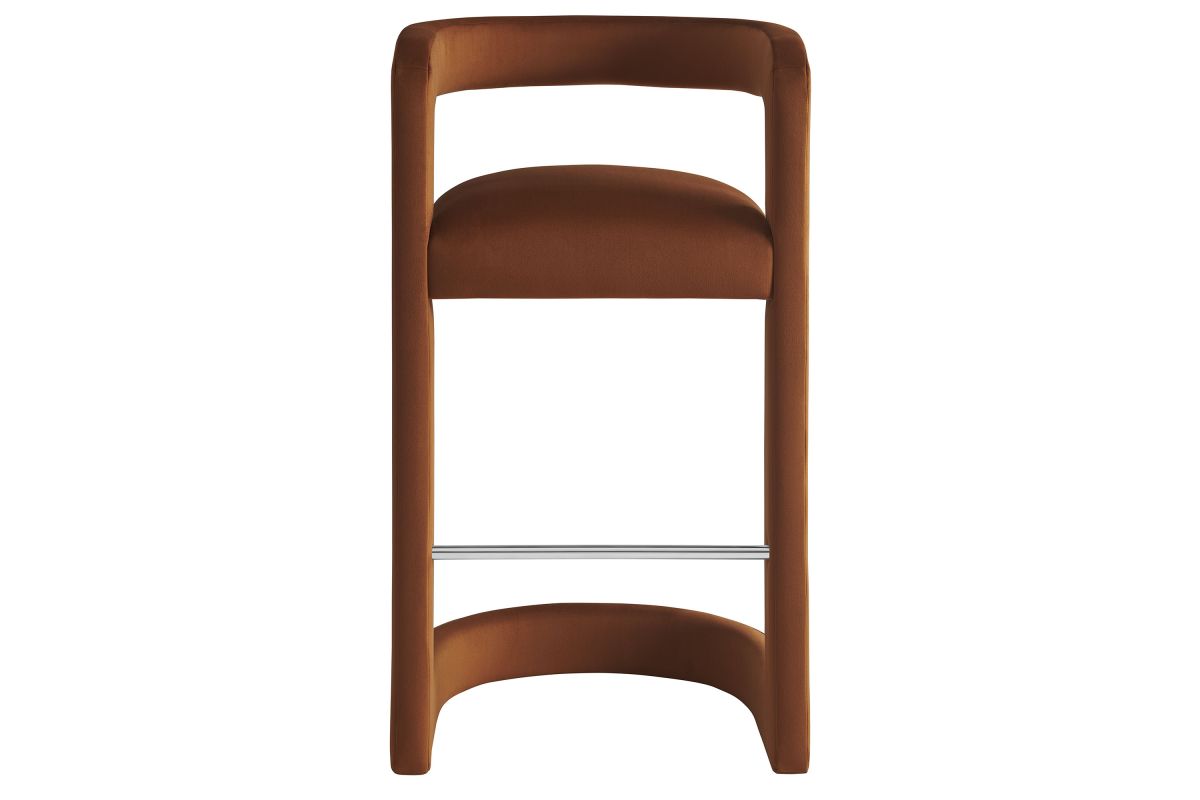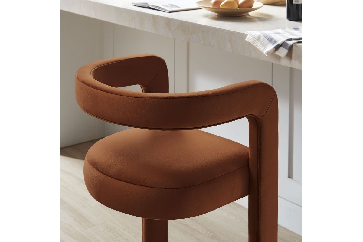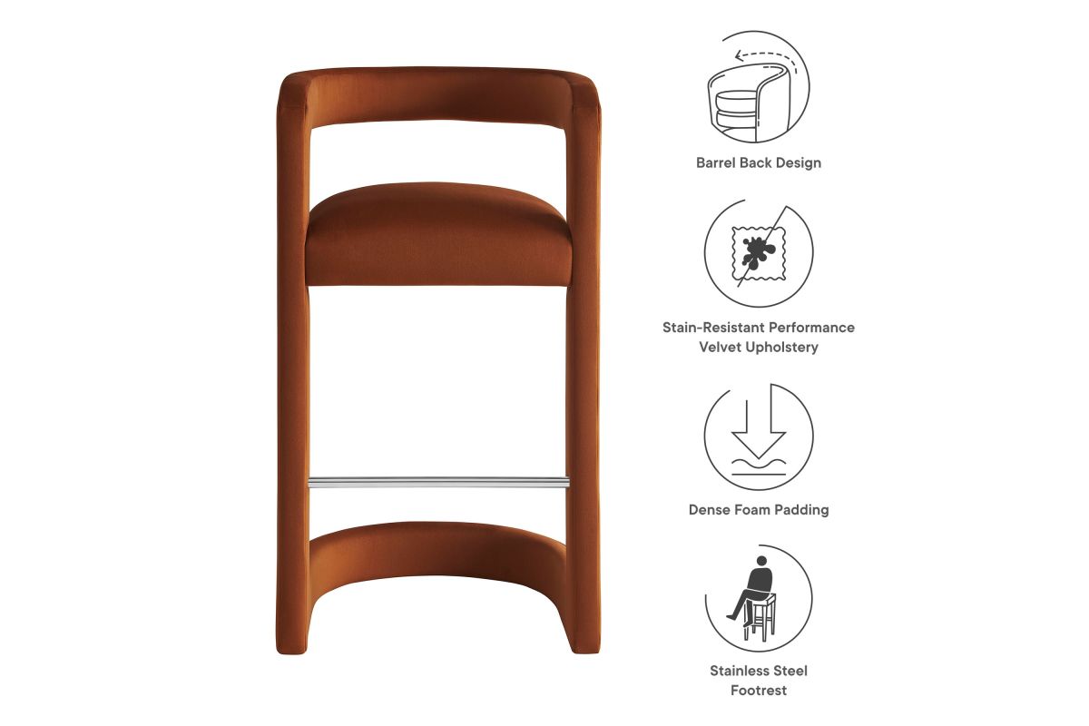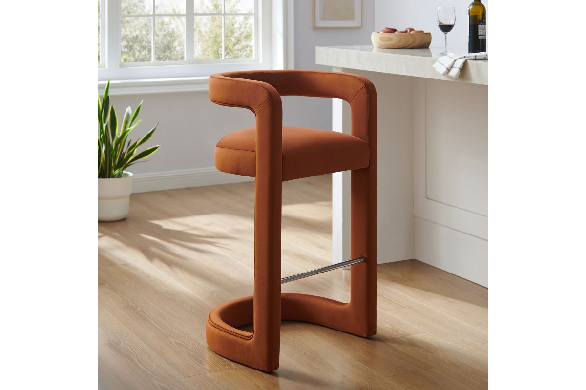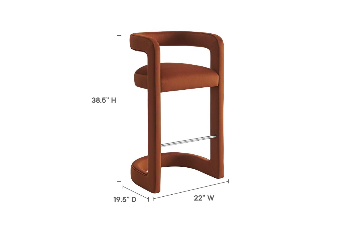 Lift the ambiance of your kitchen counter or bar area with the Winslow Performance Velvet Bar Stool. Featuring a distinctive curved frame and supportive open backrest, this 38-Inch bar stool adds an elevated touch of style to any space. Upholstered in soft performance velvet and padded with dense foam for a comfortable seating experience, this bar-height stool also includes a stainless steel footrest, offering a practical and stylish support feature. The open backrest transitions into smooth, continuous armrests that flow down to meet the elegantly curved legs, which mirror the backrest's shape. This harmonious silhouette enhances the modern aesthetic, while non-marking foot caps protect your flooring. Whether used as a velvet bar stool for your home bar or a chic seating option for the kitchen, the Winslow Bar Stool brings luxurious comfort and modern elegance to your space. Weight Capacity: 330 lbs.