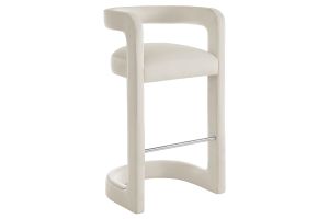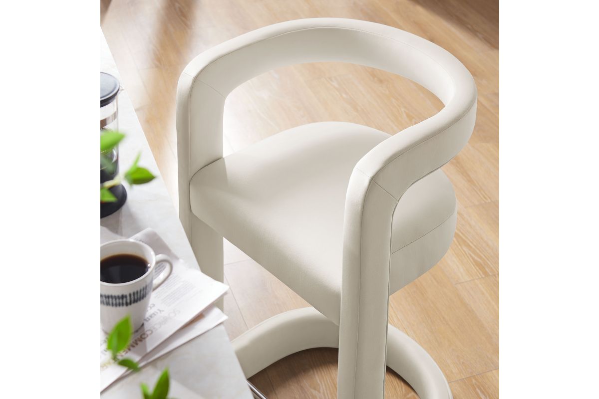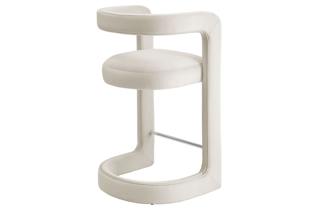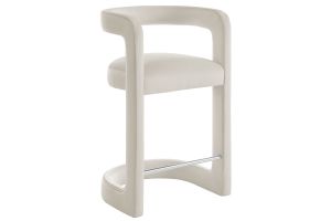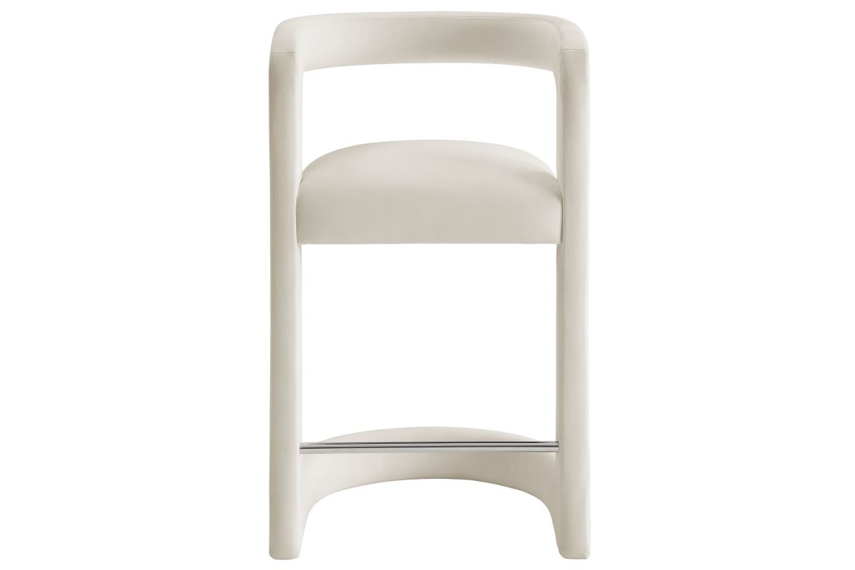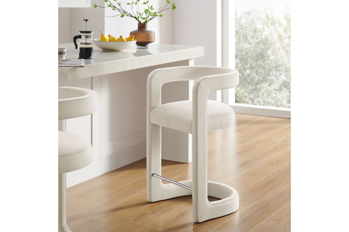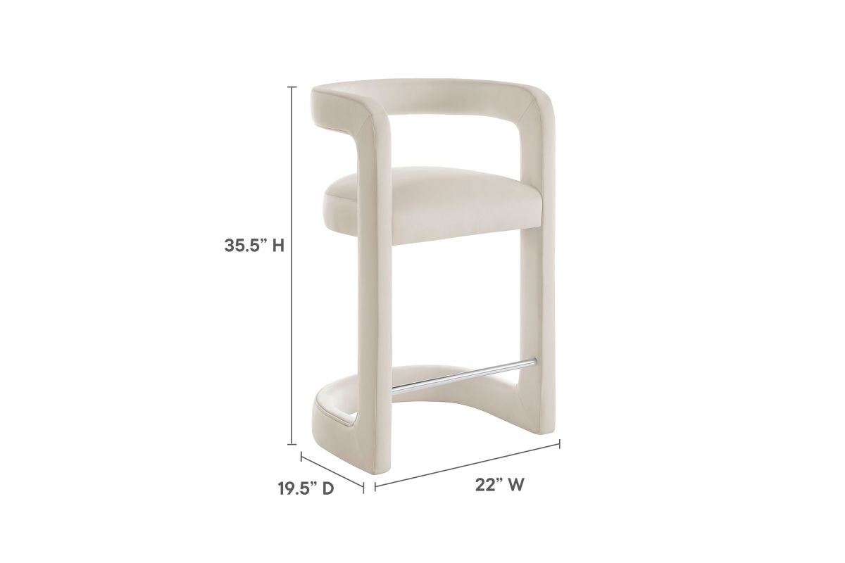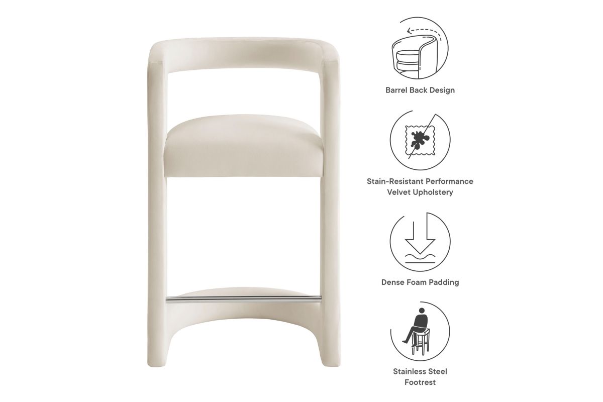 Lift the ambiance of your kitchen island or dining area with the Winslow Performance Velvet Counter Stool. Featuring a distinctive curved frame and supportive open backrest, this 35-inch counter stool adds an elevated touch of style to any space. Upholstered in soft performance velvet and padded with dense foam for a comfortable seating experience, this counter-height stool also includes a stainless steel footrest, offering a practical and stylish support feature. The open backrest transitions into smooth, continuous armrests that flow down to meet the elegantly curved legs, which mirror the backrest's shape. This harmonious silhouette enhances the modern aesthetic, while non-marking foot caps protect your flooring. Whether used as a velvet stool for your kitchen counter or a chic seating option for the dining area, the Winslow Counter Stool brings luxurious comfort and modern elegance to your home. Weight Capacity: 330 lbs.