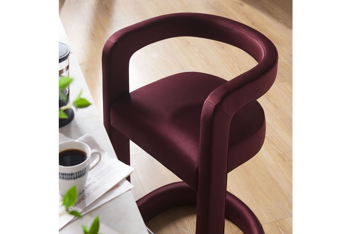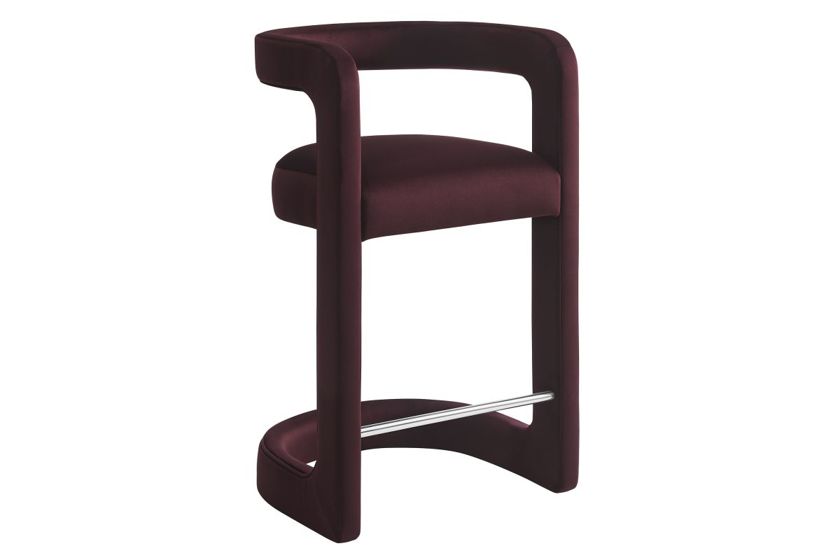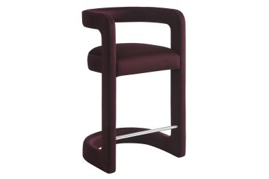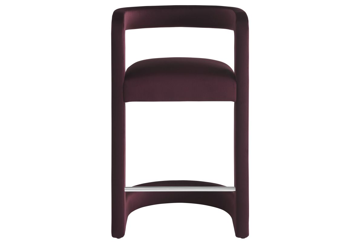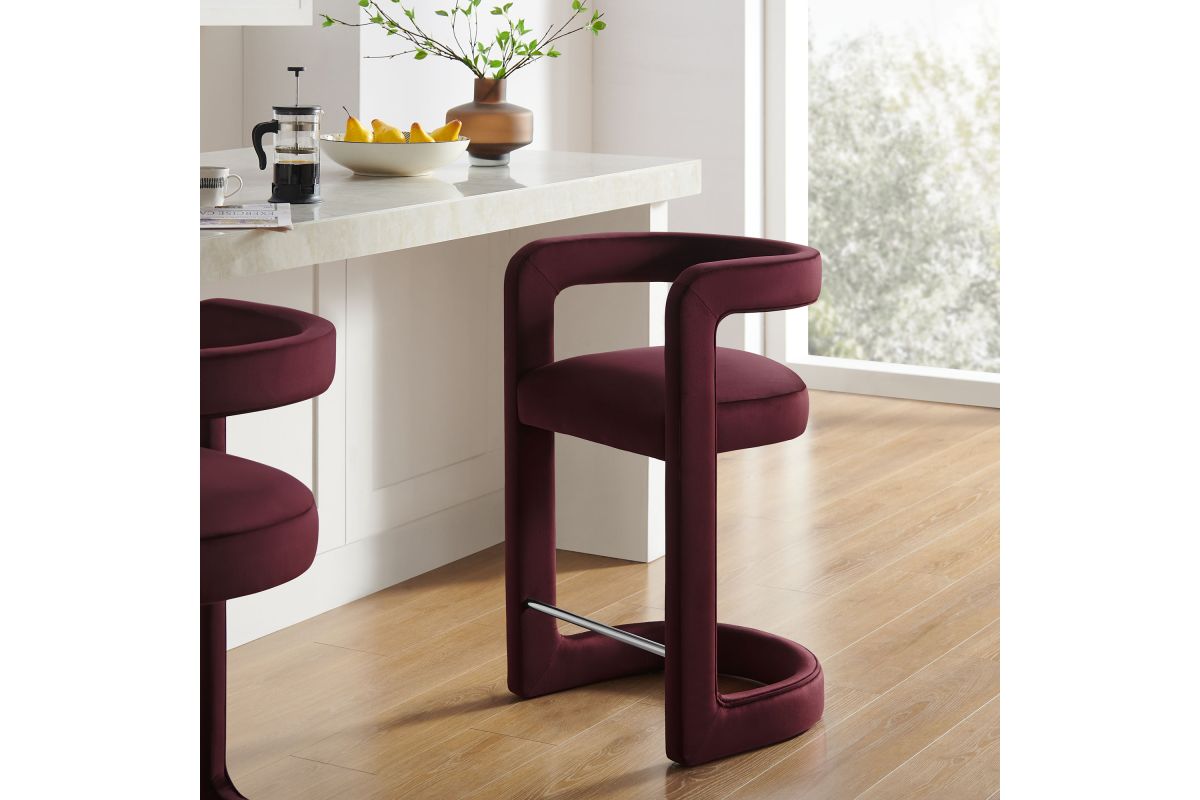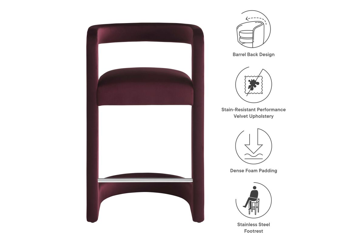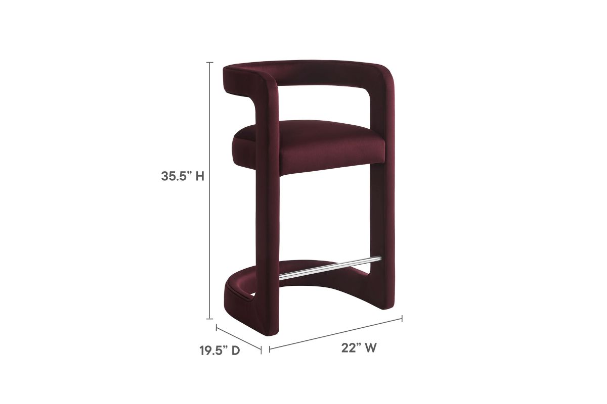Lift the ambiance of your kitchen island or dining area with the Winslow Performance Velvet Counter Stool. Featuring a distinctive curved frame and supportive open backrest, this 35-inch counter stool adds an elevated touch of style to any space. Upholstered in soft performance velvet and padded with dense foam for a comfortable seating experience, this counter-height stool also includes a stainless steel footrest, offering a practical and stylish support feature. The open backrest transitions into smooth, continuous armrests that flow down to meet the elegantly curved legs, which mirror the backrest's shape. This harmonious silhouette enhances the modern aesthetic, while non-marking foot caps protect your flooring. Whether used as a velvet stool for your kitchen counter or a chic seating option for the dining area, the Winslow Counter Stool brings luxurious comfort and modern elegance to your home. Weight Capacity: 330 lbs.