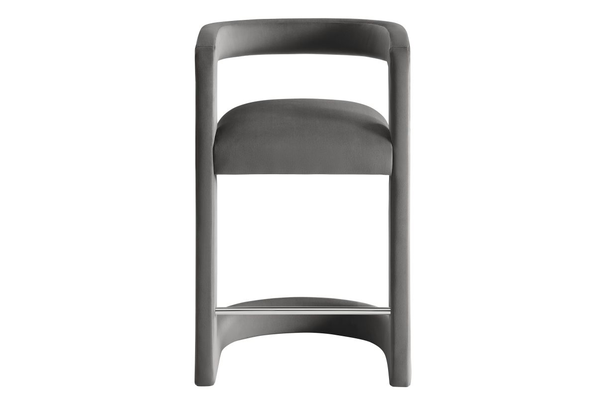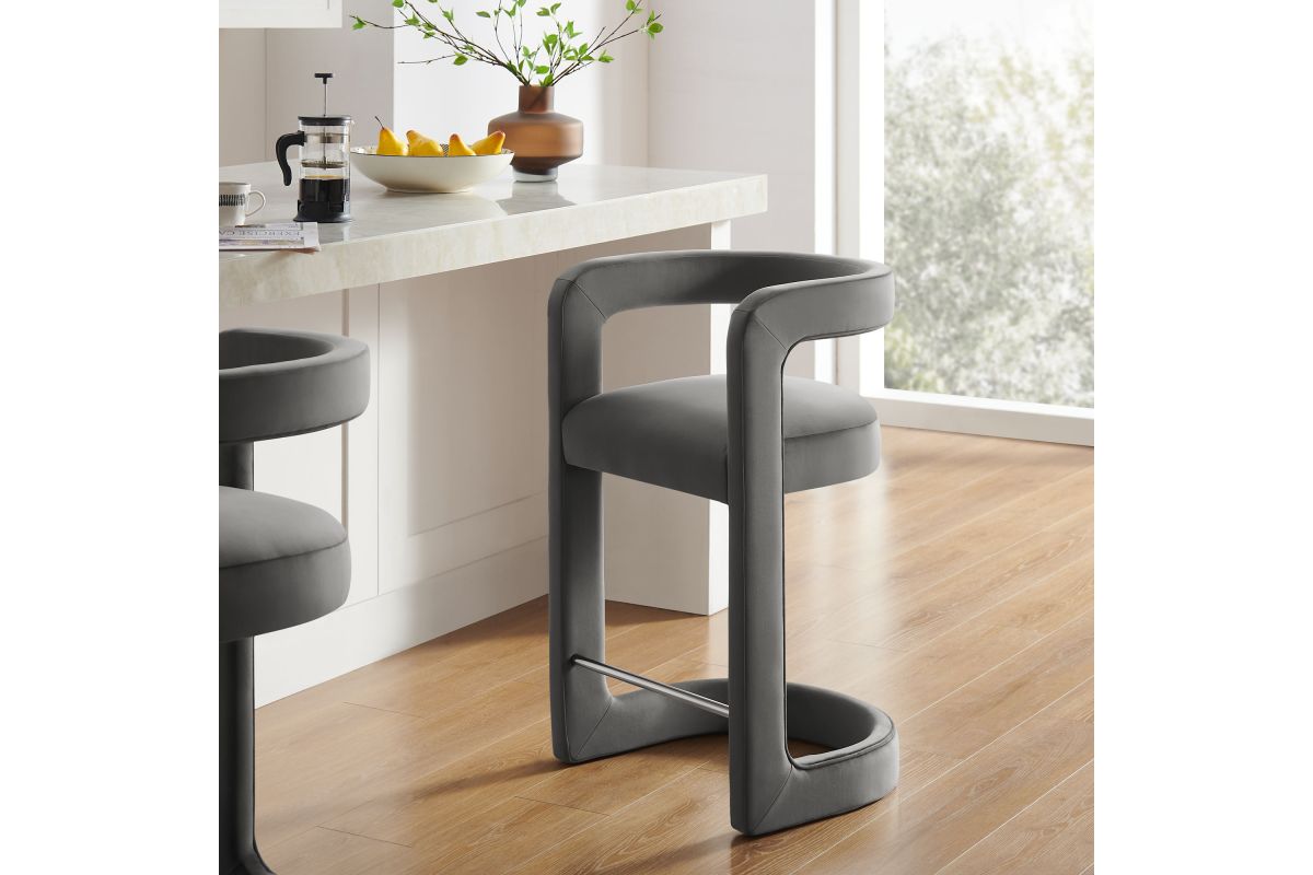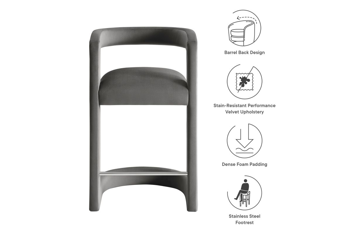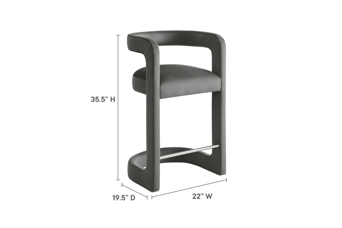 Lift the ambiance of your kitchen island or dining area with the Winslow Performance Velvet Counter Stool. Featuring a distinctive curved frame and supportive open backrest, this 35-inch counter stool adds an elevated touch of style to any space. Upholstered in soft performance velvet and padded with dense foam for a comfortable seating experience, this counter-height stool also includes a stainless steel footrest, offering a practical and stylish support feature. The open backrest transitions into smooth, continuous armrests that flow down to meet the elegantly curved legs, which mirror the backrest's shape. This harmonious silhouette enhances the modern aesthetic, while non-marking foot caps protect your flooring. Whether used as a velvet stool for your kitchen counter or a chic seating option for the dining area, the Winslow Counter Stool brings luxurious comfort and modern elegance to your home. Weight Capacity: 330 lbs.