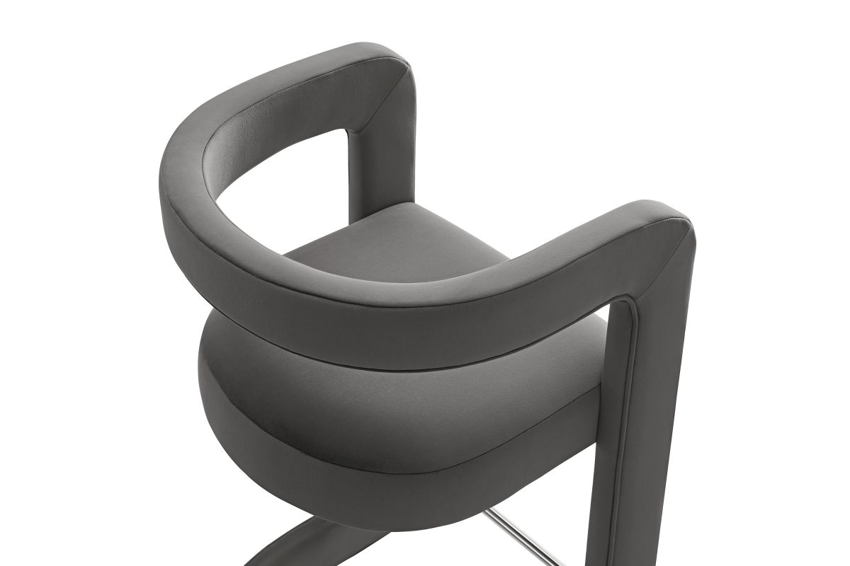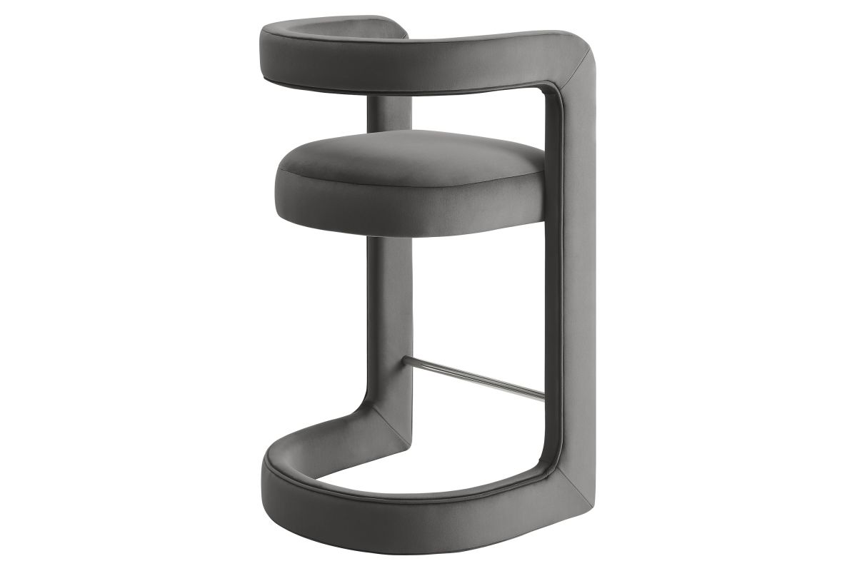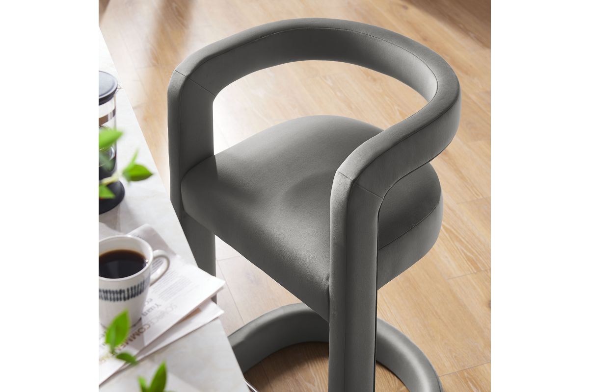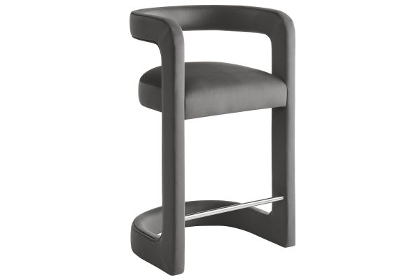 Lift the ambiance of your kitchen island or dining area with the Winslow Performance Velvet Counter Stool. Featuring a distinctive curved frame and supportive open backrest, this 35-inch counter stool adds an elevated touch of style to any space. Upholstered in soft performance velvet and padded with dense foam for a comfortable seating experience, this counter-height stool also includes a stainless steel footrest, offering a practical and stylish support feature. The open backrest transitions into smooth, continuous armrests that flow down to meet the elegantly curved legs, which mirror the backrest's shape. This harmonious silhouette enhances the modern aesthetic, while non-marking foot caps protect your flooring. Whether used as a velvet stool for your kitchen counter or a chic seating option for the dining area, the Winslow Counter Stool brings luxurious comfort and modern elegance to your home. Weight Capacity: 330 lbs.