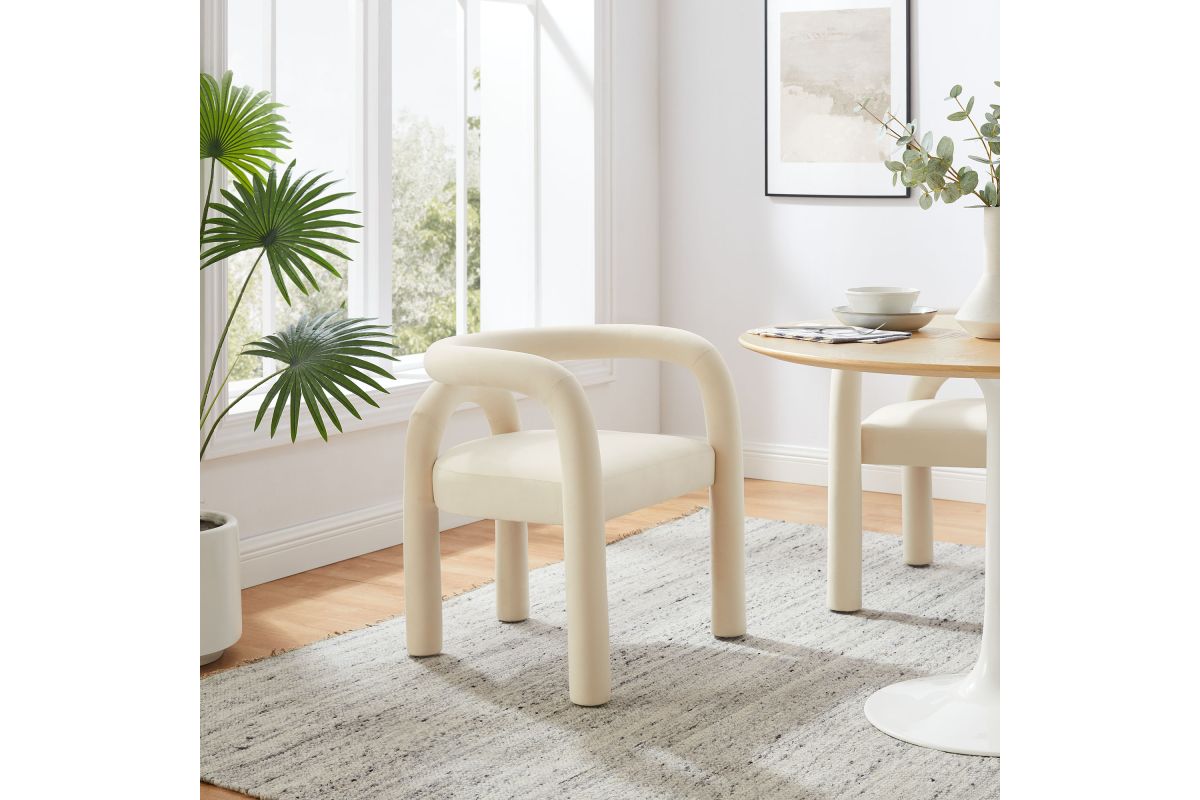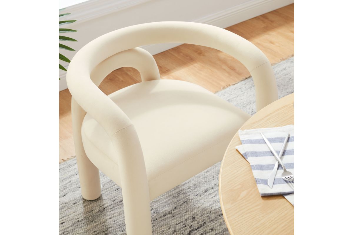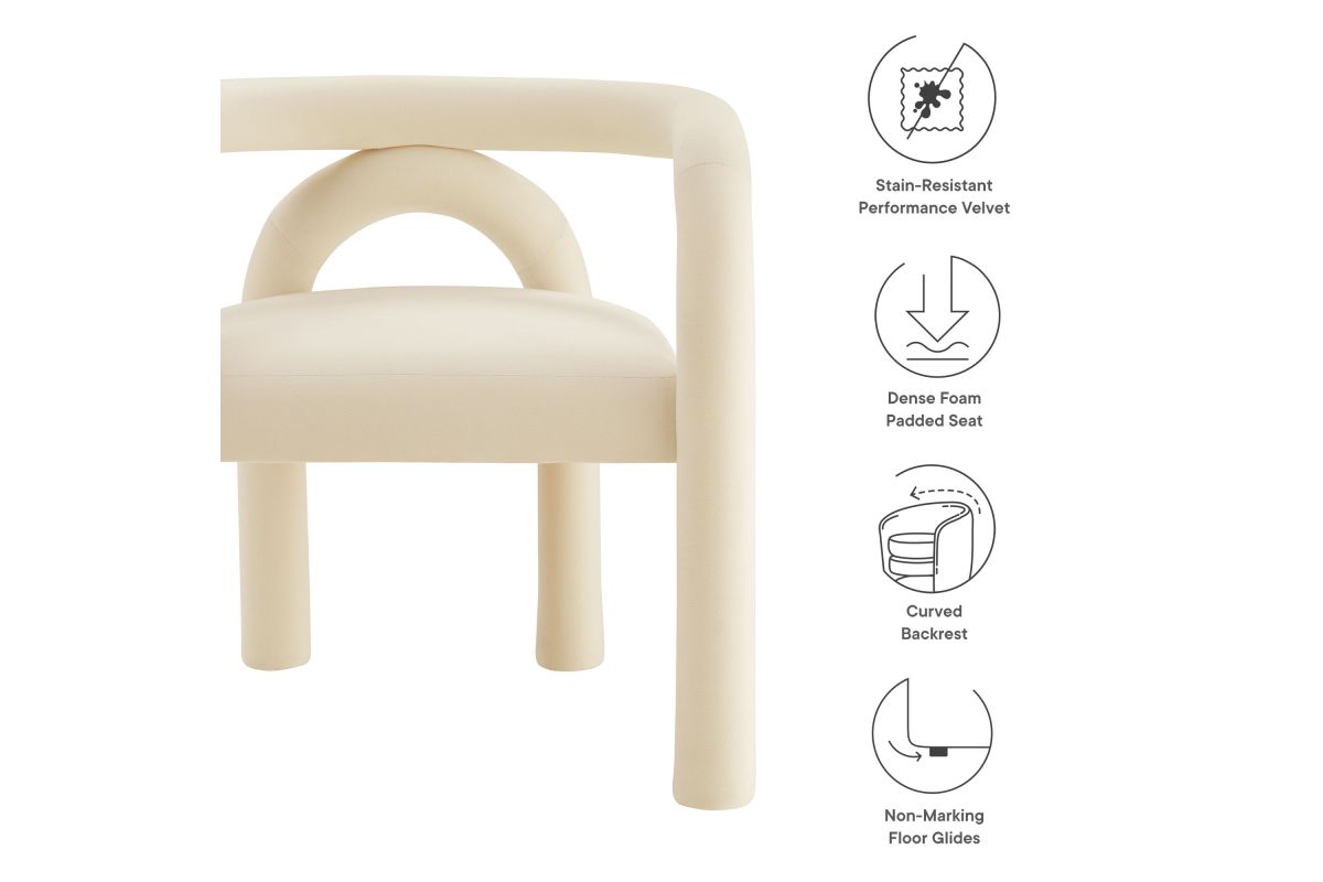 The Astrid Upholstered Barrel Dining Chair effortlessly combines modern sophistication with a hint of eclectic charm. Designed with an open-back silhouette and smooth, sweeping curves, this performance velvet dining chair adds a contemporary flair that fits beautifully in various settings. The upholstered chair's padded foam cushion and stain-resistant performance velvet fabric ensure both style and comfort, making it an ideal choice for dining rooms, vanities, or as an accent chair in living spaces. Arriving fully assembled and equipped with non-marking floor glides, this aesthetic chair with an arch backrest is a versatile and functional addition to any modern or contemporary decor. Weight Capacity: 300 lbs.