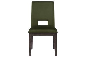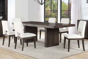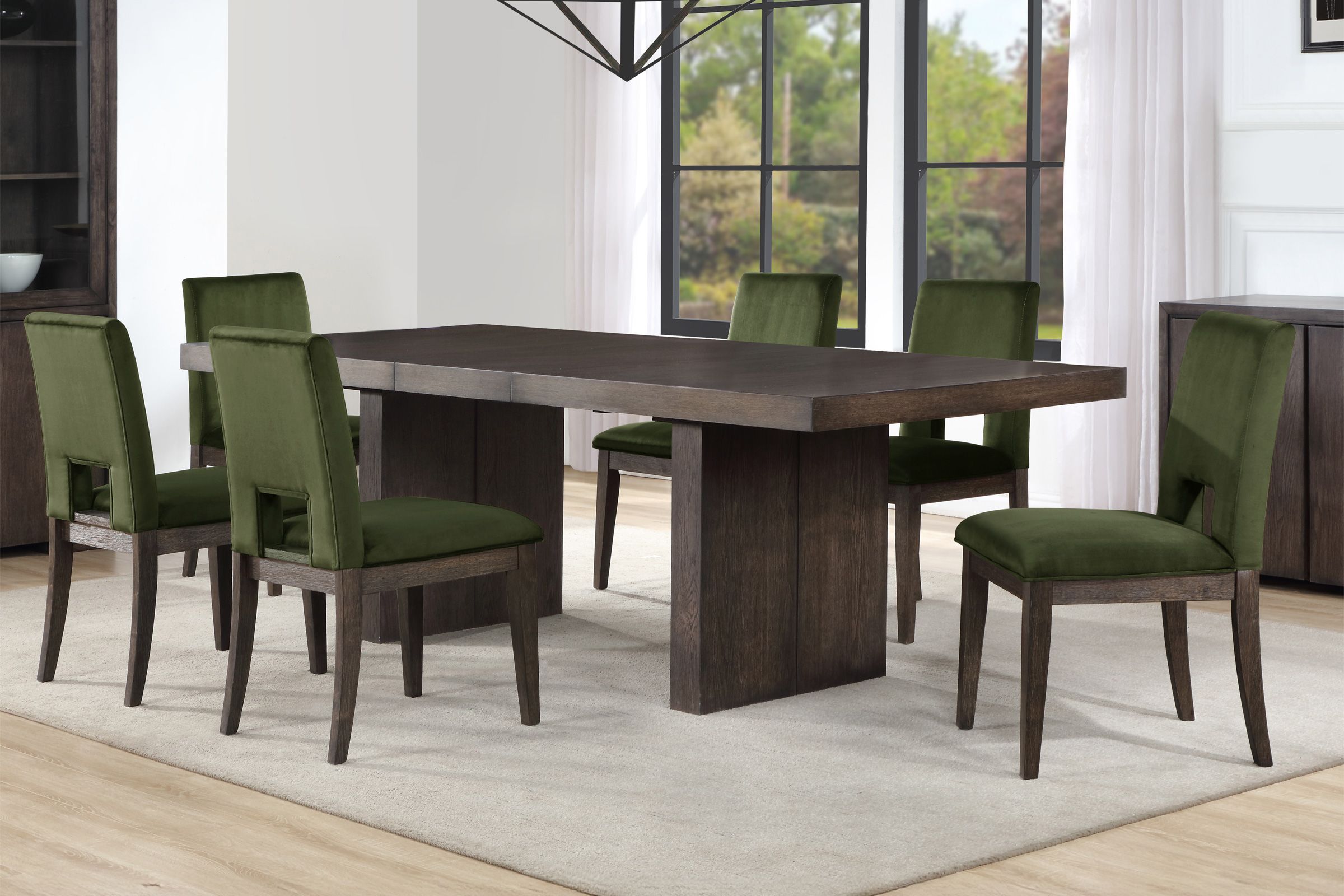 The Alexander Dining Collections comes with a 78-96 inch table features bold modern styling in a practical configuration. The centerpiece is a stunning table with a double pedestal base, clean lines, and an ultra-smooth glide system that effortlessly expands and stores the leaf when not in use. The wire-brushed walnut finish with a waxy hang-up adds sophistication, beautifully paired with luxurious green velvet side chairs for comfort.