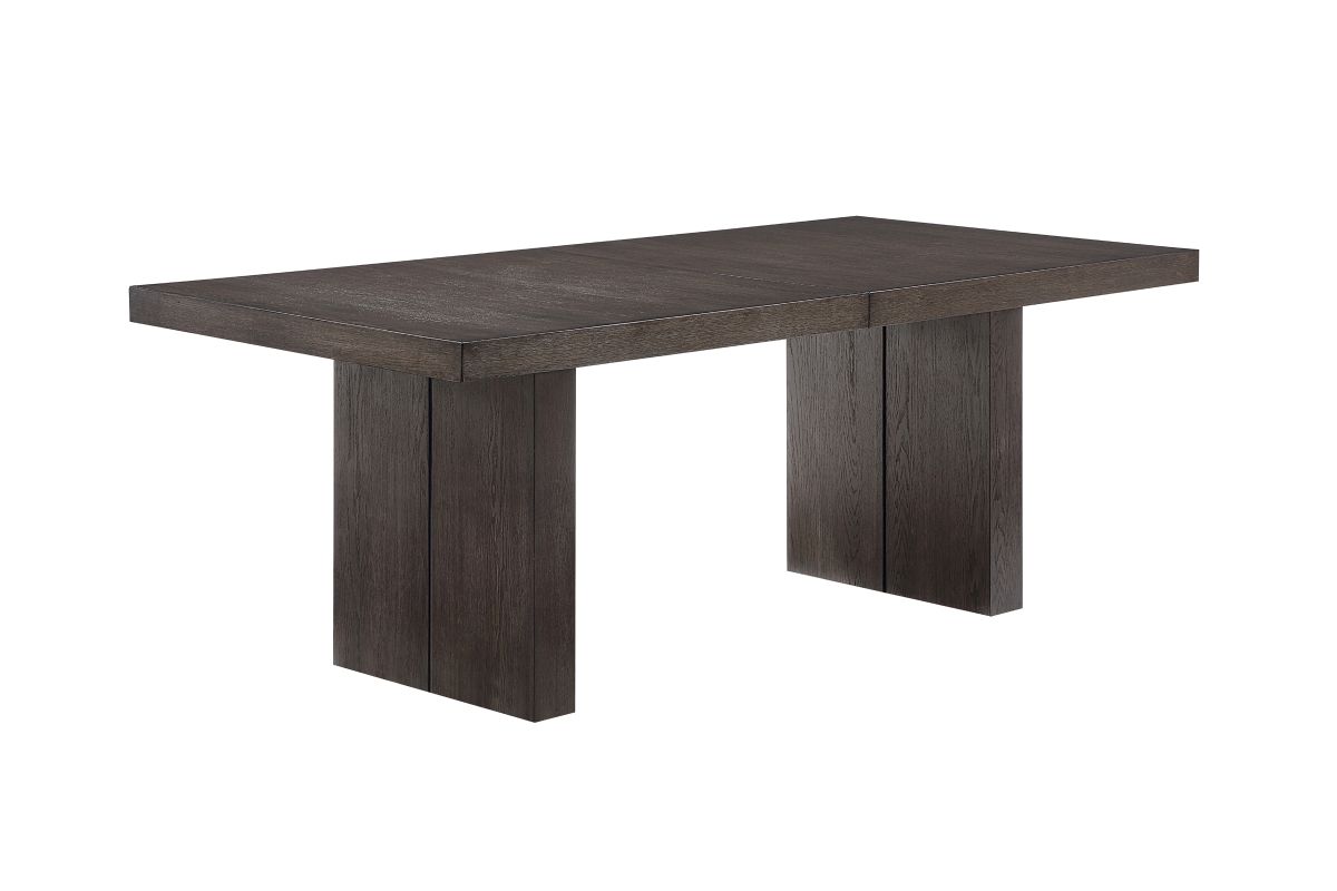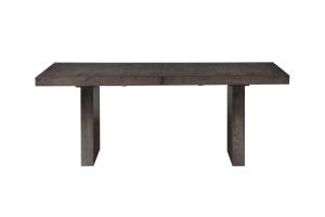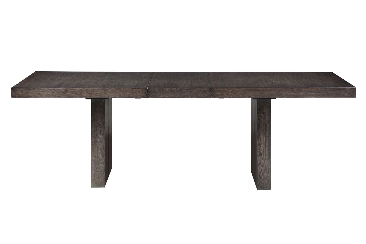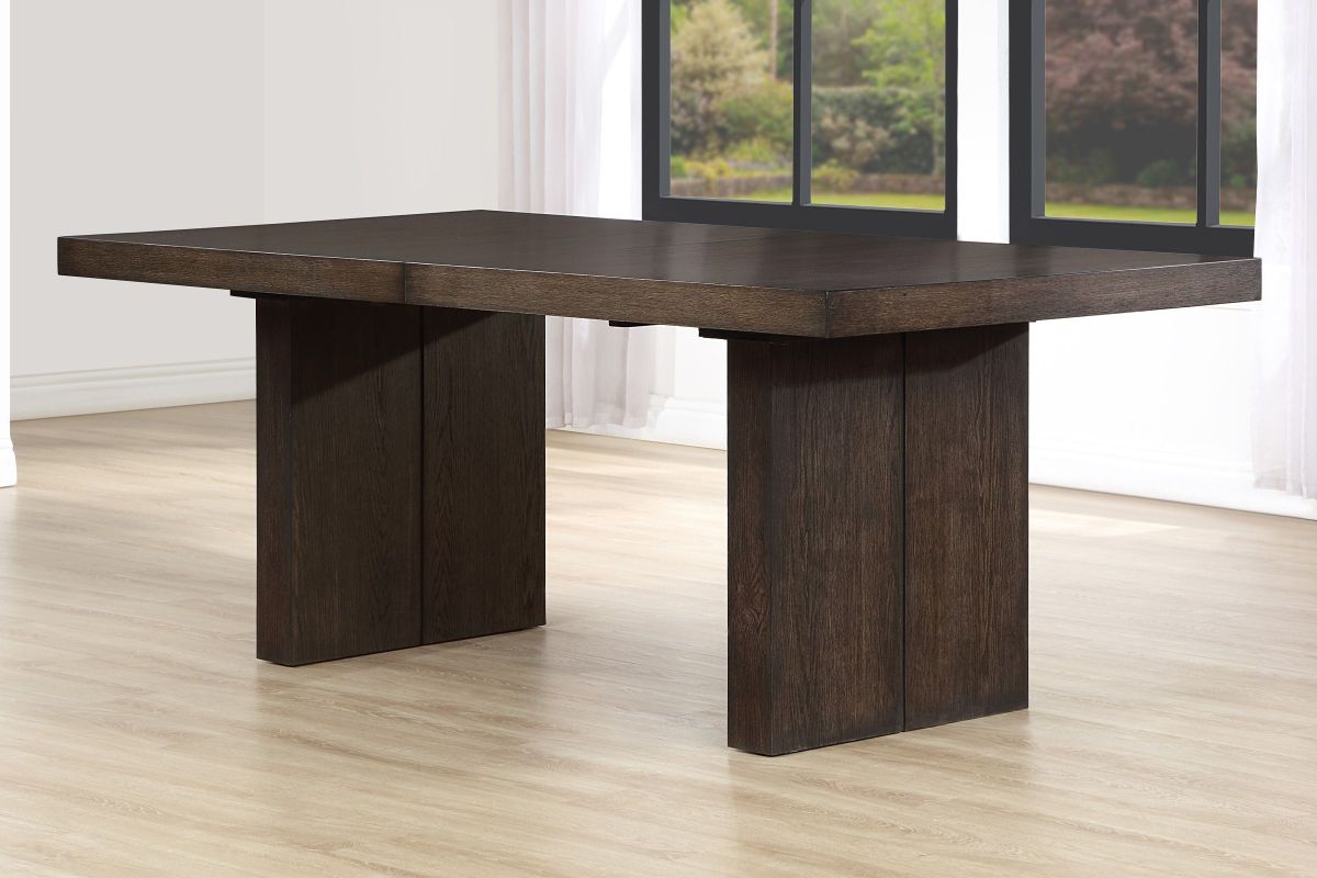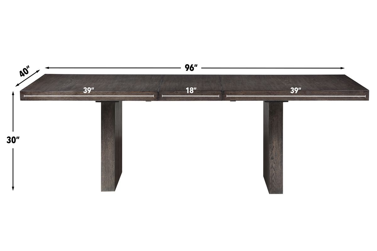 The Alexander Table is a 78 inch table that comes with an 18" leaf that can extend to 96 inches, it also features bold modern styling in a practical configuration. The centerpiece is a stunning table with a double pedestal base, clean lines, and an ultra-smooth glide system that effortlessly expands and stores the leaf when not in use. The wire-brushed walnut finish with a waxy hang-up adds sophistication.