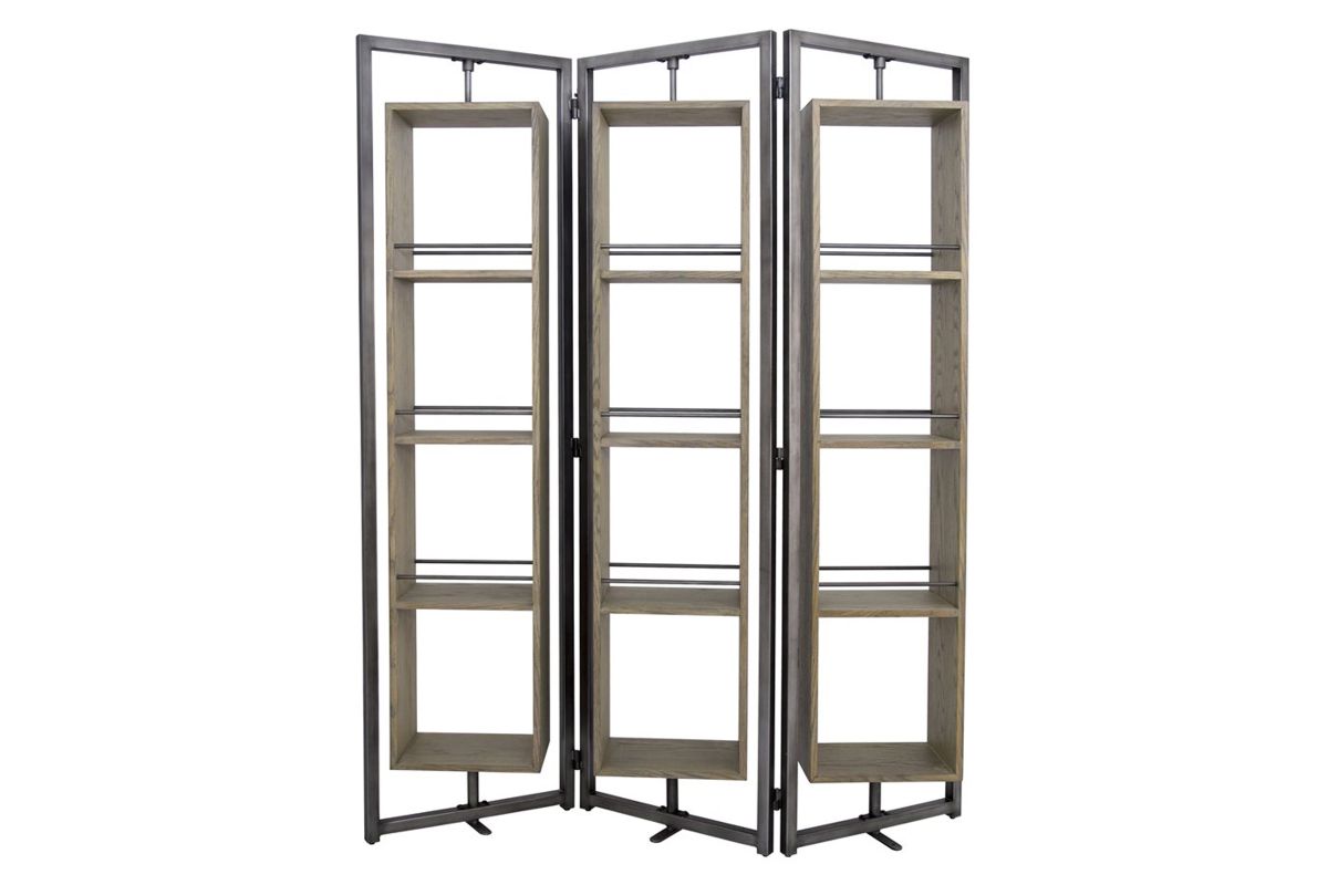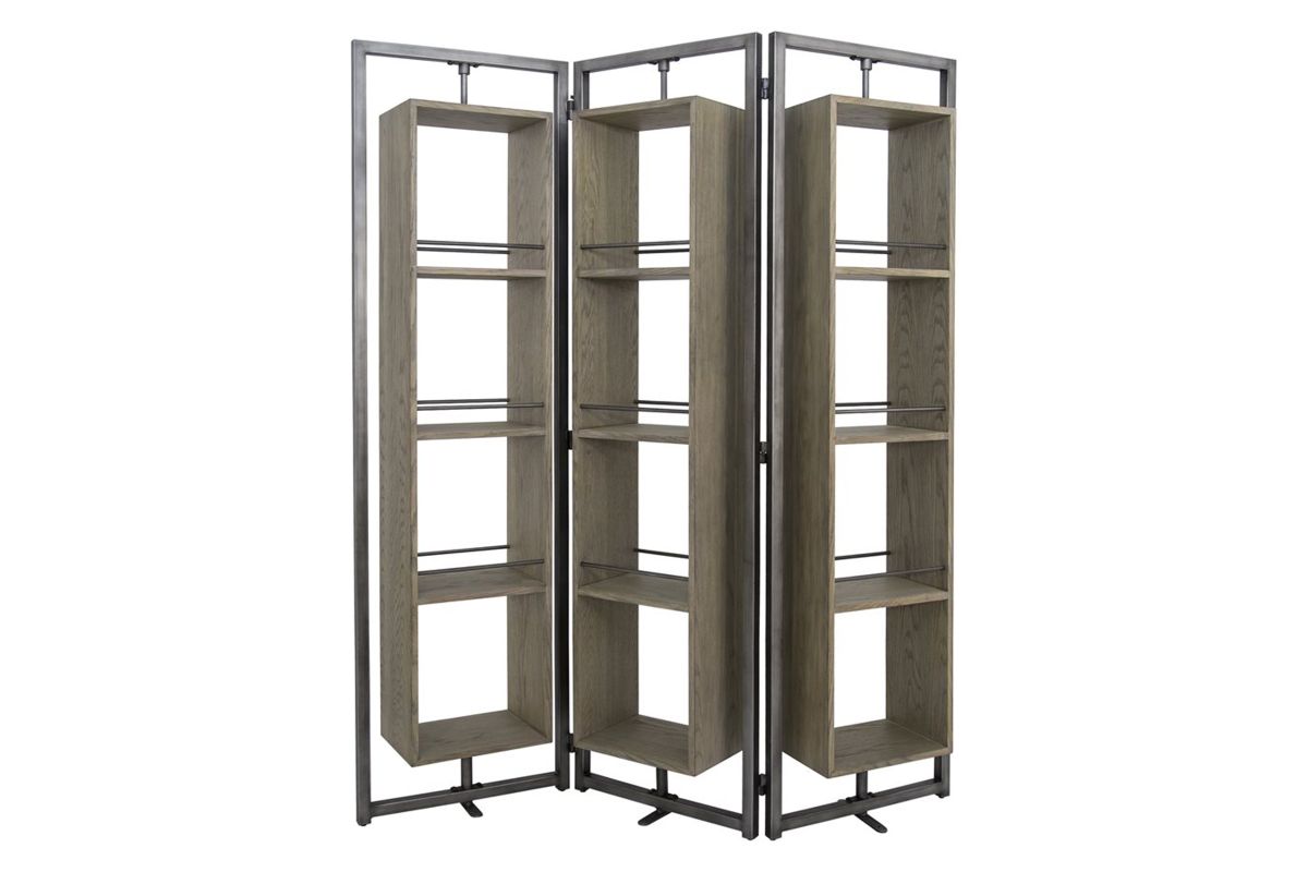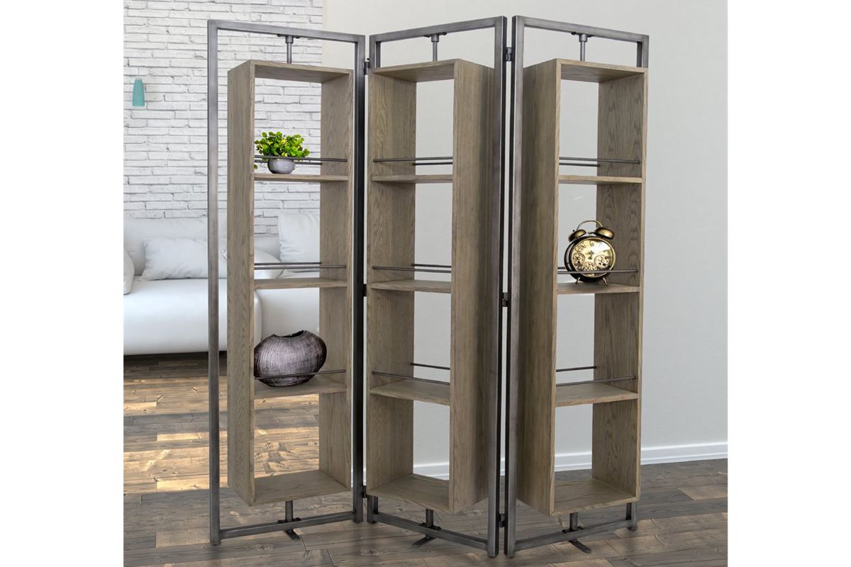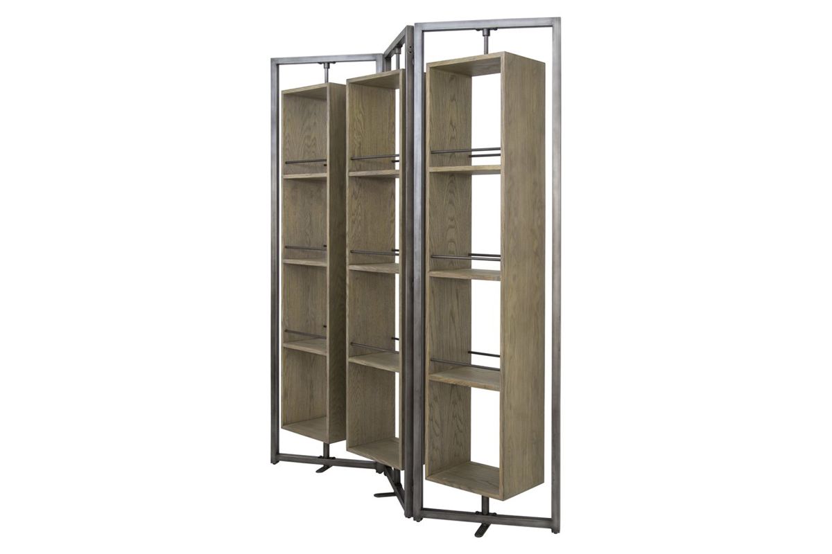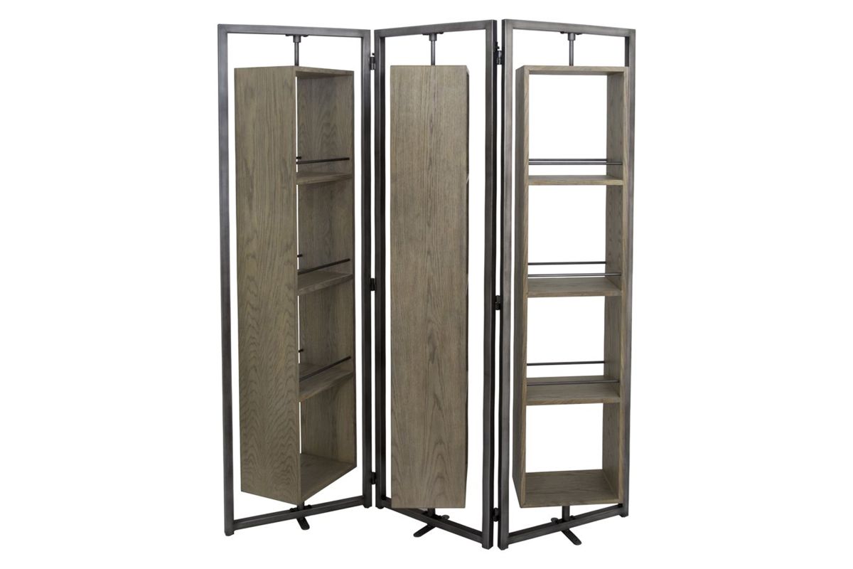 Arlo Large Screen is an innovative multi*purpose furniture item. Being YHD proprietary design, this rotating screen offers several levels of customization. Each side of the screen can be angled as desired, and also each shelf box can be rotated 360 degrees, allowing the user to display plants, books, photos any direction they desire. Metal ball bearing couplings allow for effortless turning of the cabinet boxes. Anti-Tip hardware is recommended for this item. Details: * Wood: Oak Veneer. * Wood Finish: Brushed Grey Wash. * Metal Finish: hand brushed for natural metal look. * 360 degrees rotating cabinet. * Ball bearing rotation hardware.
