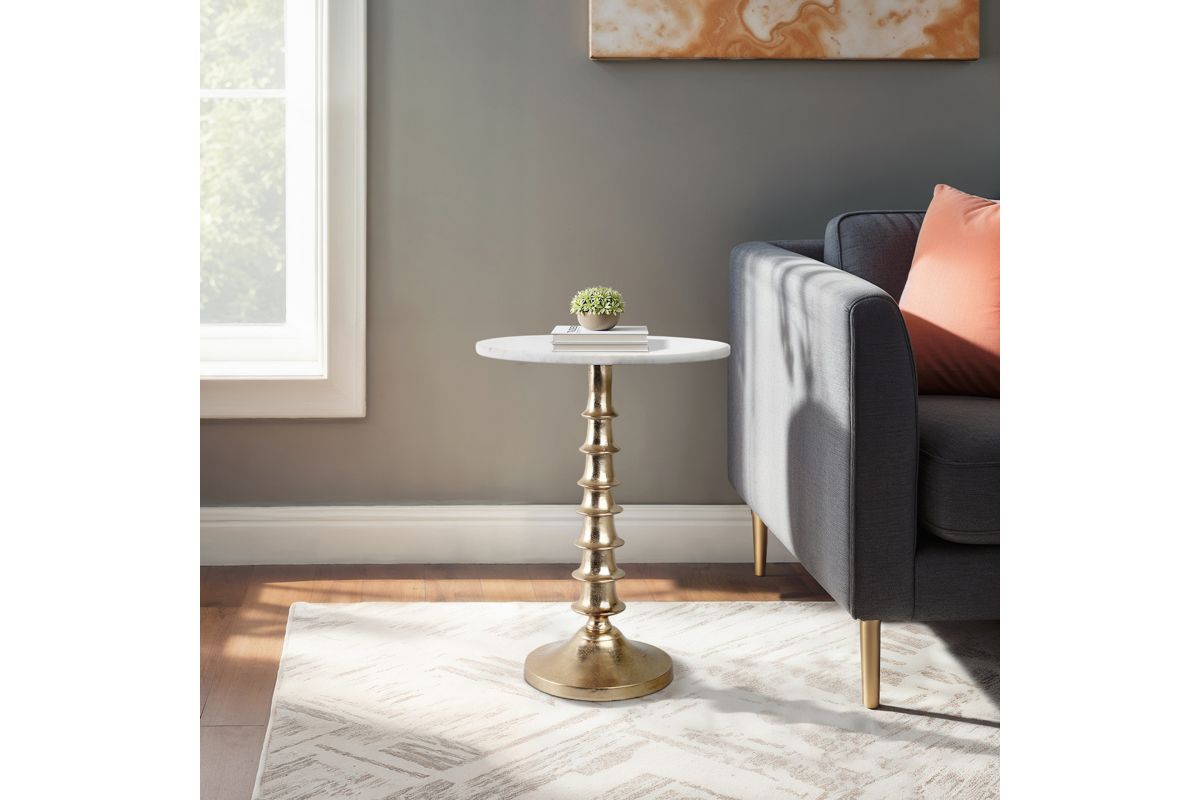 Enhance your home decor with this elegant accent table, seamlessly blending boho and glam styles. Featuring a luxurious white marble top and a chic gold-finished metal base, this side table adds sophistication and functionality to any living room, bedroom, or office. Measuring 16x16x22 inches, it is the perfect size for small spaces while offering ample surface area for decor, drinks, or books. The sturdy metal base ensures stability, while the smooth marble top provides a refined, high-end look. Crafted from durable materials, this table is built to last and resist daily wear. Whether used as a stylish side table, a statement piece, or an accent in an entryway, its timeless design complements a variety of interior styles. Elevate your space with this versatile and eye-catching table, perfect for modern, contemporary, or classic settings. Upgrade your decor with this must-have accent table today.