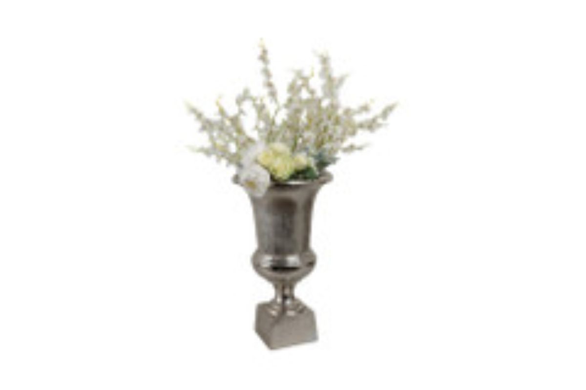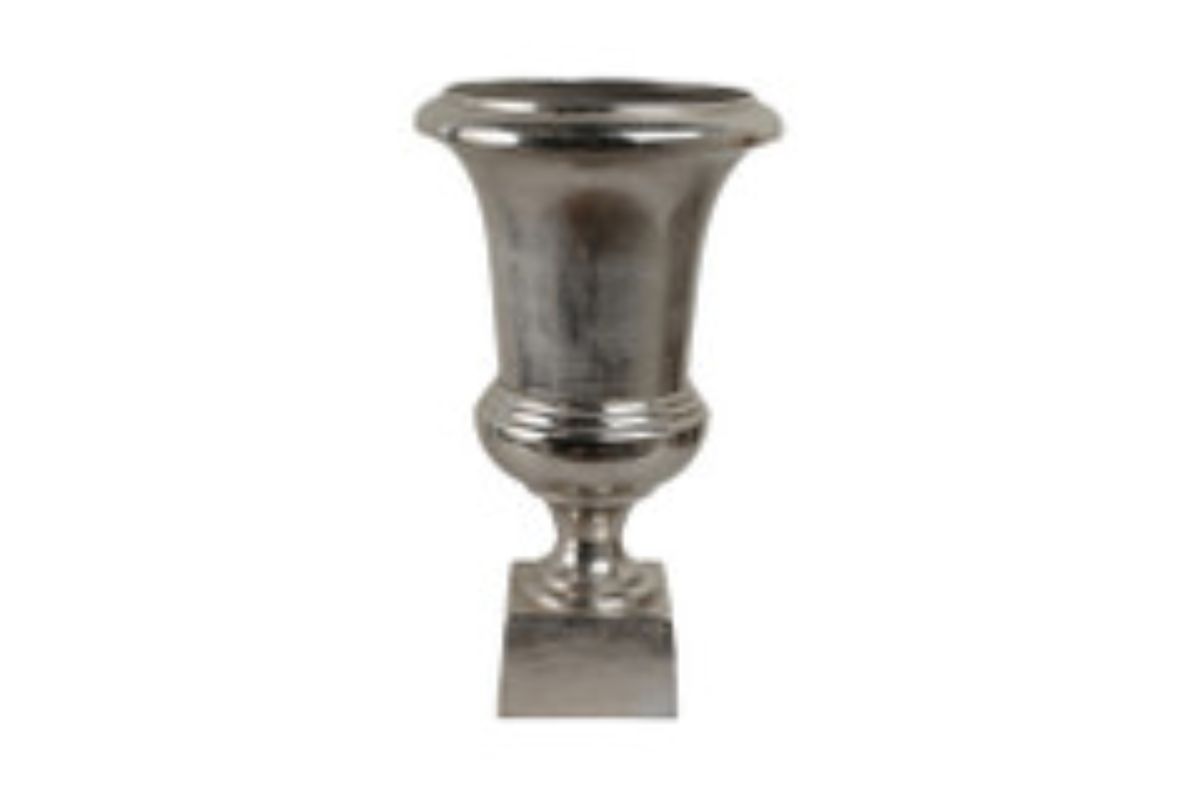 Add a touch of old-world elegance to your decor with the Kenosha Silver Urn. Crafted from sturdy aluminum with a vintage-inspired silver finish, this classic urn features a graceful flared silhouette, rounded body, and square pedestal base. Its timeless form makes it a versatile accent—perfect for floral arrangements, seasonal decor, or as a striking standalone piece on mantels, entry tables, or shelves.