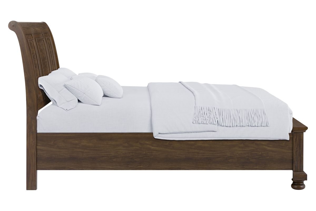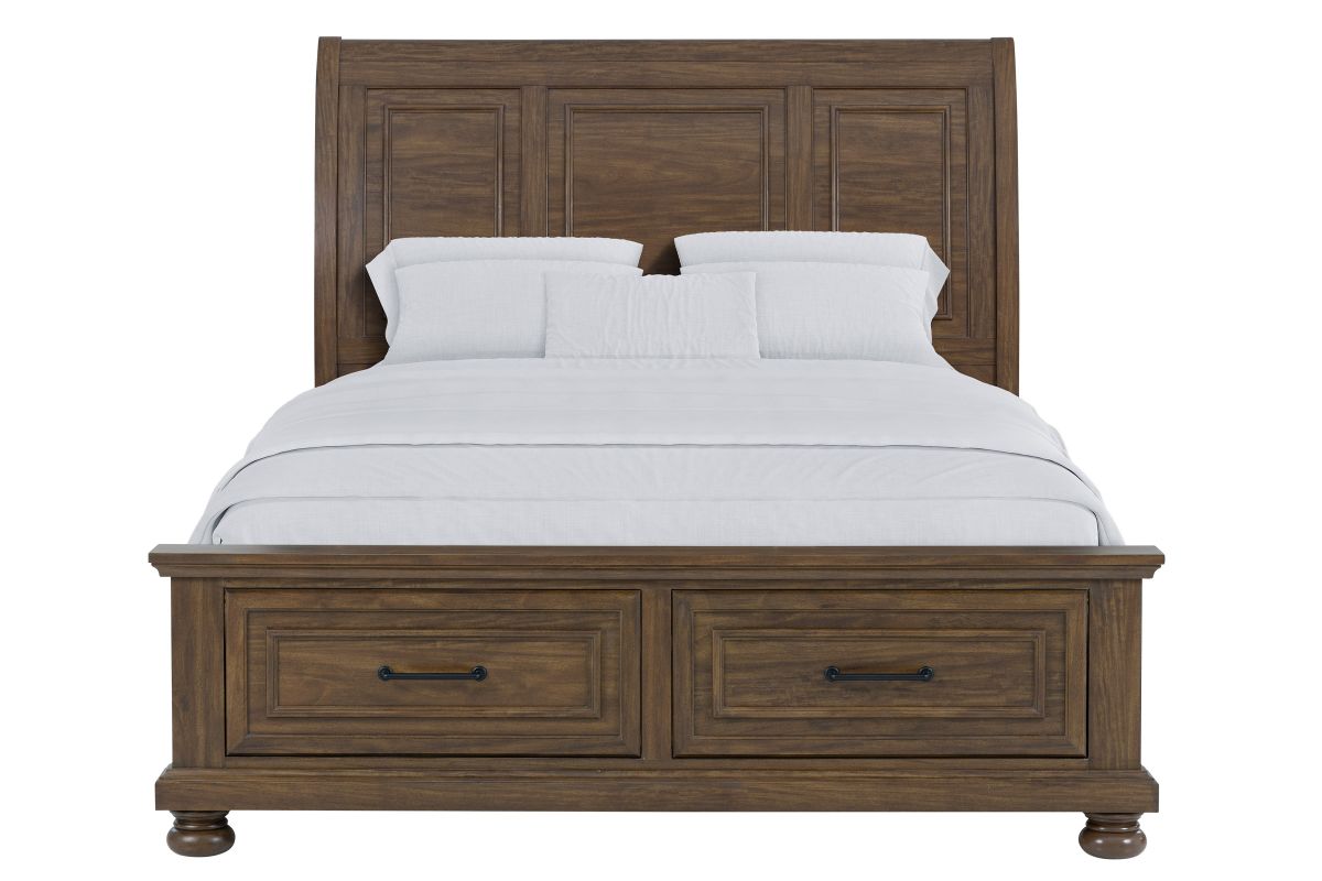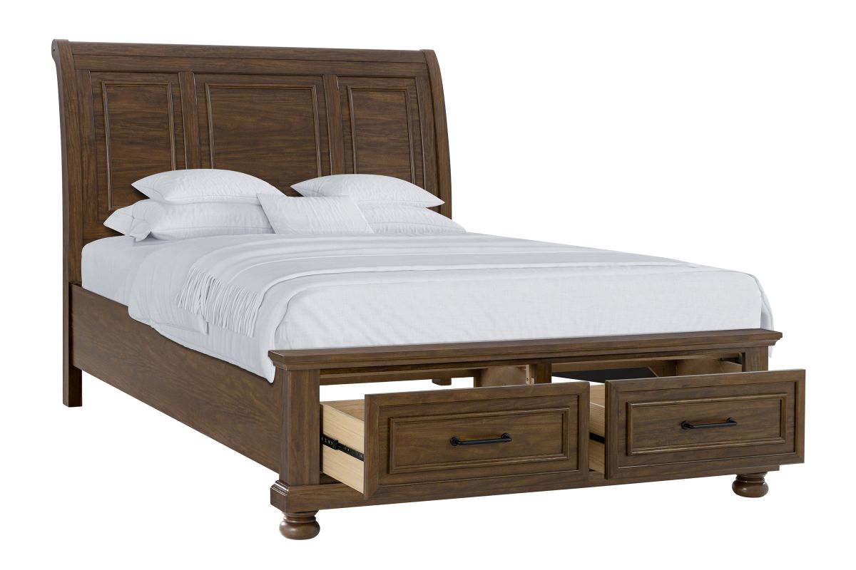 The Arthur Collection has a curved headboard offers a classic, elegant silhouette, with two spacious drawers built into the footboard provide extra storage for linens or seasonal clothing.