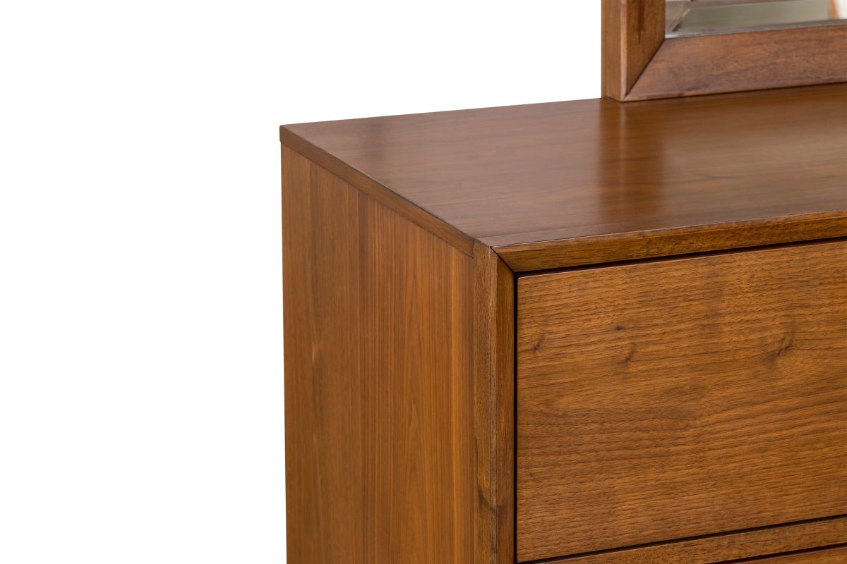 Experience the perfect combination of style and functionality with the Darcy Dresser. This dresser features six spacious drawers and a wood top that can hold your everyday essentials, such as lamps and photos. The minimalist flat-front design and elegant Mid-Century legs give it a contemporary look that blends perfectly with any room deco